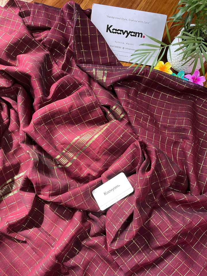 Explore our mul cotton contrast check saree collection.Fabric - 120 count pure mul cotton Saree only included in this set Plain color mul cotton zari woven with golden zari checks all...