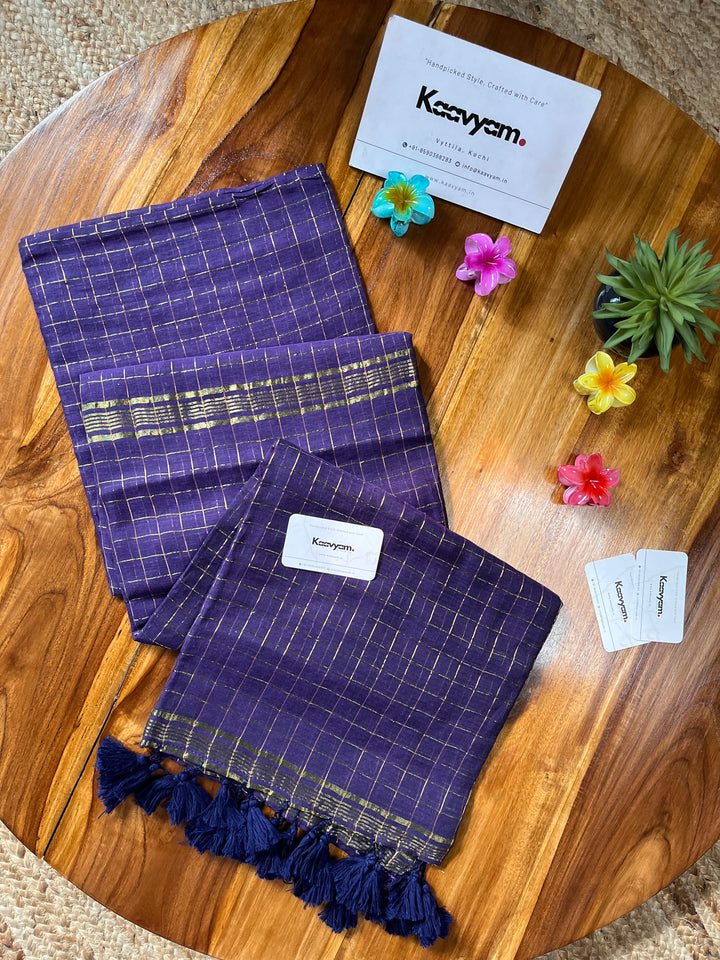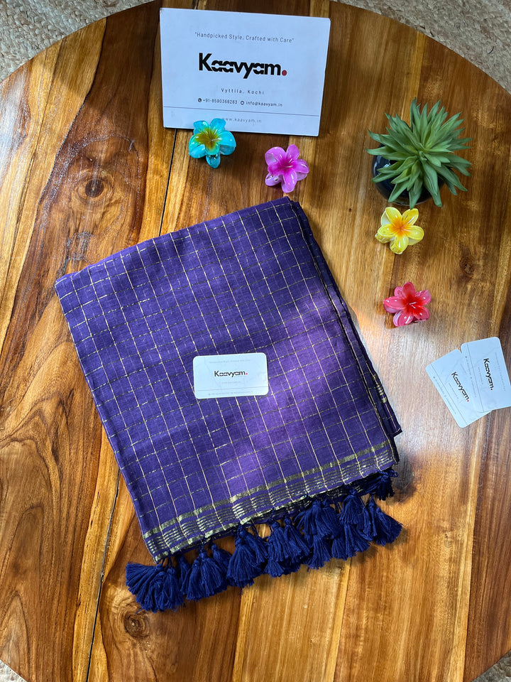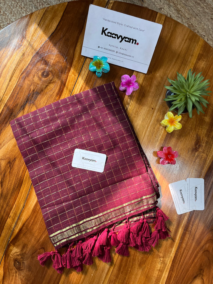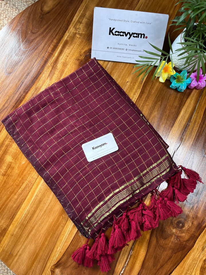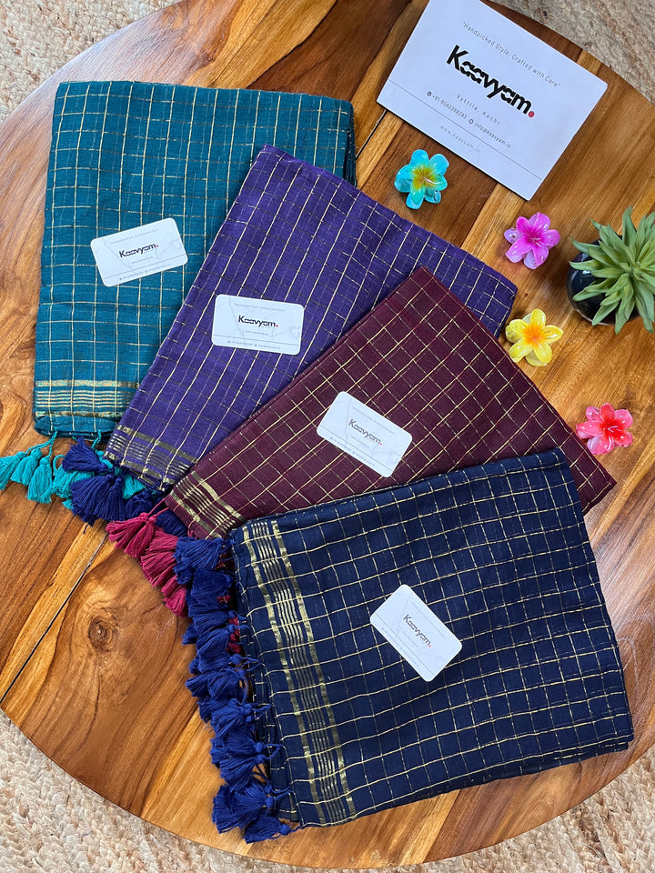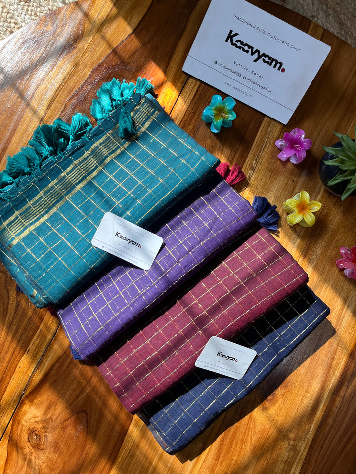 Plain color mul cotton zari woven with golden zari checks all over the saree ended with rich checks pallu handmade tassels