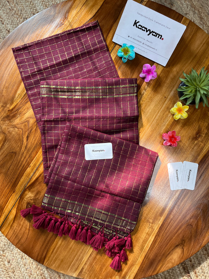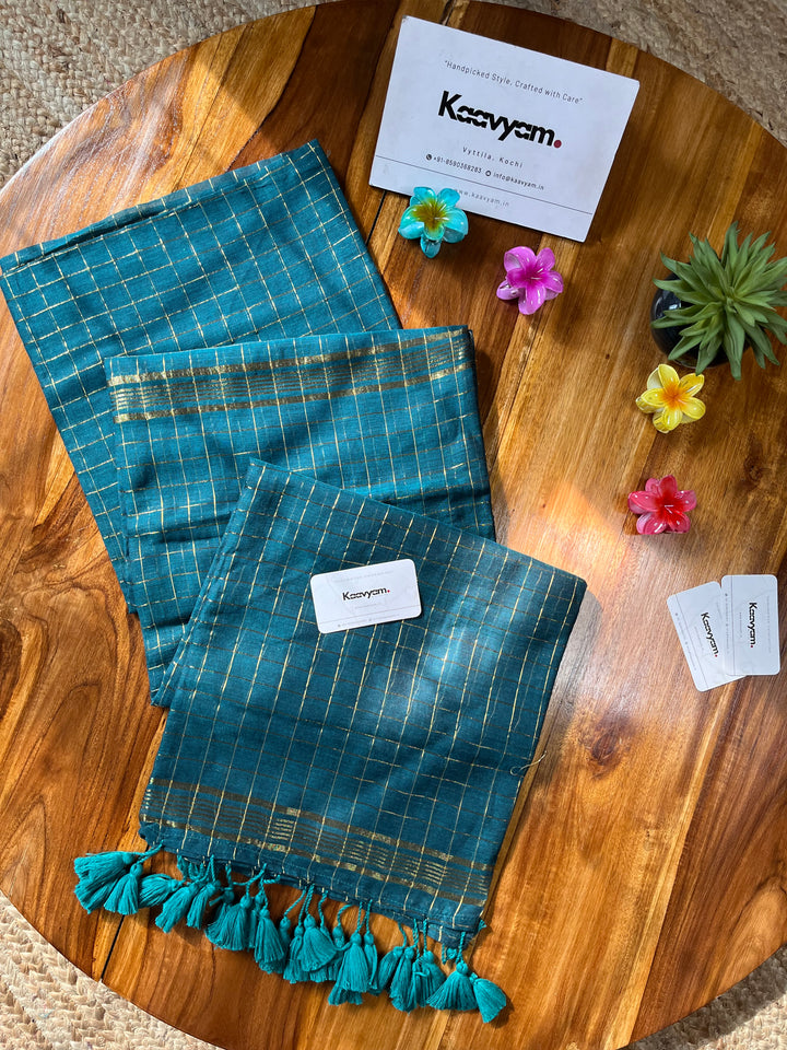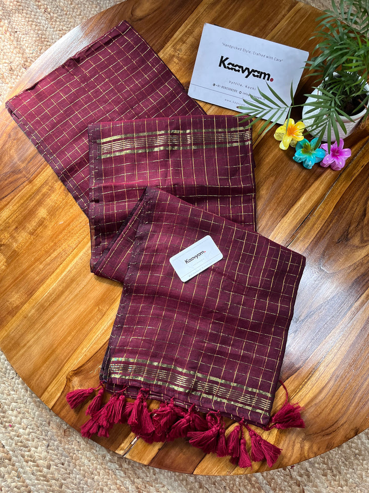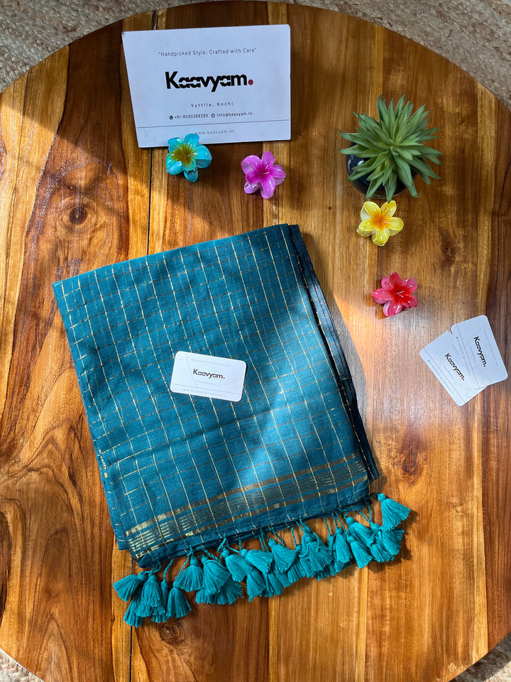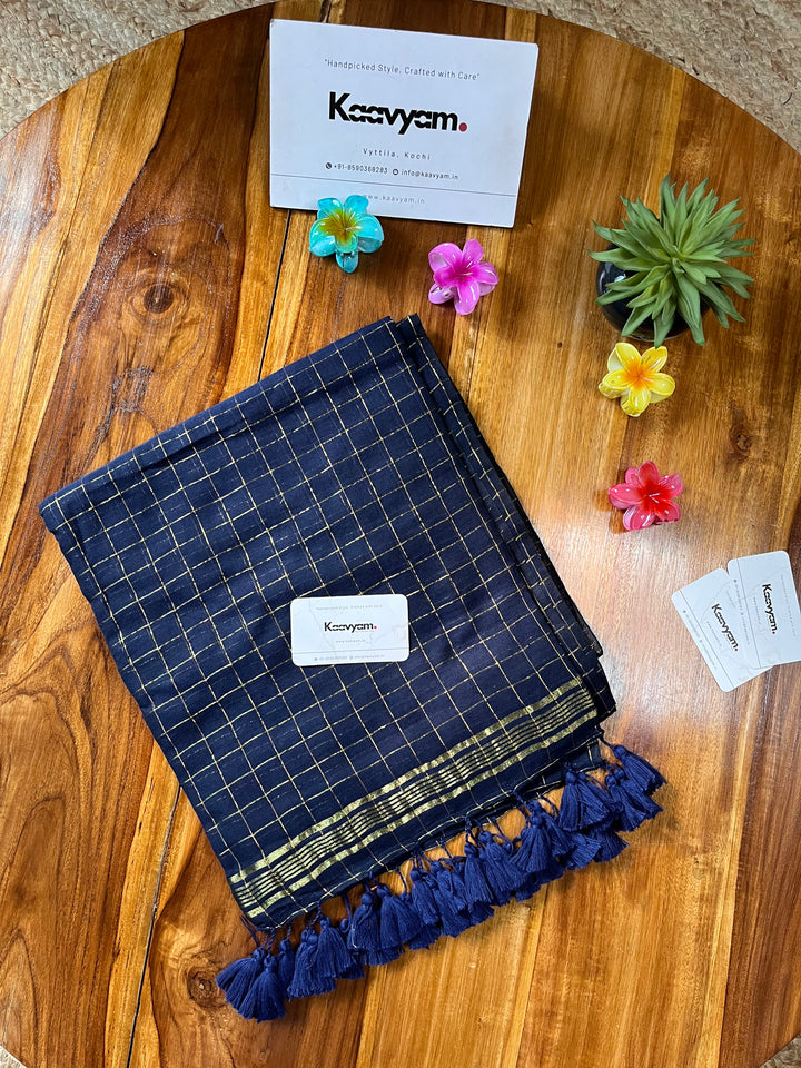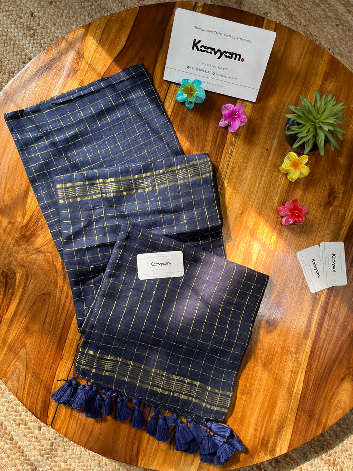 Plain color mul cotton zari woven with golden zari checks all over the saree ended with rich checks pallu handmade tassels