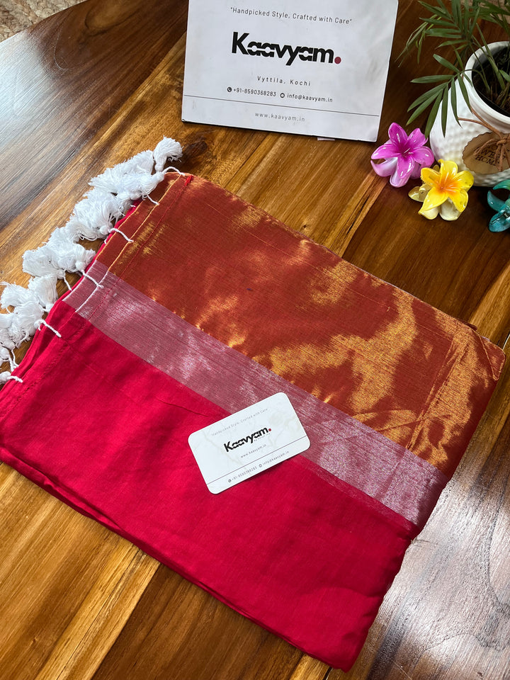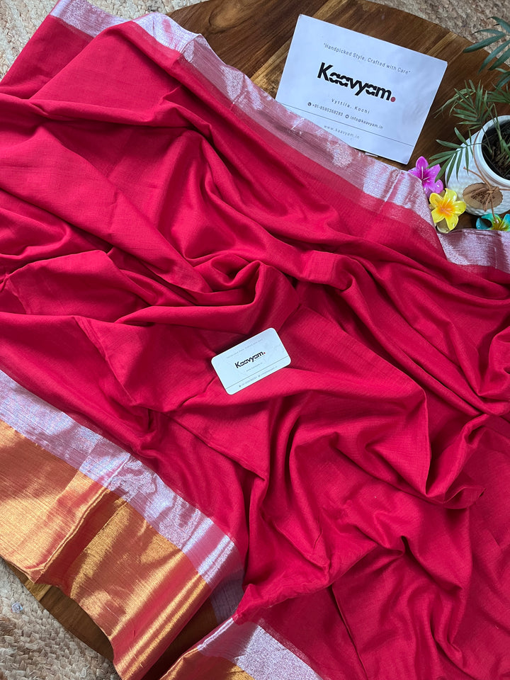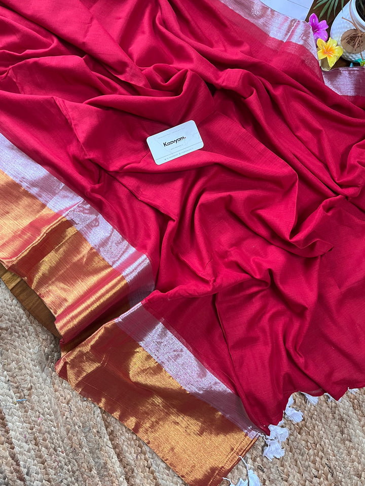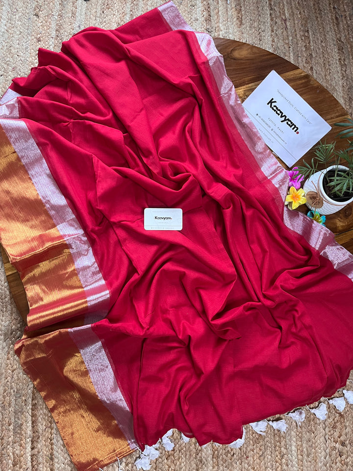 Plain mul cotton saree with gold and silver kasav woven double border all over the saree ended with handmade tassels on pallu.