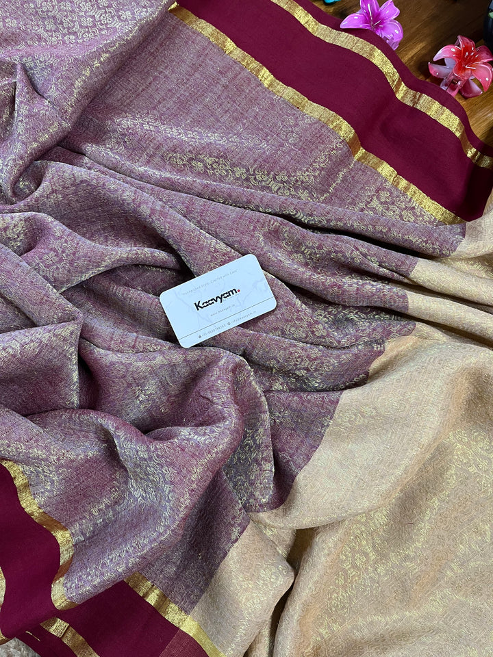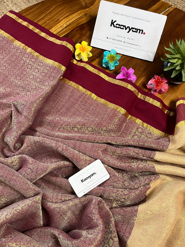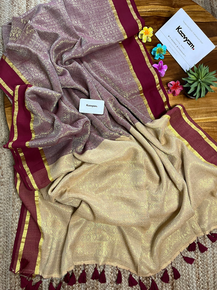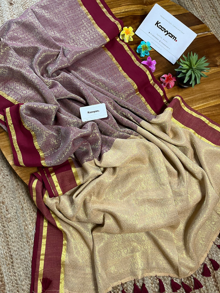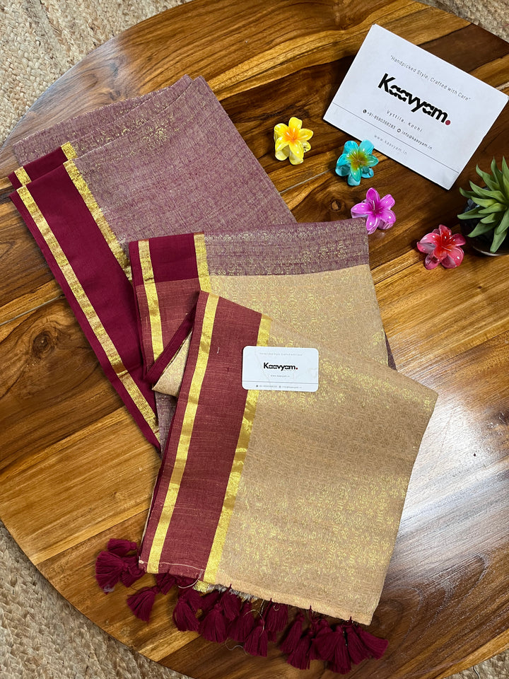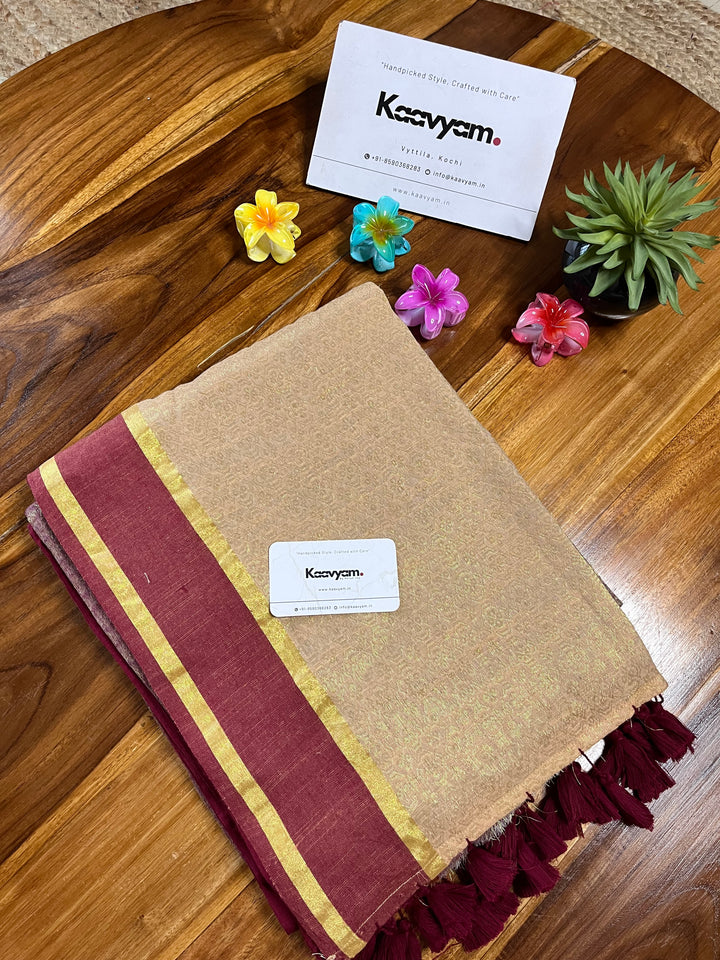 Plain color cotton breathable comfy saree with golden zari woven pattern and contrast border all over the saree ended with tassles on pallu