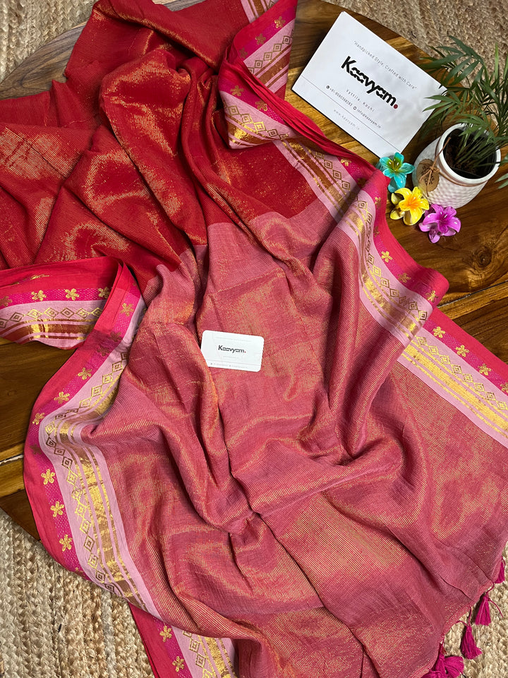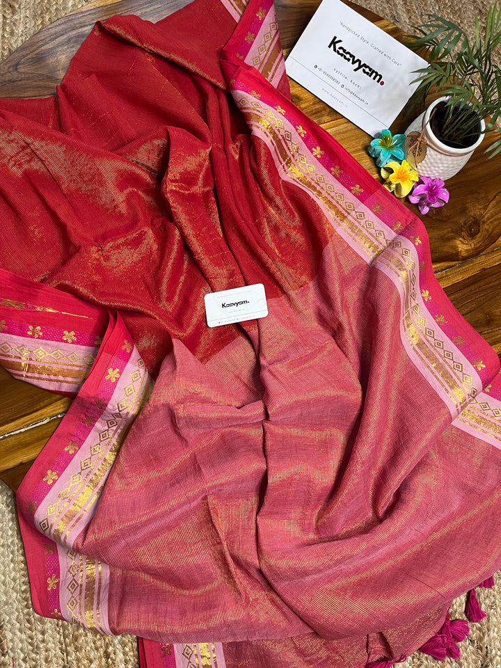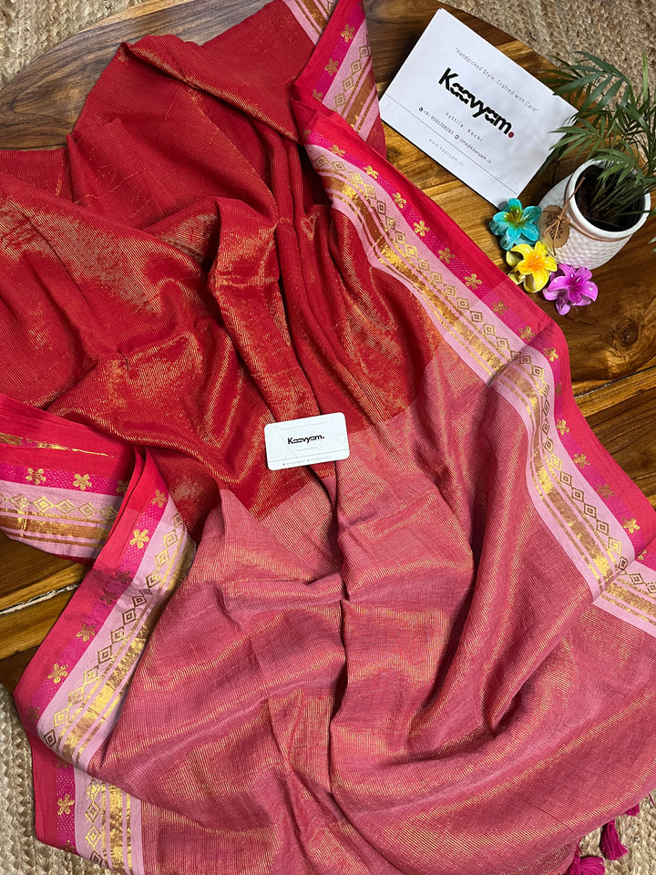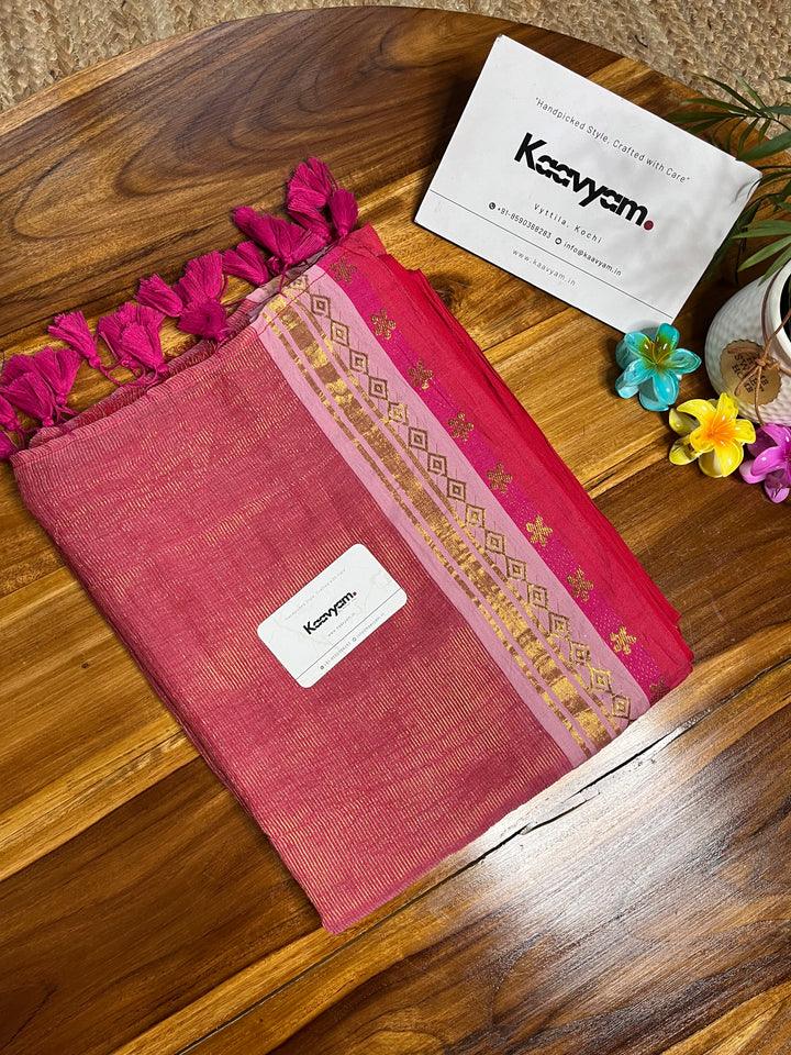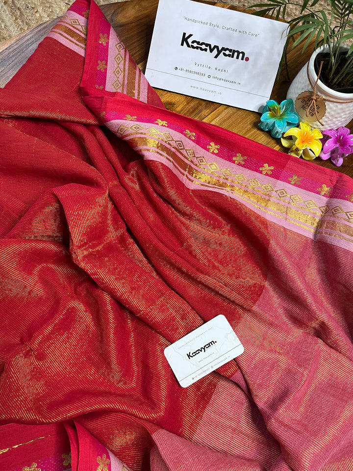 Plain mul cotton saree with golden stripe and contrast double color border all over the saree with contrast pallu finished with tassels