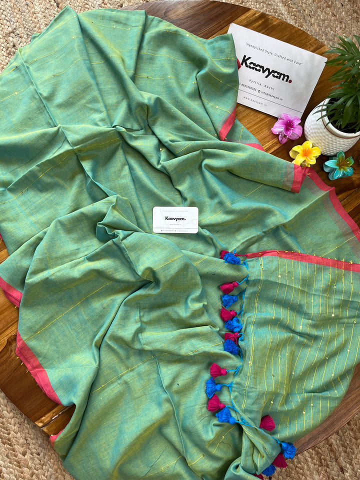 120 count plain soft mul cotton saree with rich sequins stripes all over the saree ended with handmade tassels on pallu