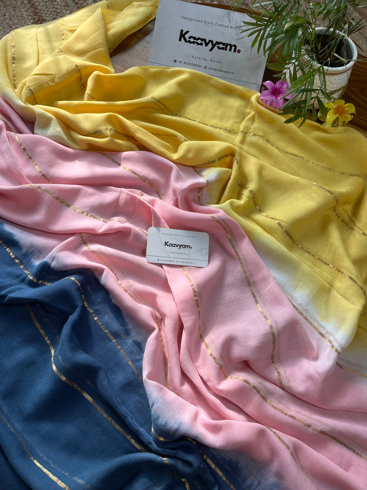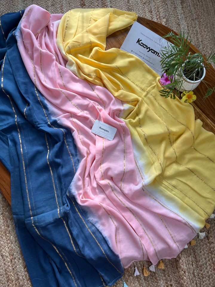 Premium authentic mul cotton saree with tri color dyed saree comes with golden zari woven stripes all over the saree ended with handmade tassels on pallu.