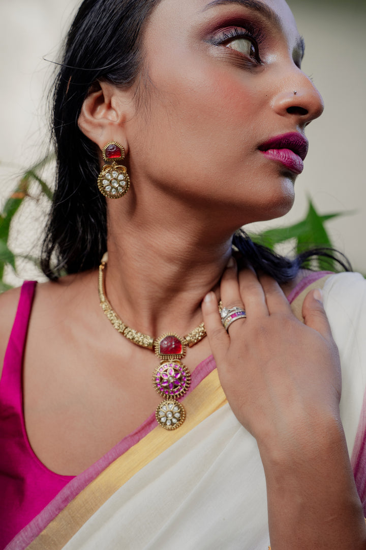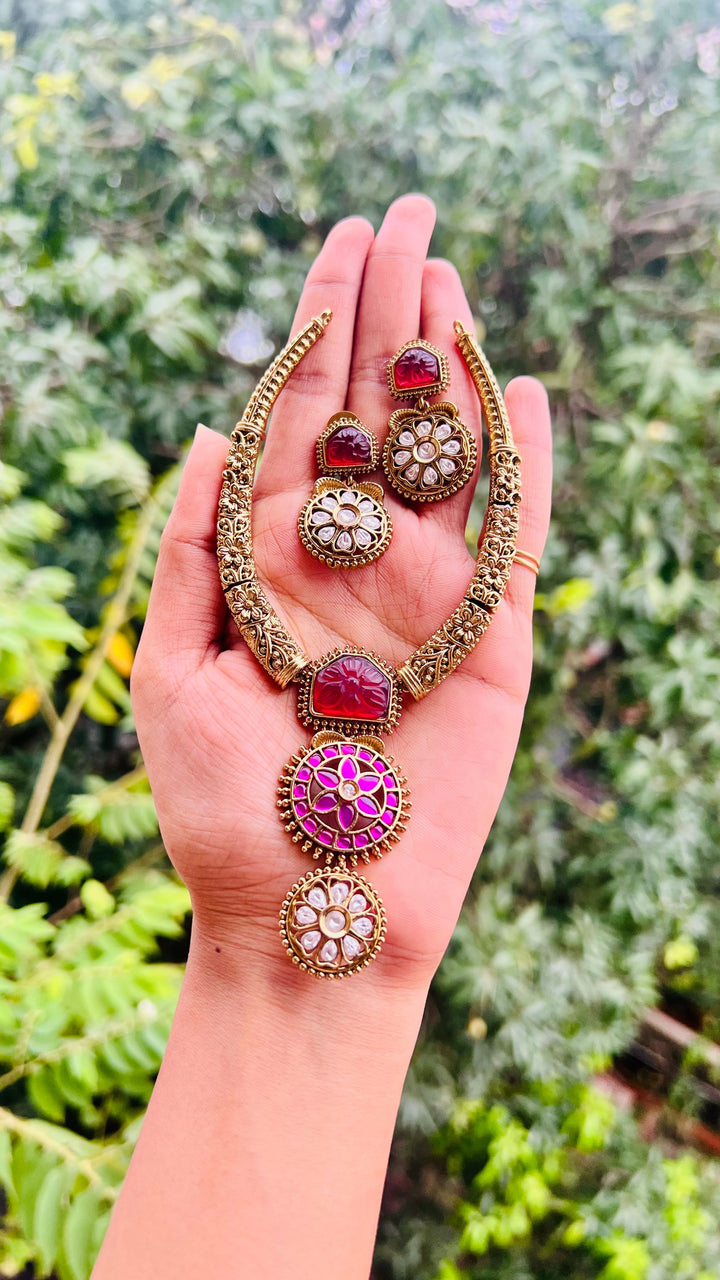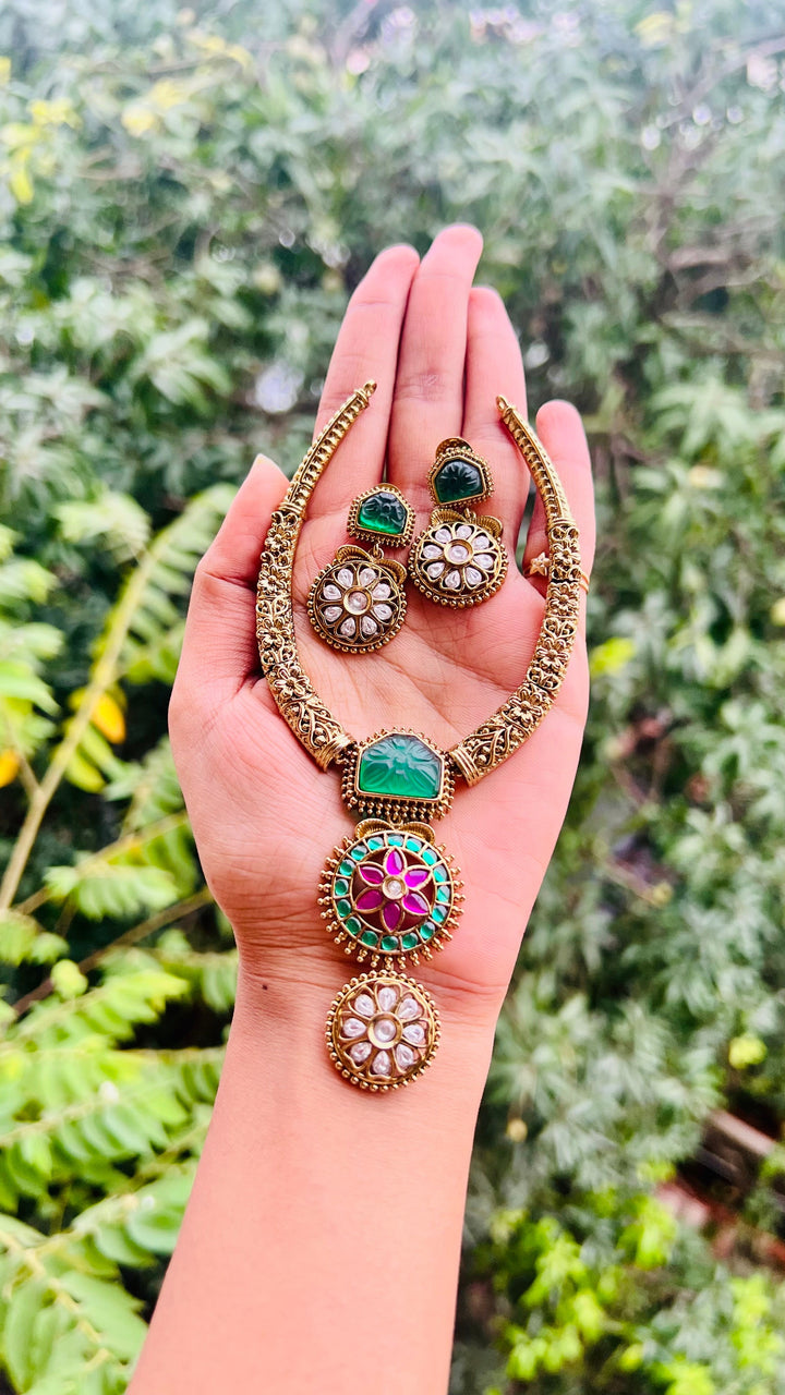 Antique Stone Hasli Product Details:✔ Antique Hasli✔ Includes: Neckpiece & earrings ✔ Craftsmanship: Premium south Indians style finished jewellery ✔ Care: Avoid contact with water & perfume ✔ Actual product...