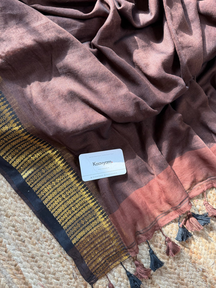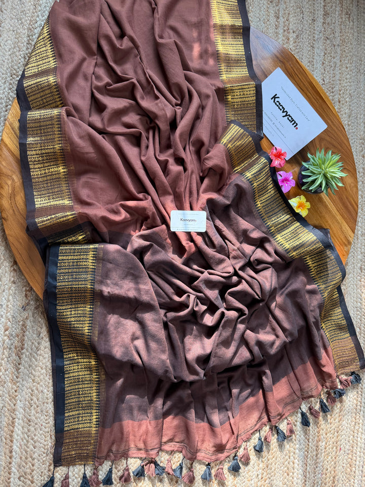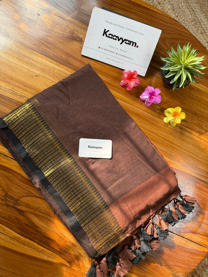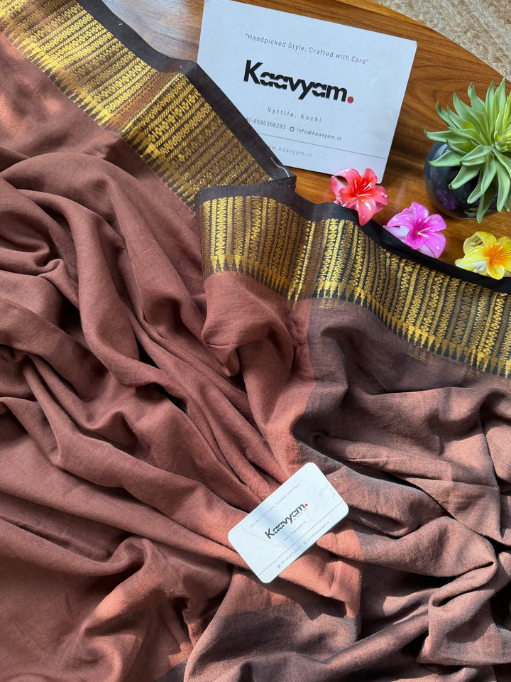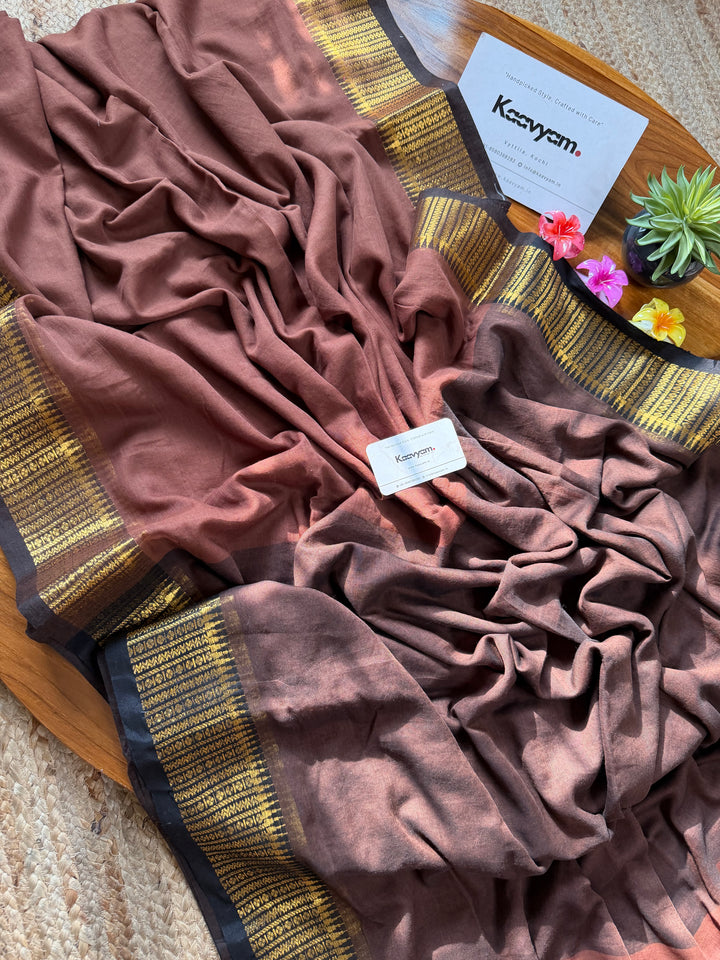 Plain mul cotton saree with golden zari woven rich border all over the saree finished with contrast pallu with handmade tassels.