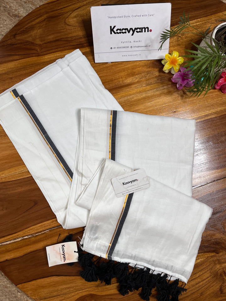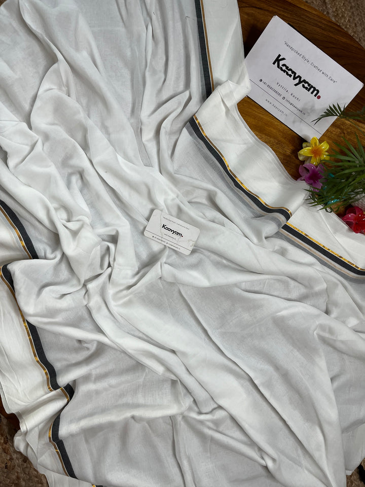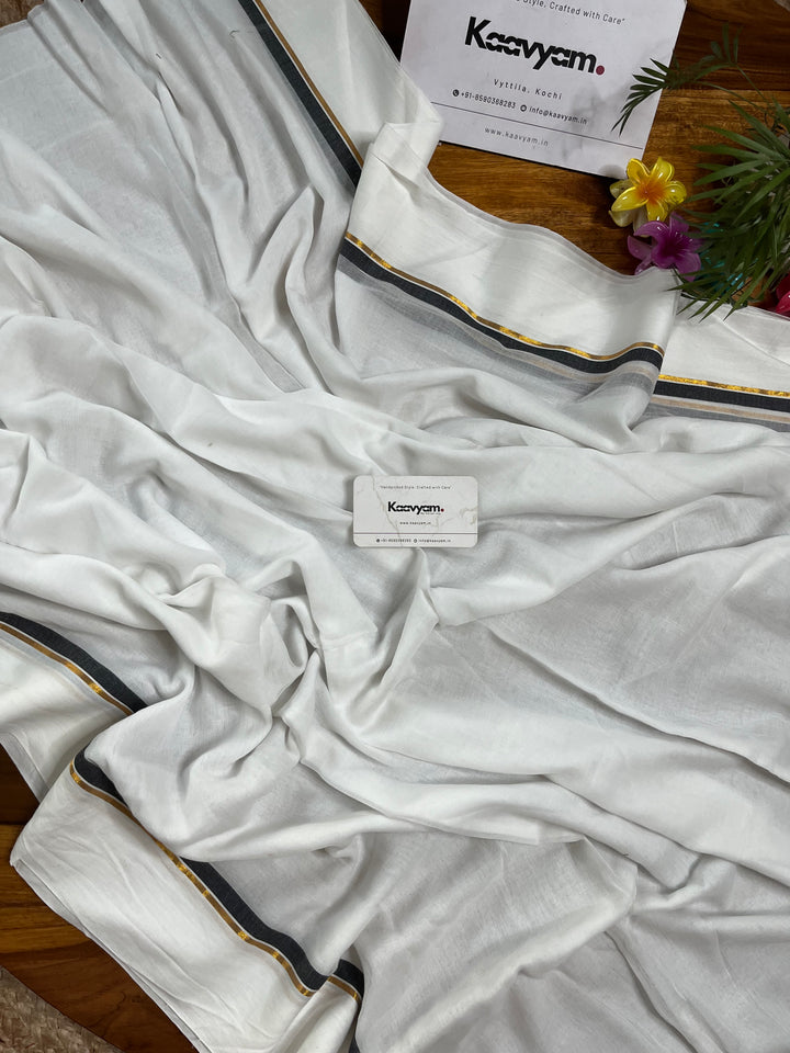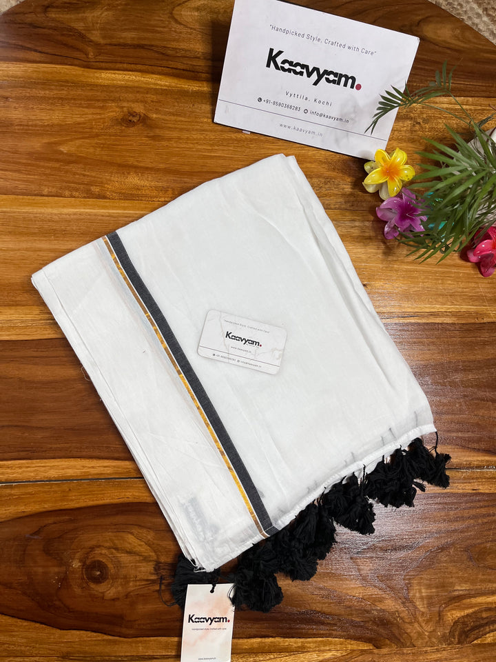 White plain mul cotton saree with black kara & kasav border all over the saree ended with handmade tassels on pallu.