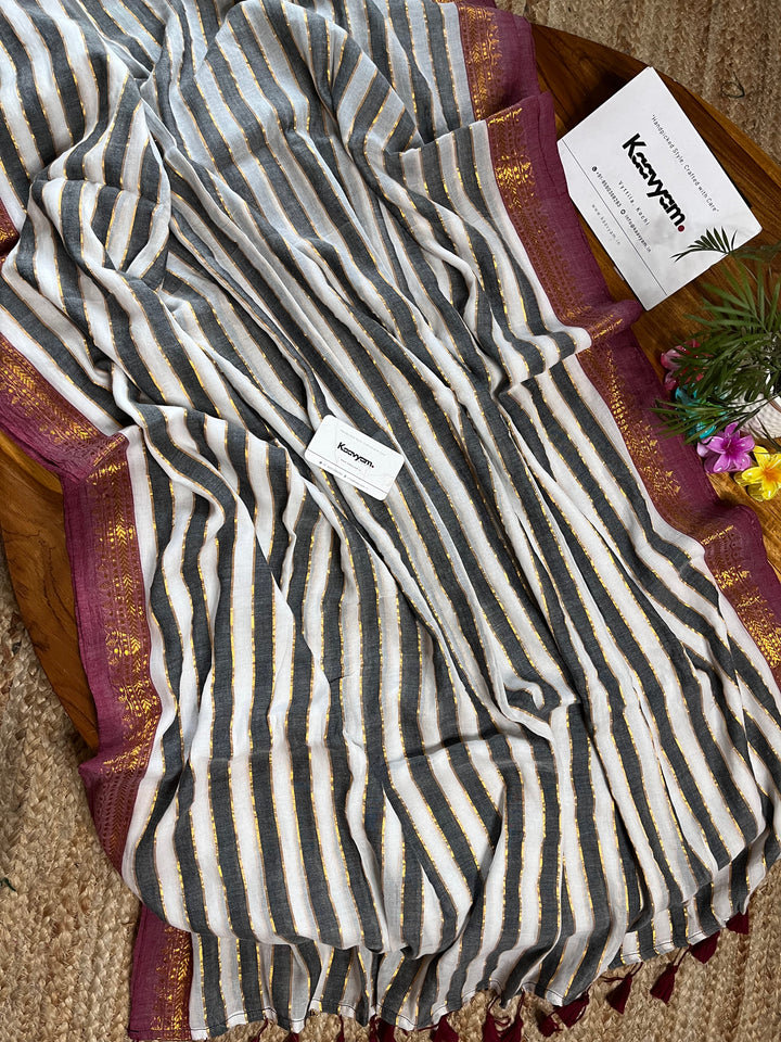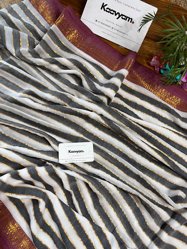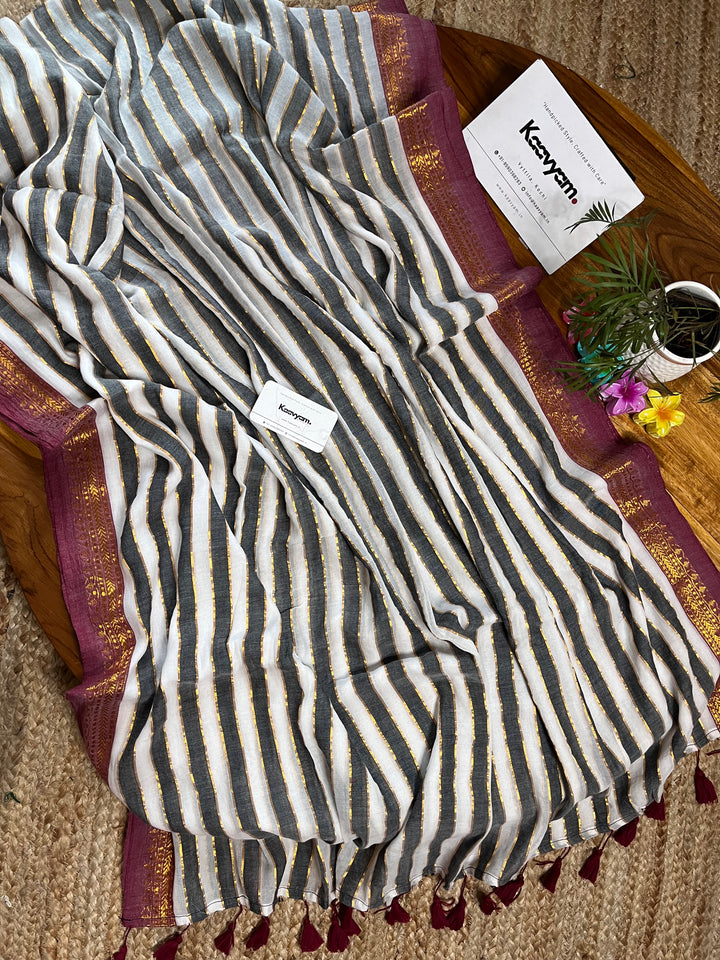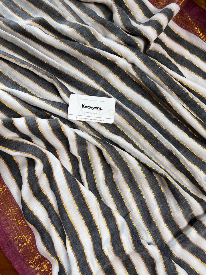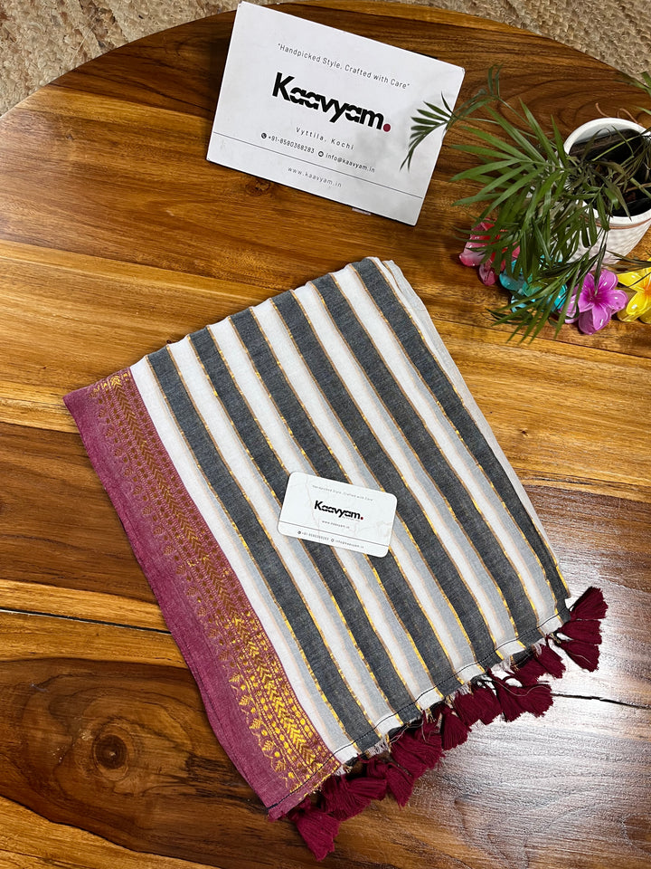 Black and white stripes along with golden zari and maroon jacquard border all over the border finished with handmade tassles.