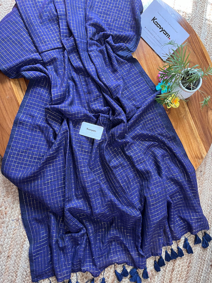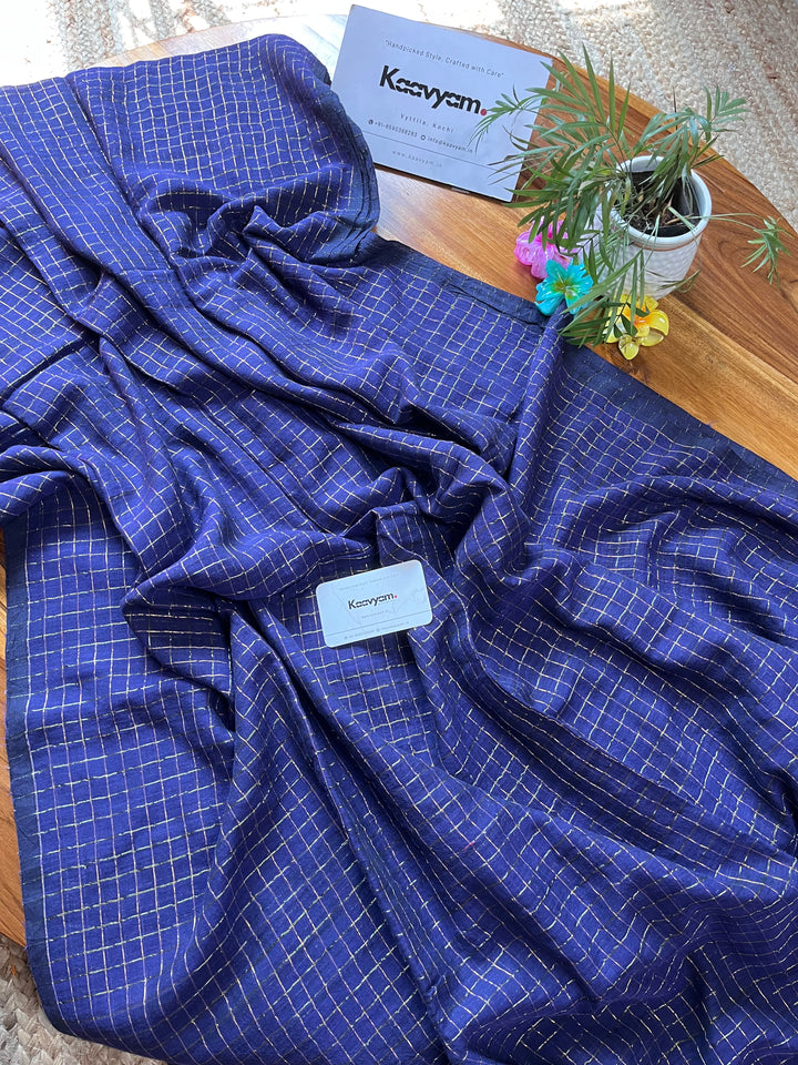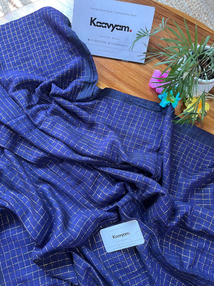 Pure cotton mul mul cotton blue saree with golden jari woven checks all over the saree ended with handmade tassels on pallu
