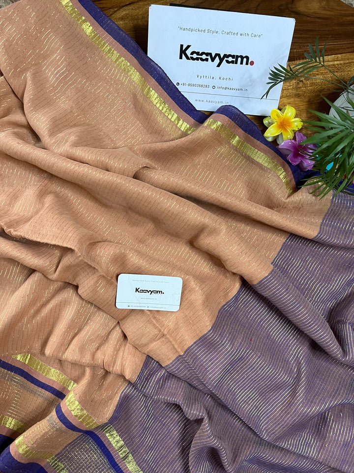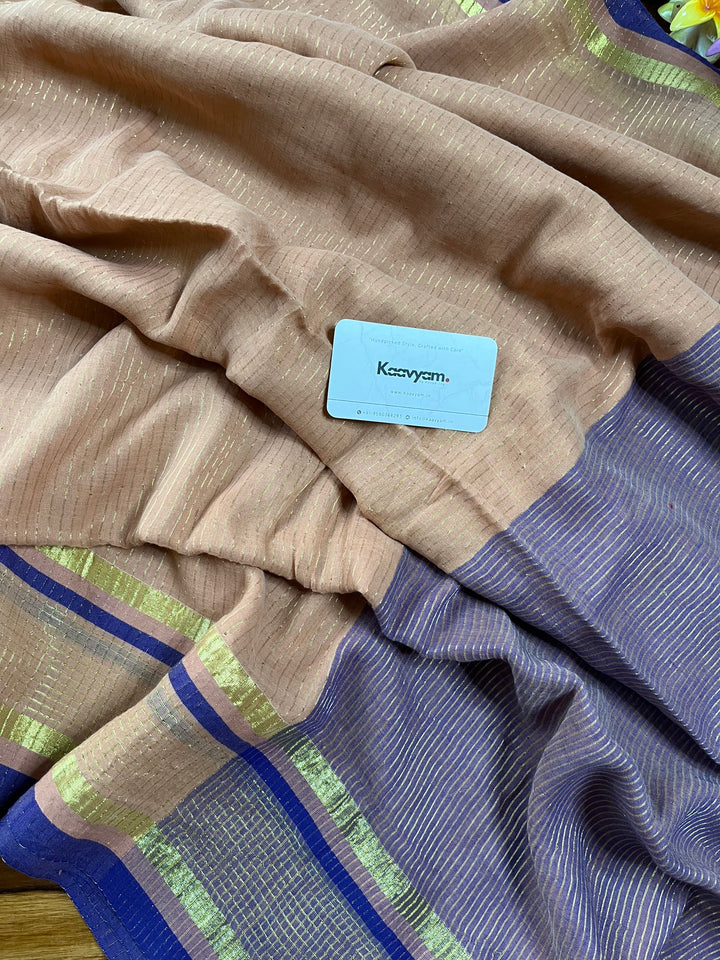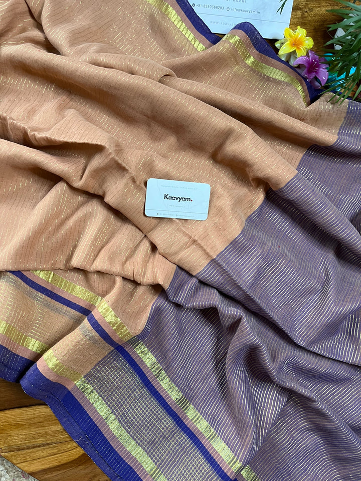 Pure cotton mul mul golden zari woven check saree with blue kara and kasav contrast border all over the saree ended with handmade tassels on pallu