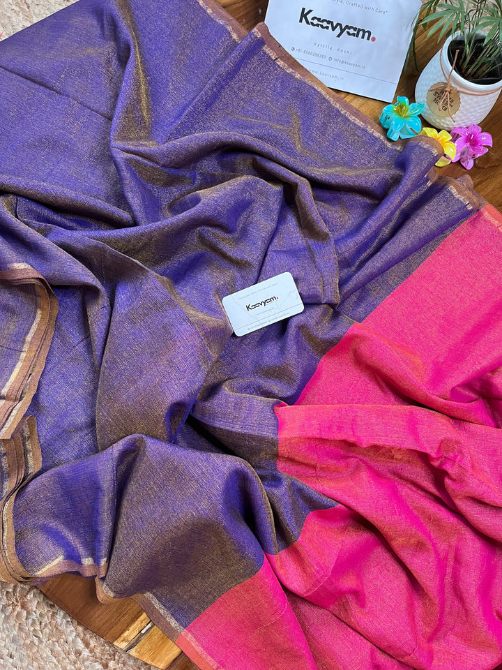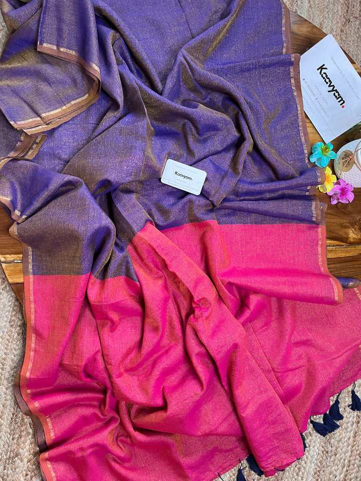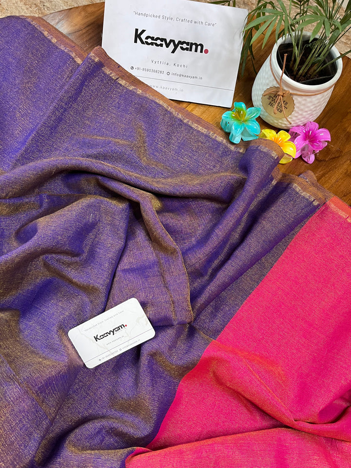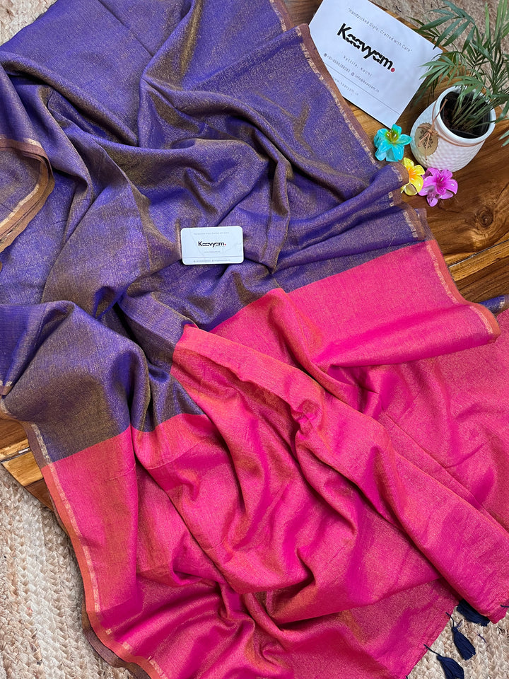 Plain cotton zari woven saree withthin border all over the saree ended with contrast pallu ended with handmade tassels on pallu.