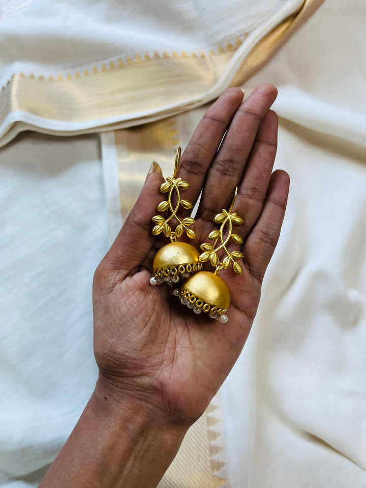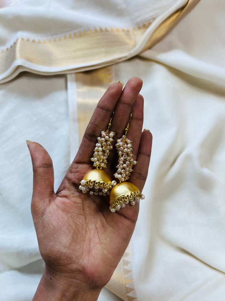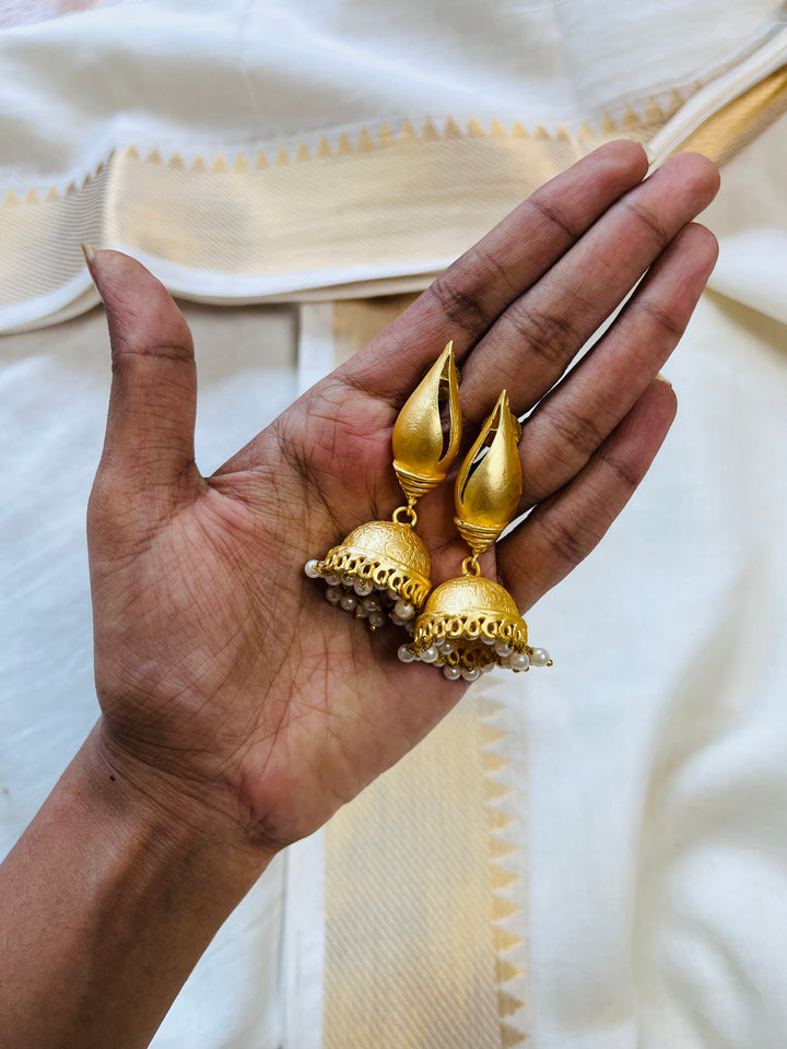 Evergreen jumukkas are always stylish and elegant! Metal - Brass Sea shell style stud with pearl jumukka hanging Size - 60mm Matte finish Weight - 19g Actual pics shared, no changes...