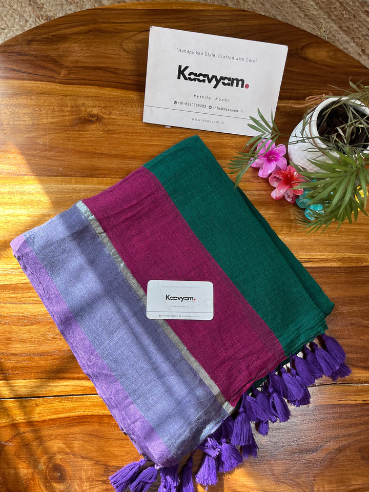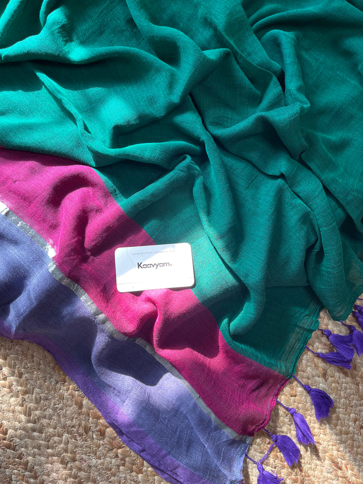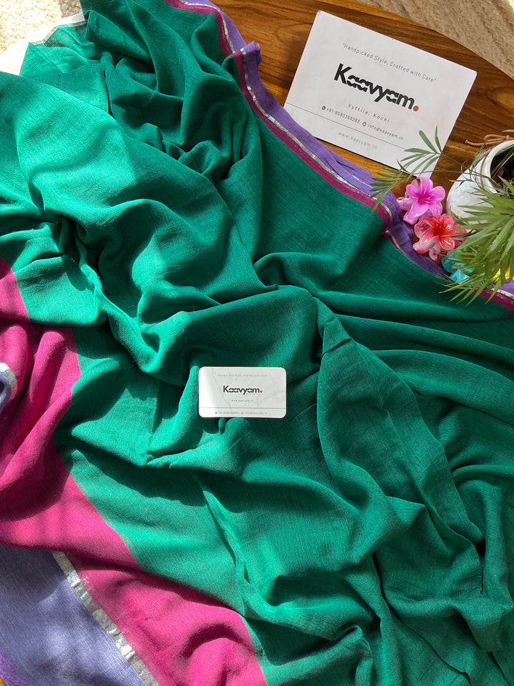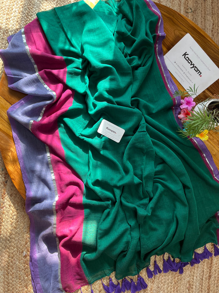 Plain mul cotton saree saree with double color broad border and silver zari string border all over the saree ended with handmade tassels on pallu.