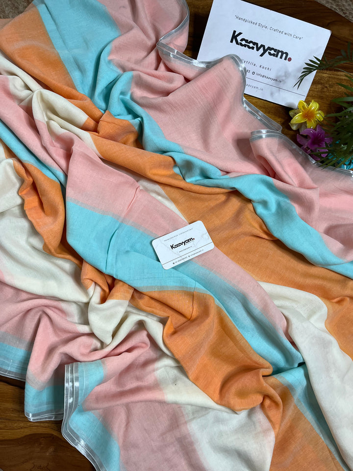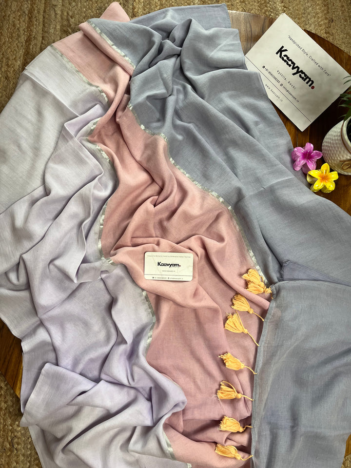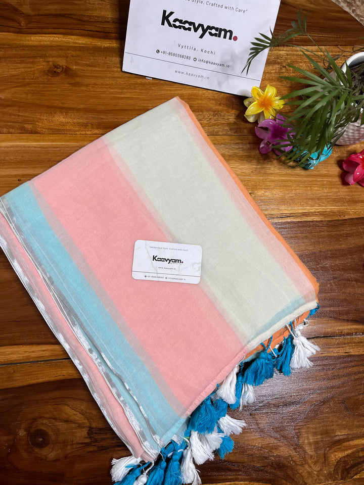 Pure mul cotton pastel color combination sarees with gold & silver jari woven stripes all over the saree ended with handmade tassels on pallu.