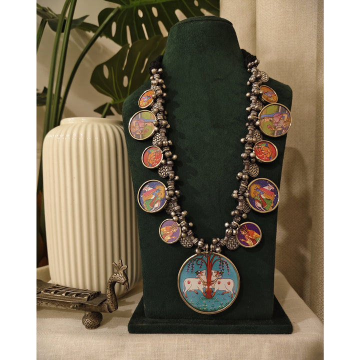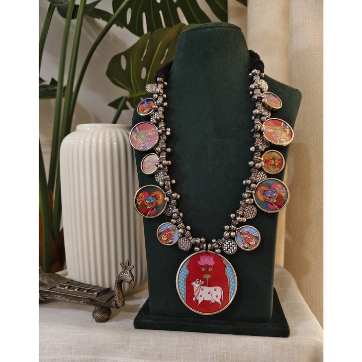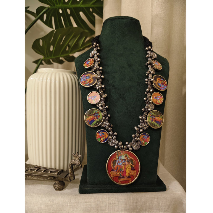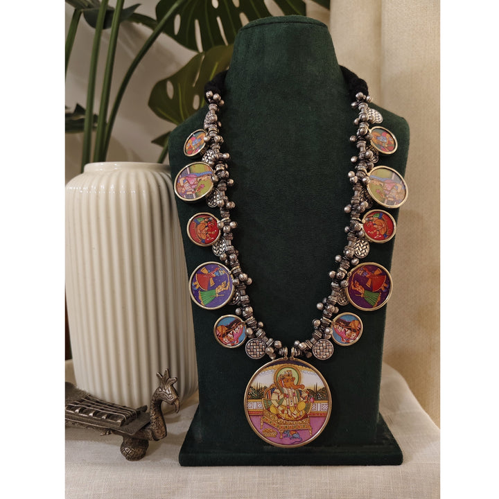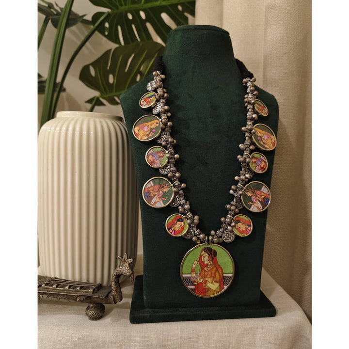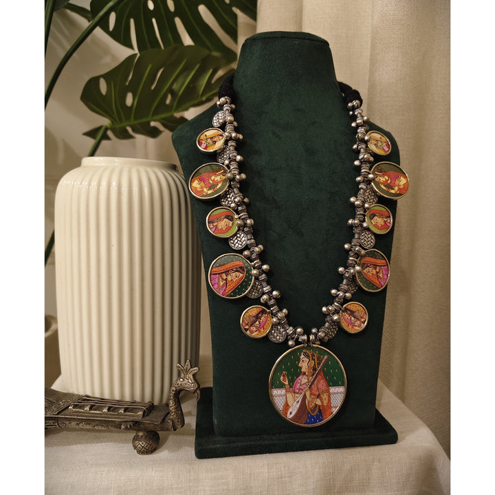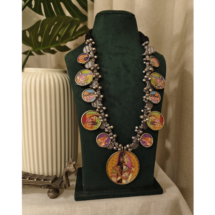 Coin Painted Long Necklace Product Details:✔ silver design made in brass ✔ Includes: Neckpiece ✔ Craftsmanship: Premium Indian jewellery ✔ Care: Avoid contact with water & perfume ✔ Actual product images shared. Colors may...