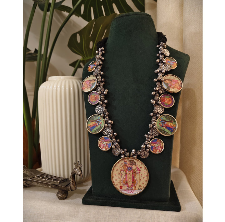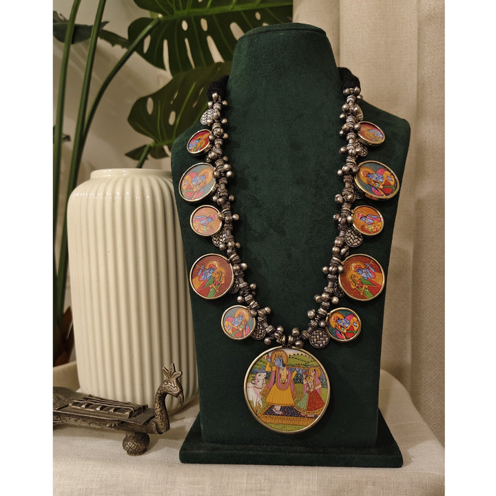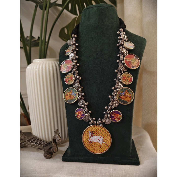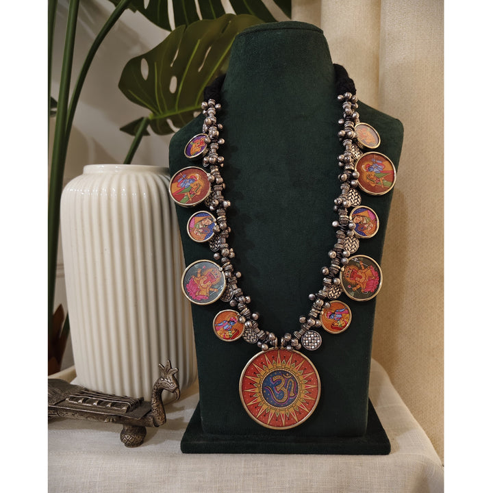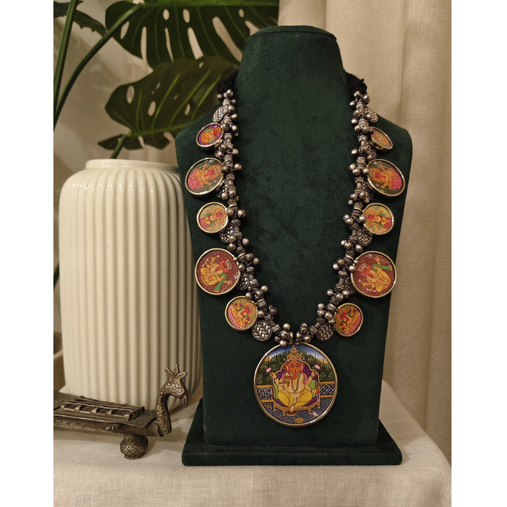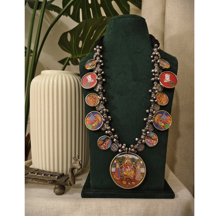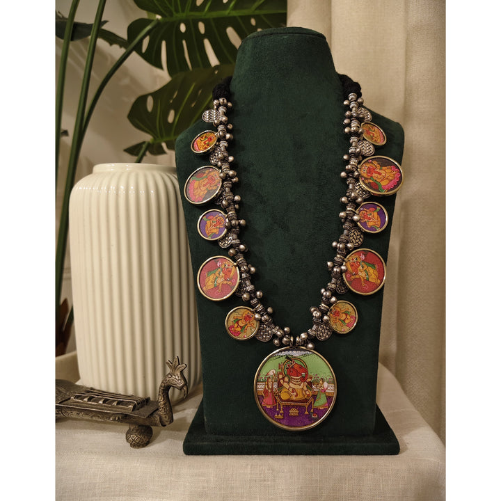 Coin Painted Long Necklace Product Details:✔ silver design made in brass ✔ Includes: Neckpiece ✔ Craftsmanship: Premium Indian jewellery ✔ Care: Avoid contact with water & perfume ✔ Actual product images shared. Colors may...