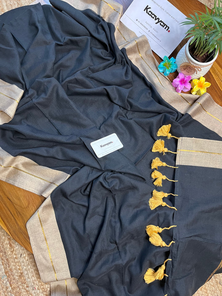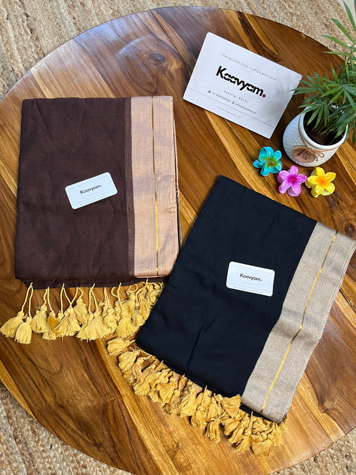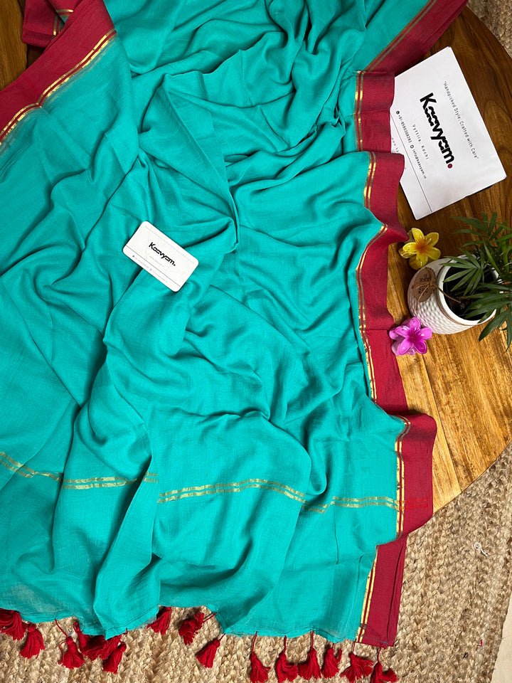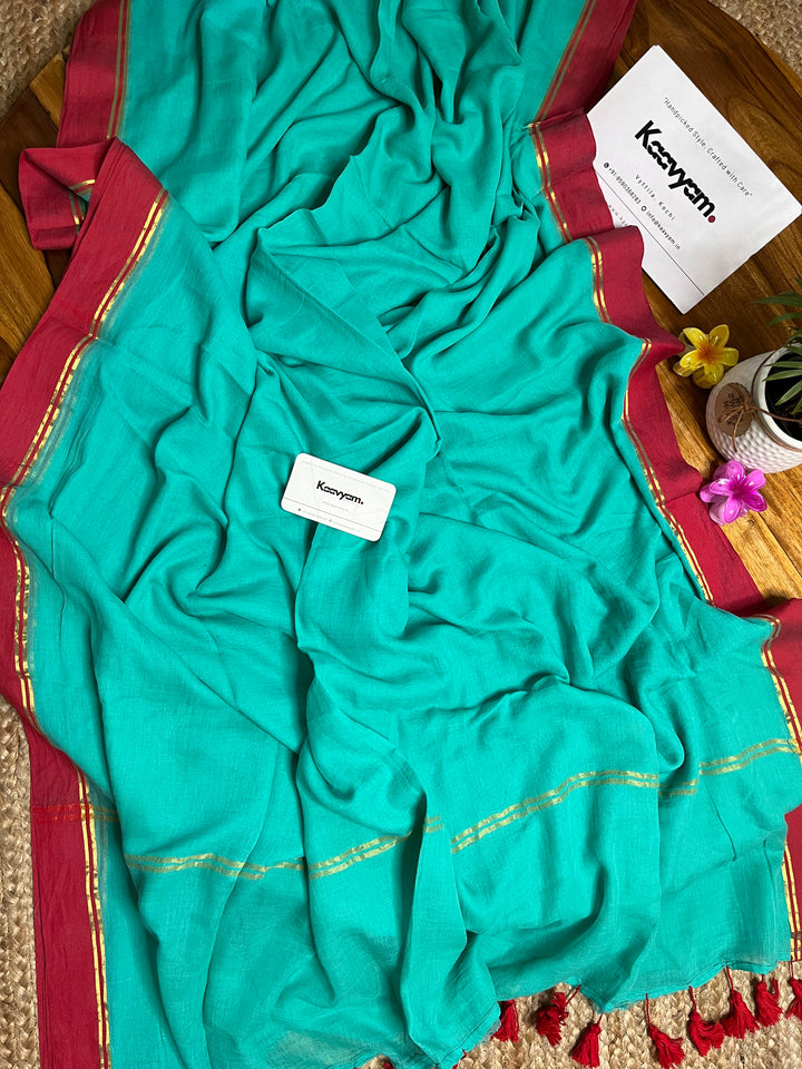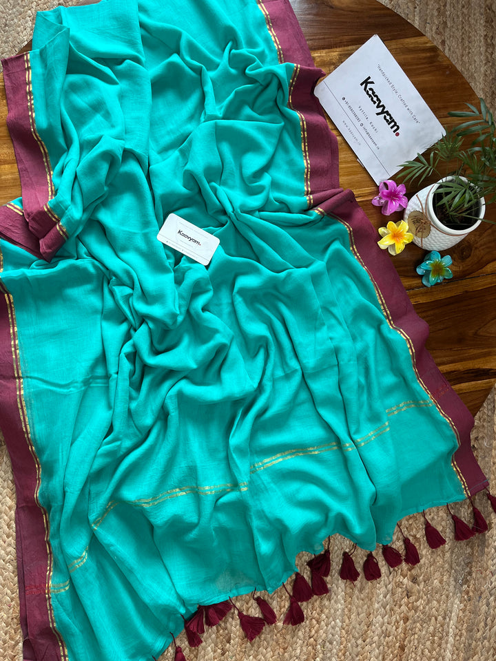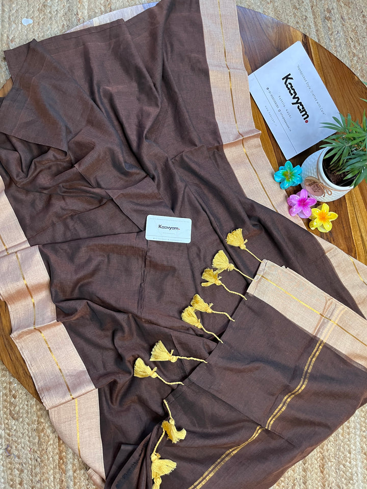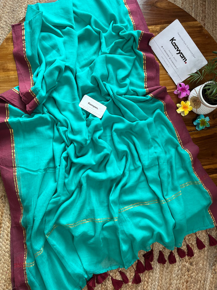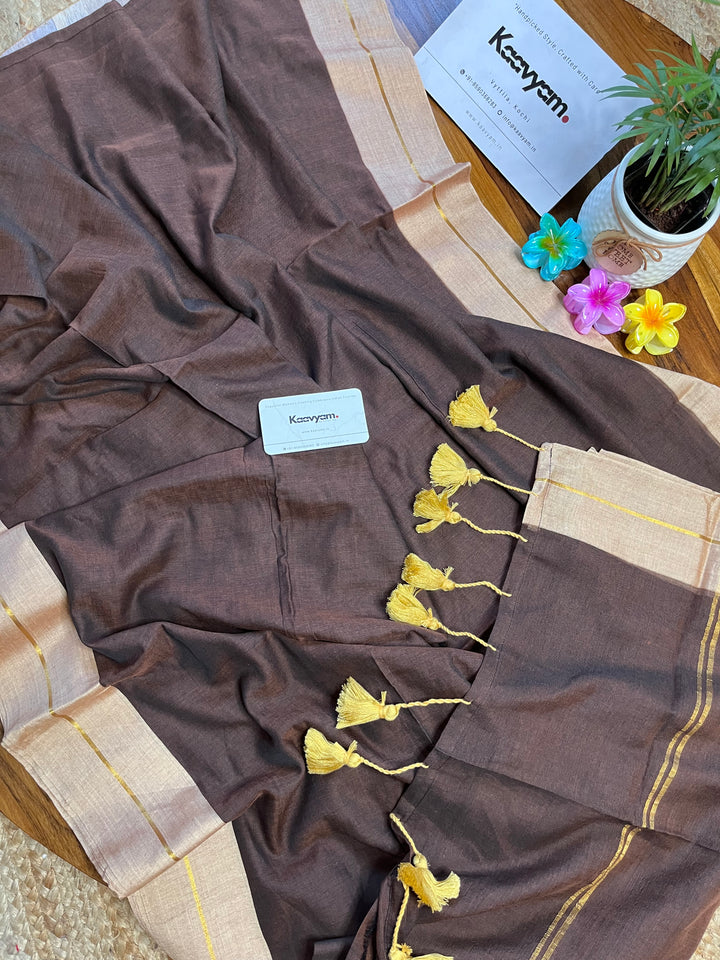 Premium authentic plain mul cotton saree with contrast border along with golden zari woven string border all over the saree ended with handmade tassels on pallu.