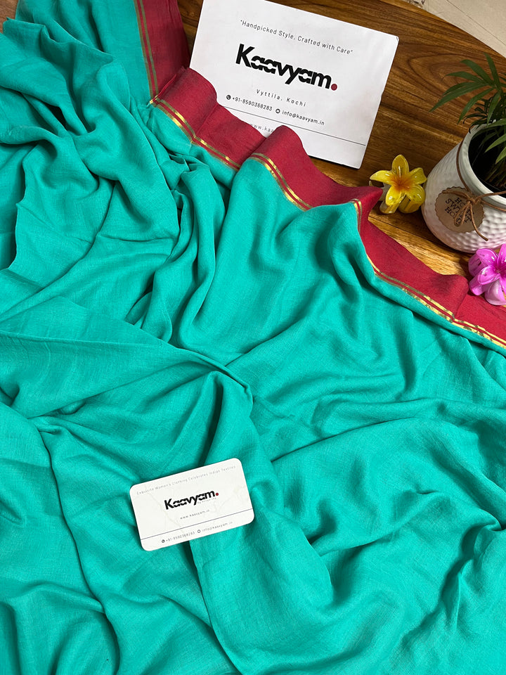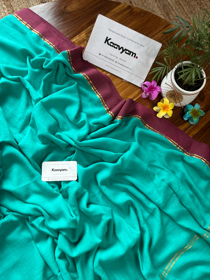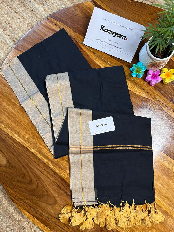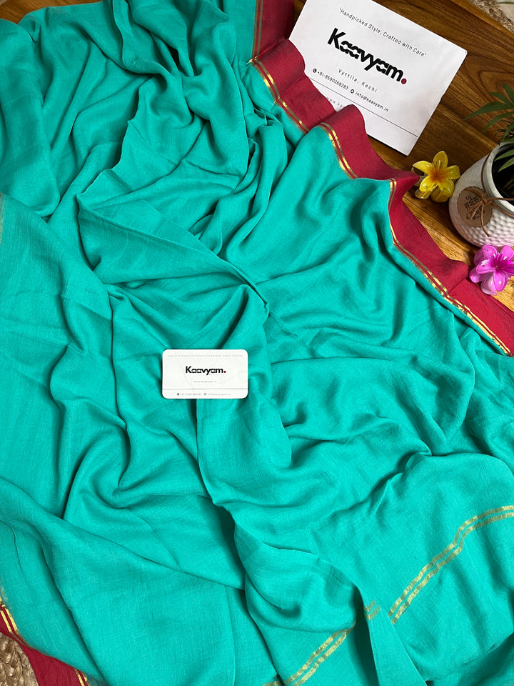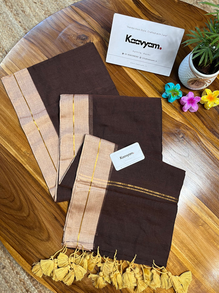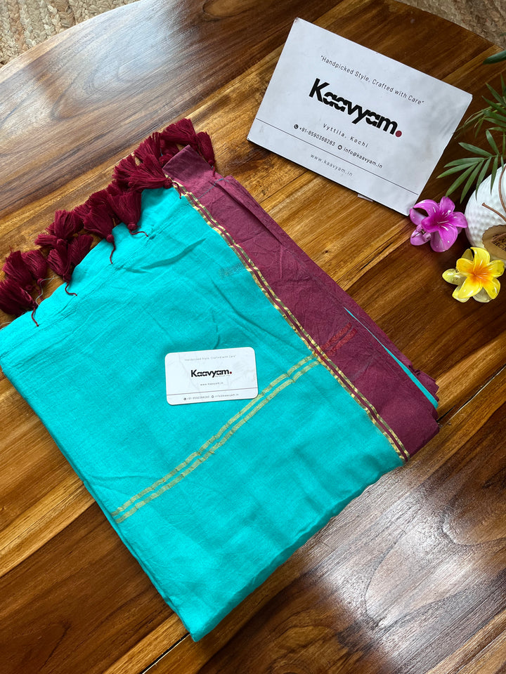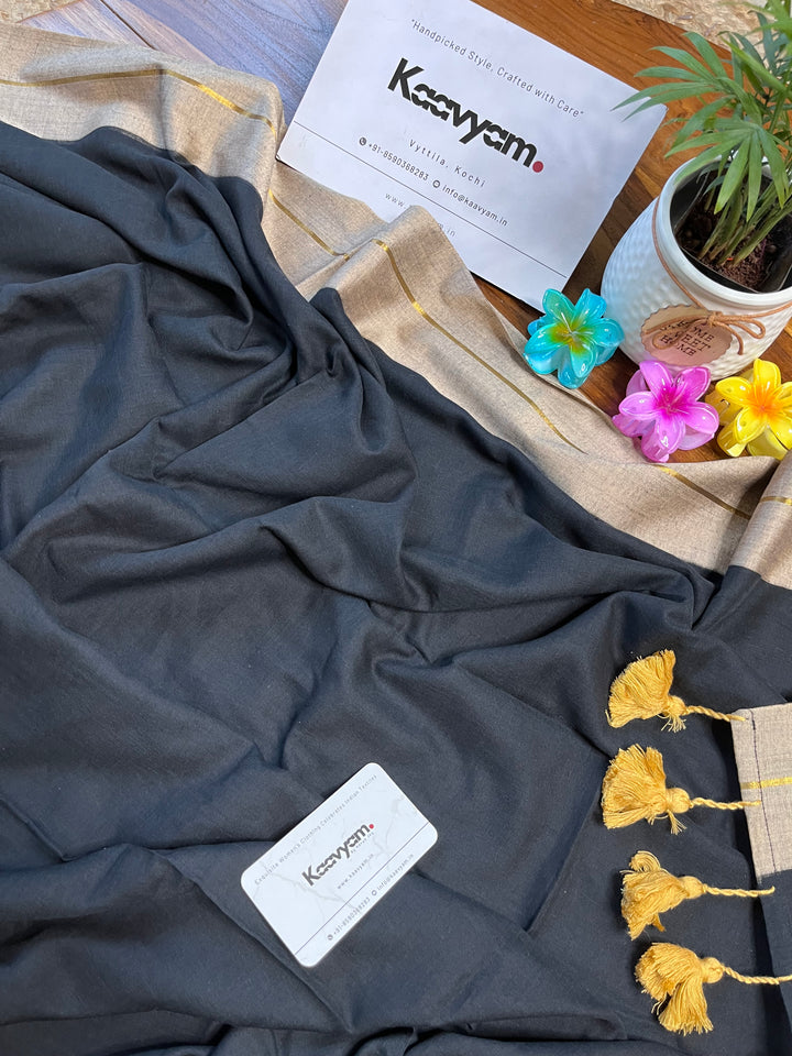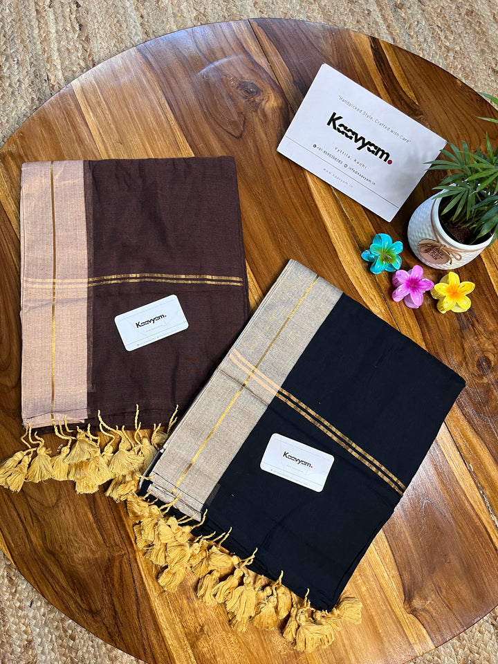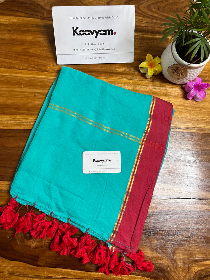 Premium authentic plain mul cotton saree with contrast border along with golden zari woven string border all over the saree ended with handmade tassels on pallu.