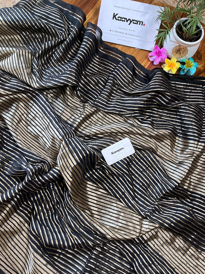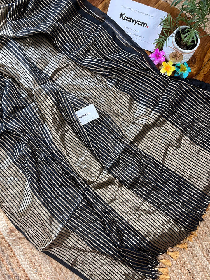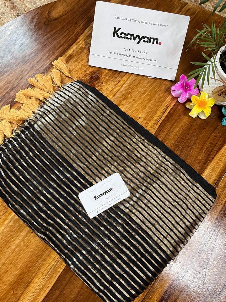 Plain black mul cotton saree with golden multi stripes all over the saree ended with handmade tassels on pallu.