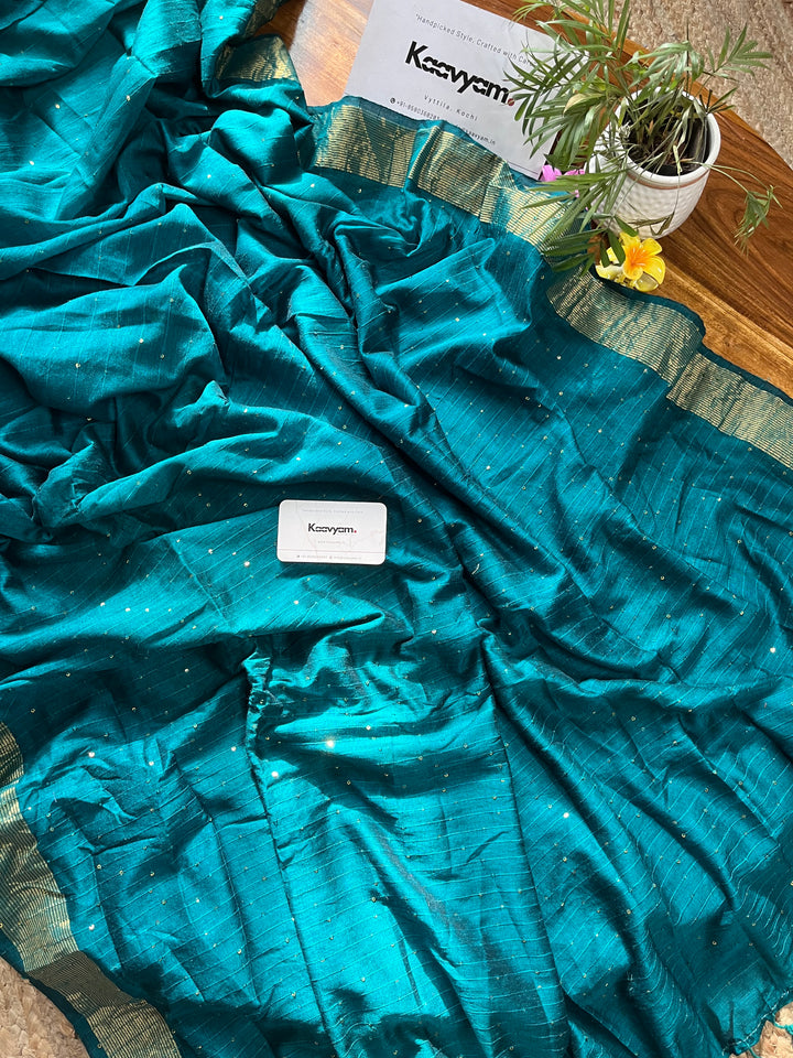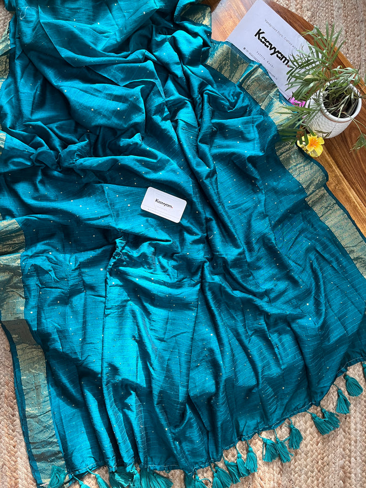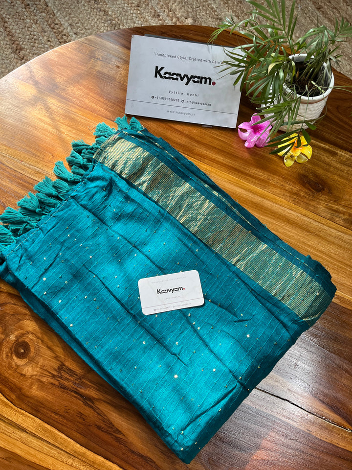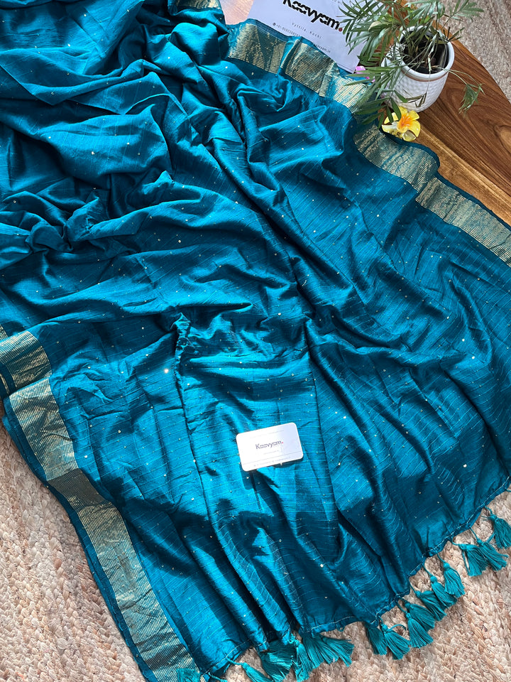 Plain mul modal saree with rich small sequins embroidery all over the saree ended with handmade tassels on pallu.