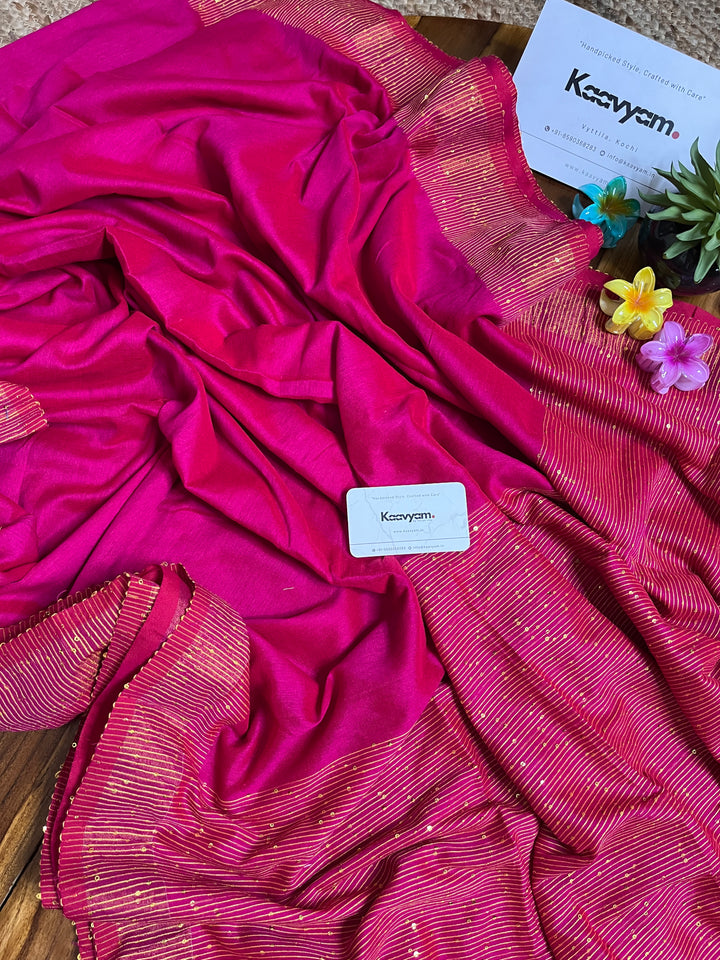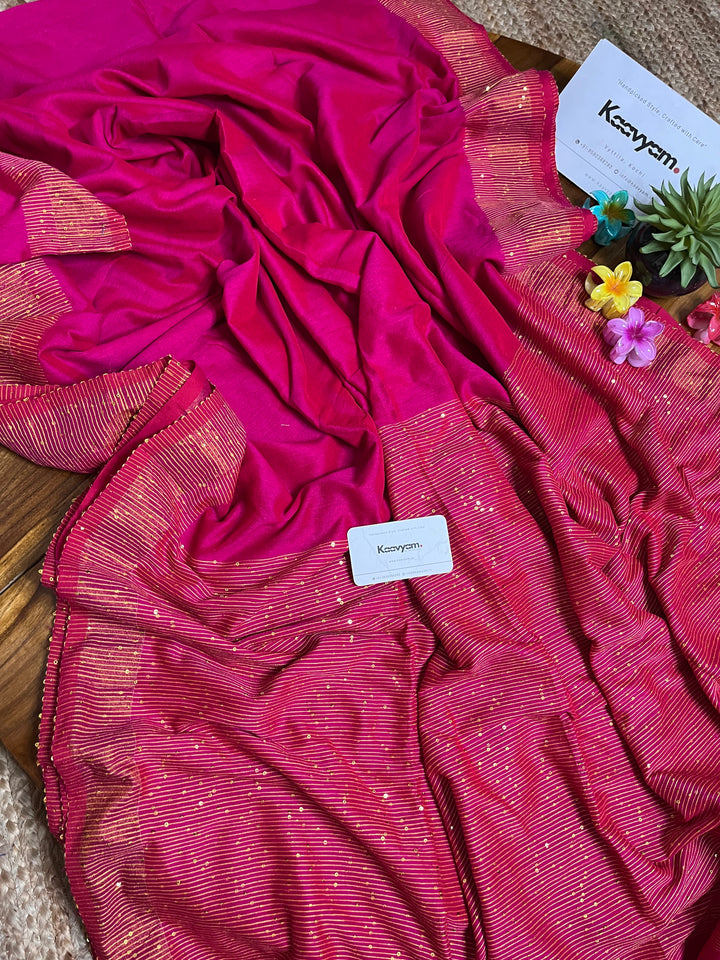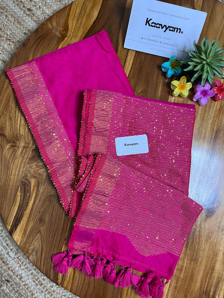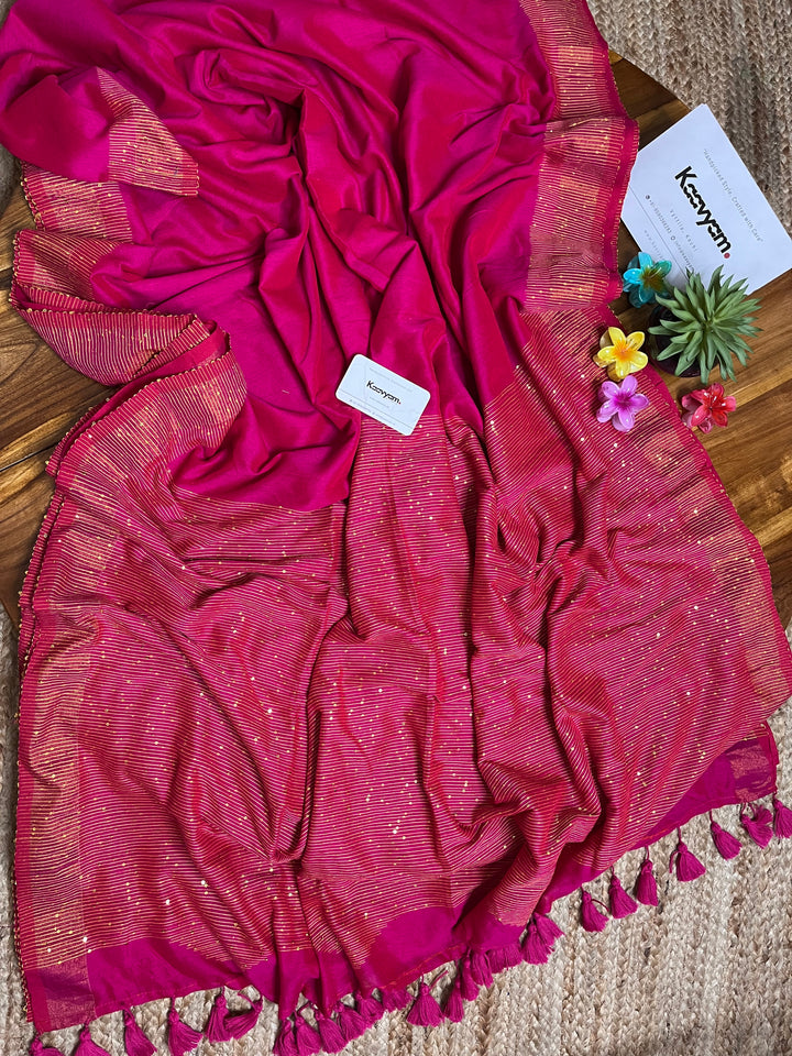 Plain soft handloom cotton saree with rich small sequins embroidery all over the border of the saree ended with sequins embroidery rich pallu finishes with tassels.