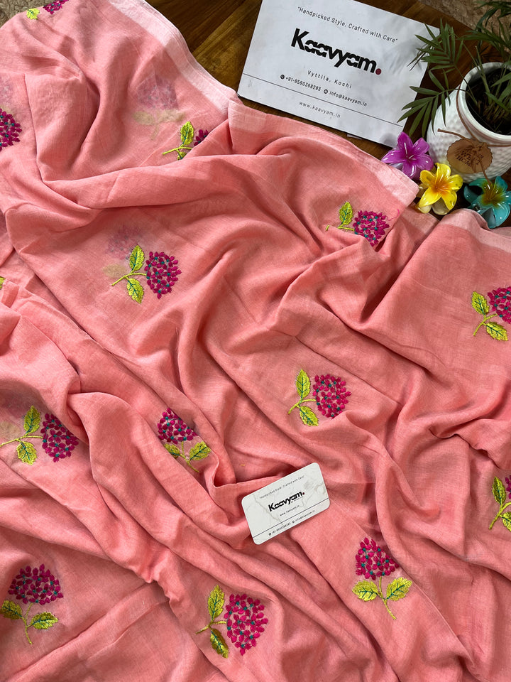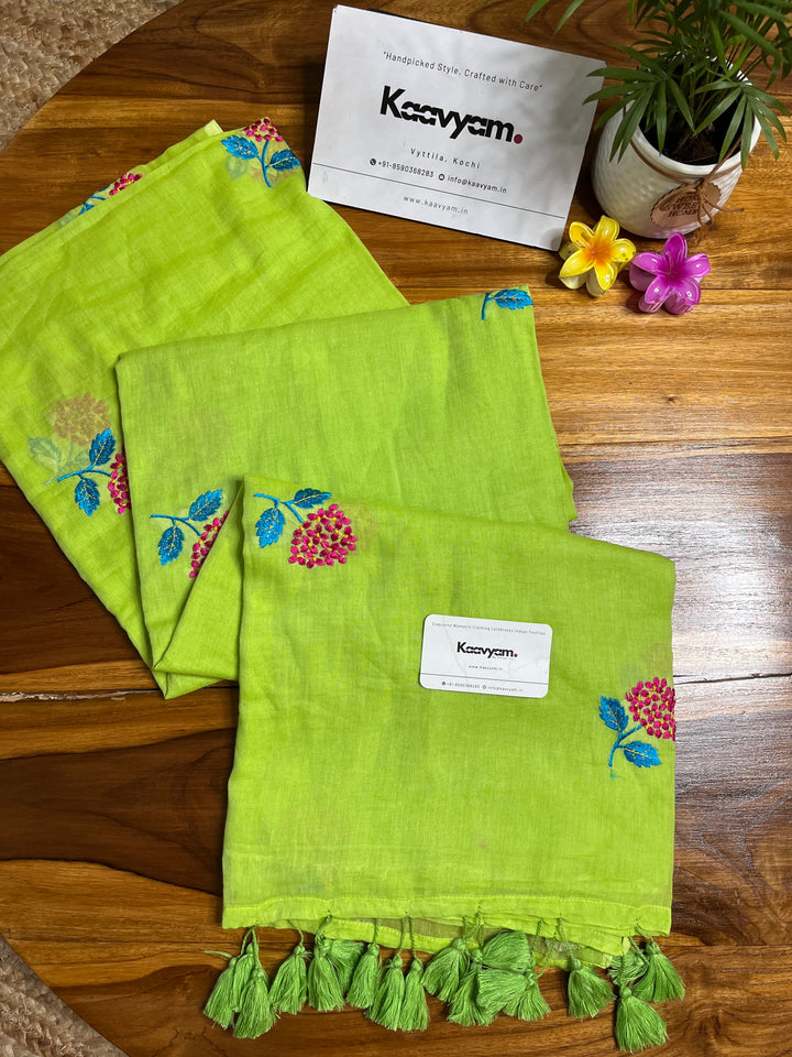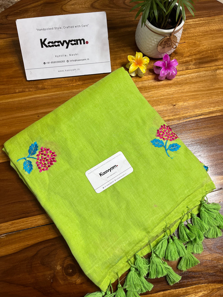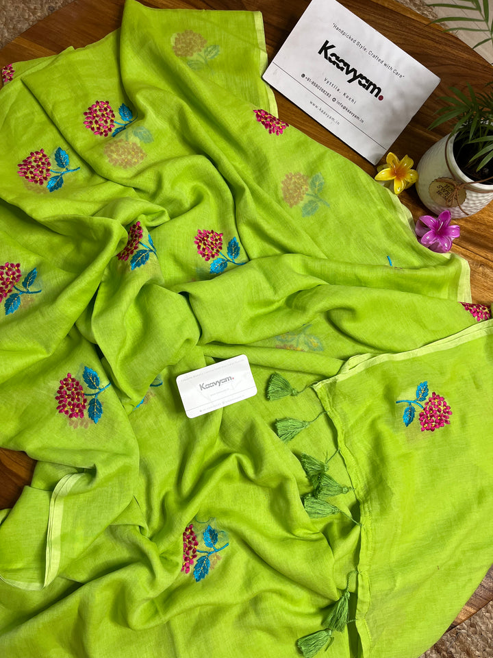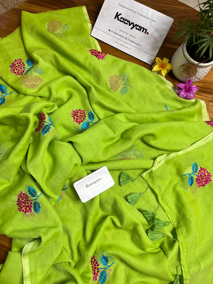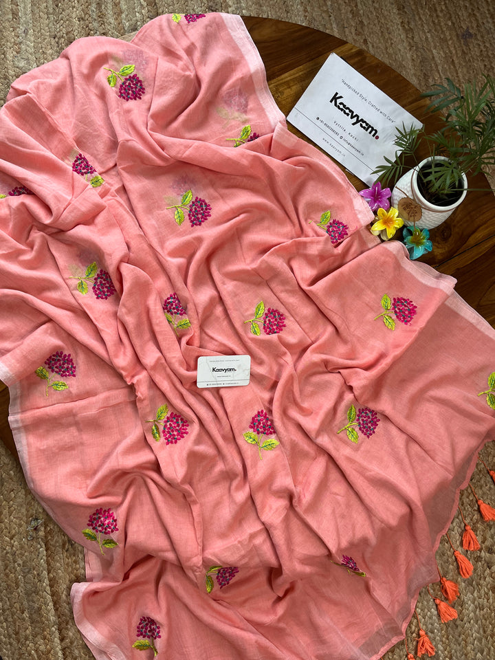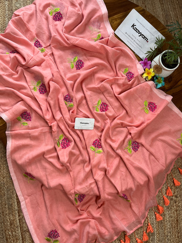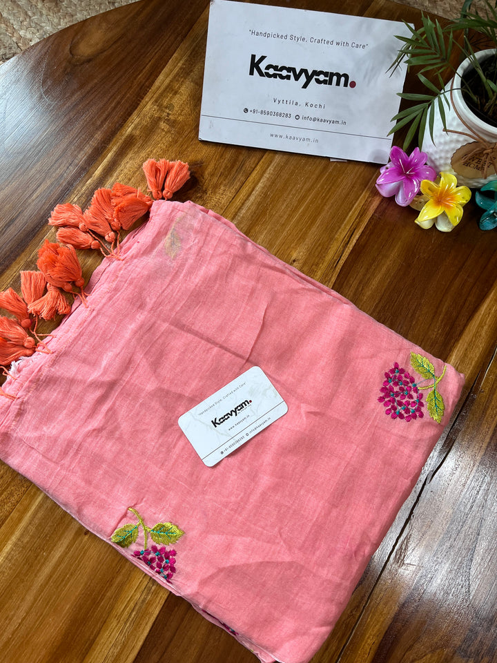 Plain mul cotton saree with flower embroidery all over the saree ended with handmade tassels on pallu.
