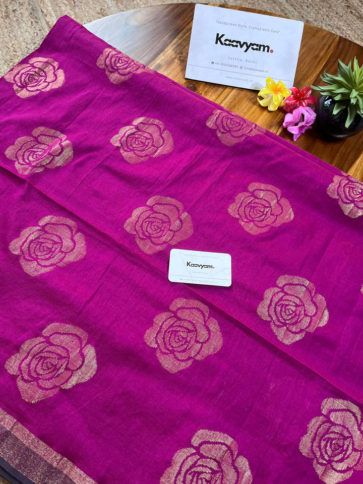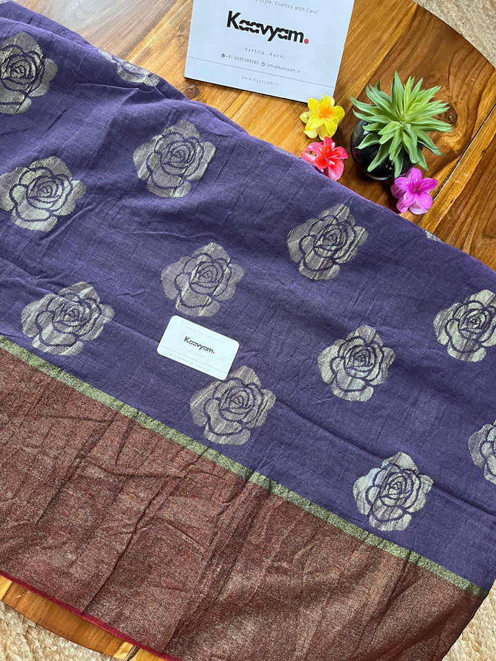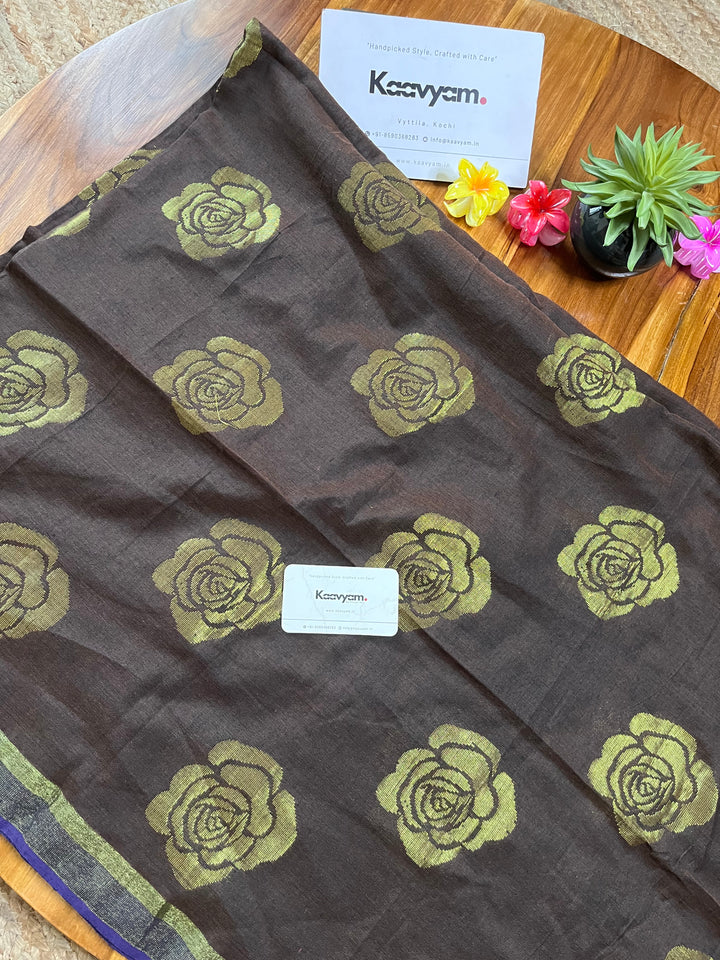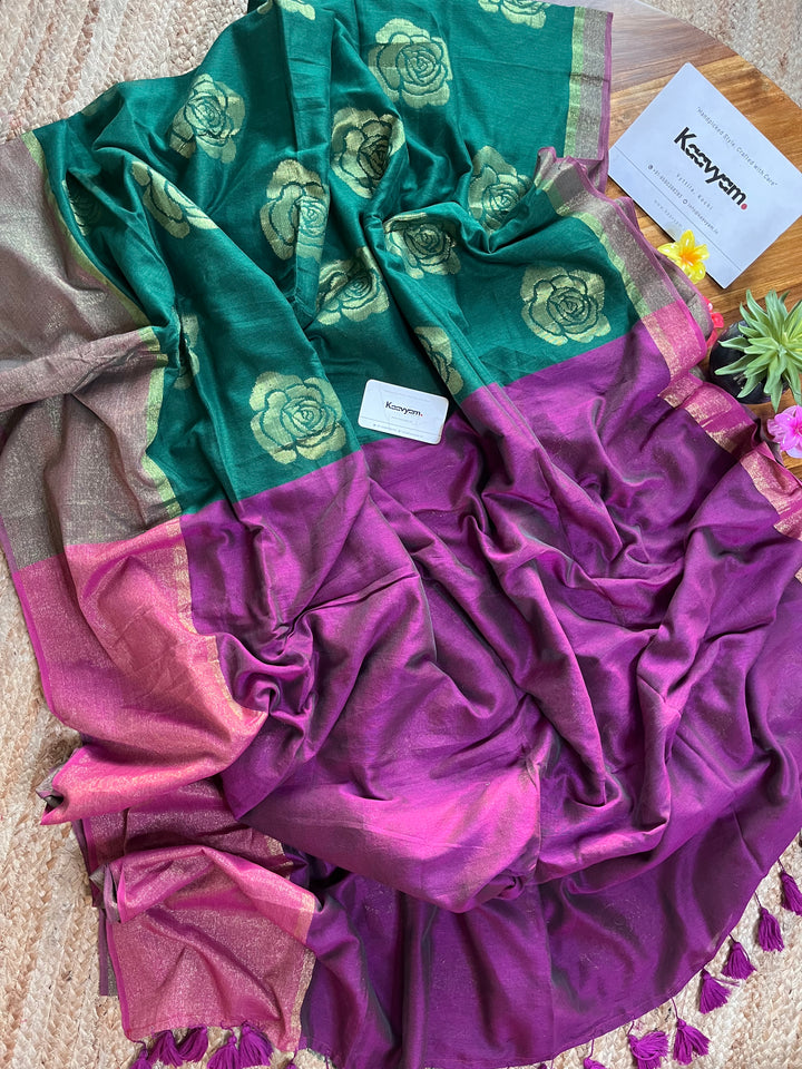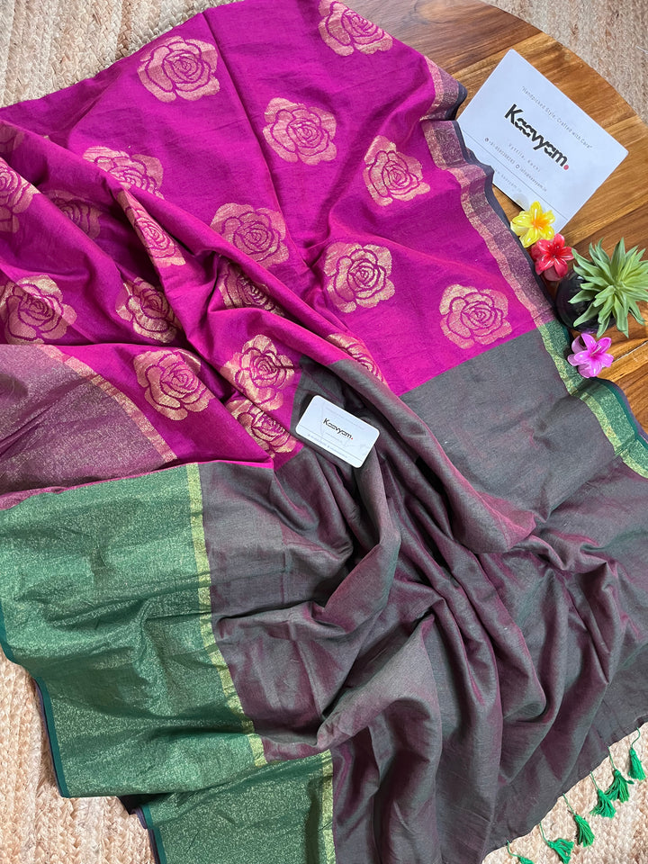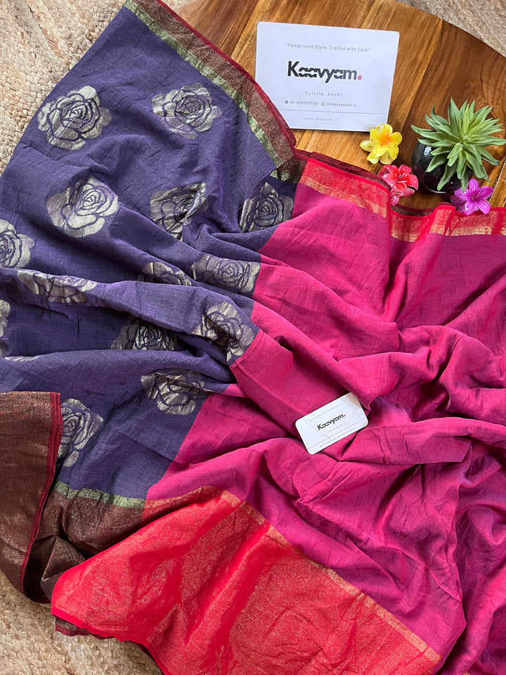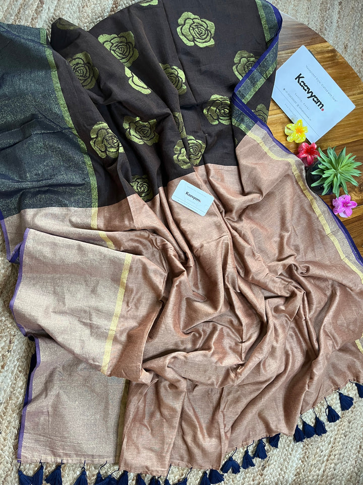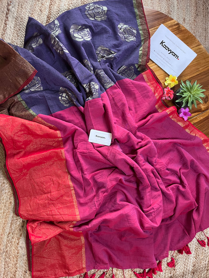 Premium cotton zari saree with hibiscus floral motif jari woven design all over the saree ended with contrast pallu finished with tassels.