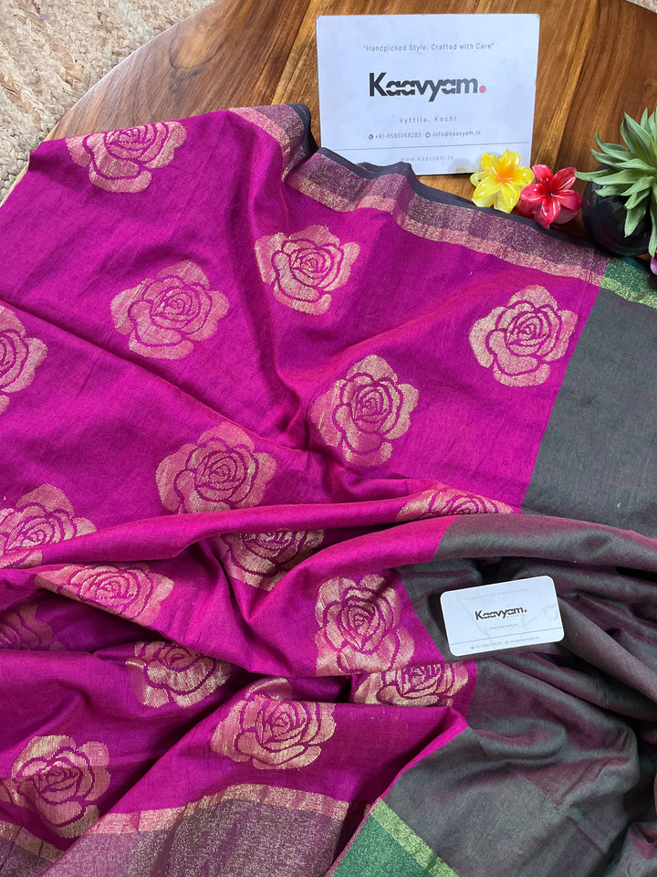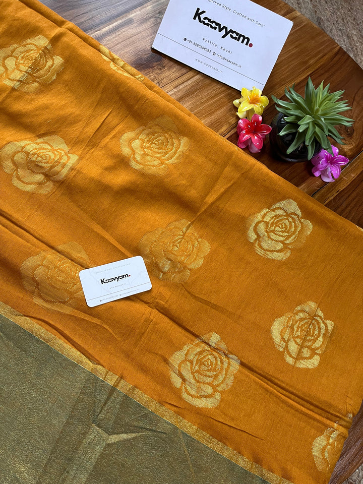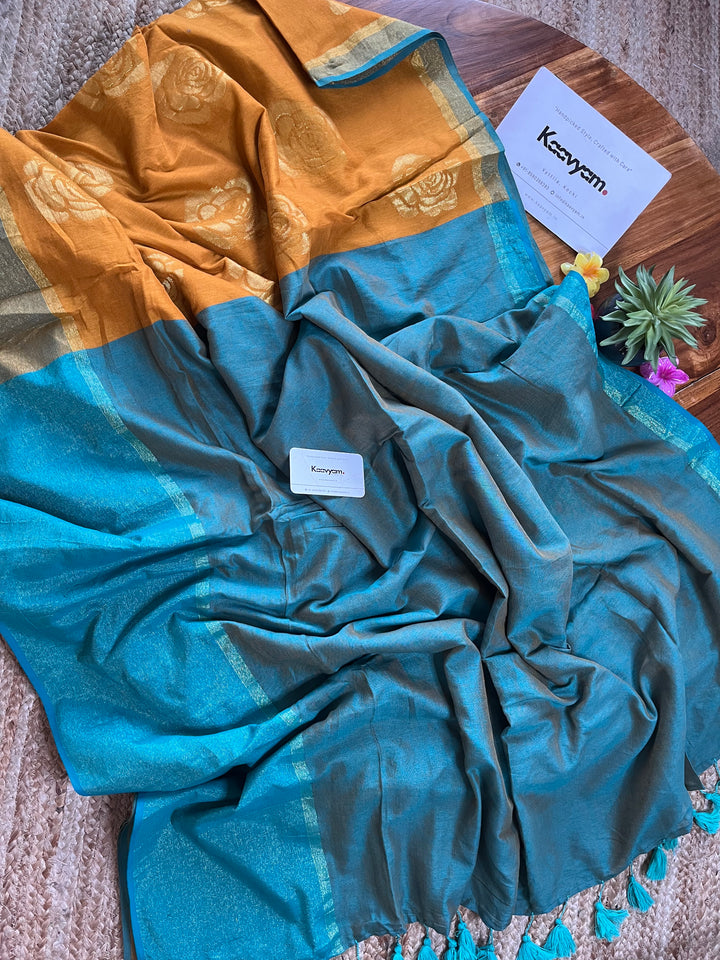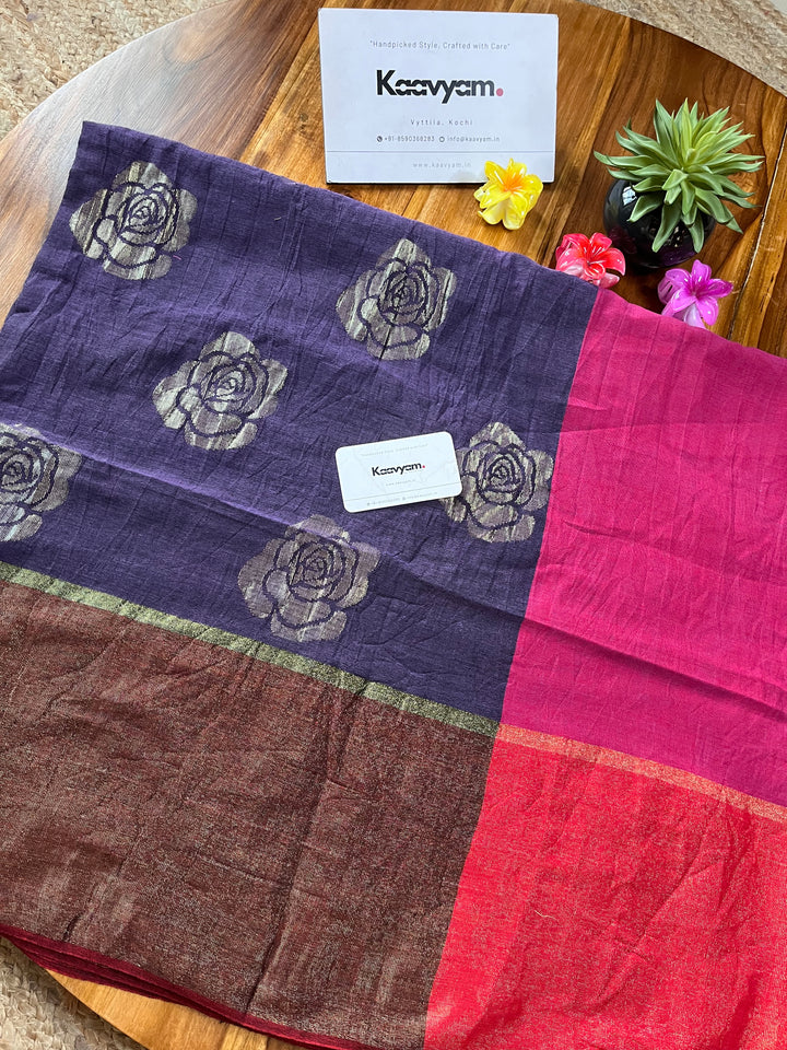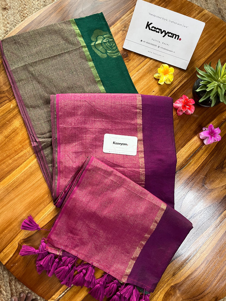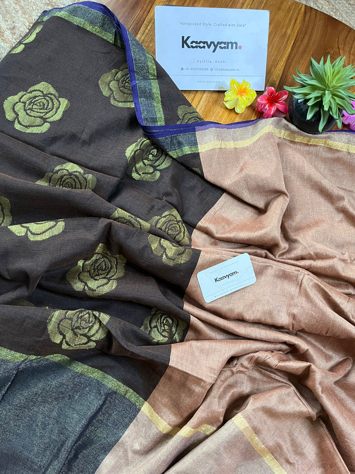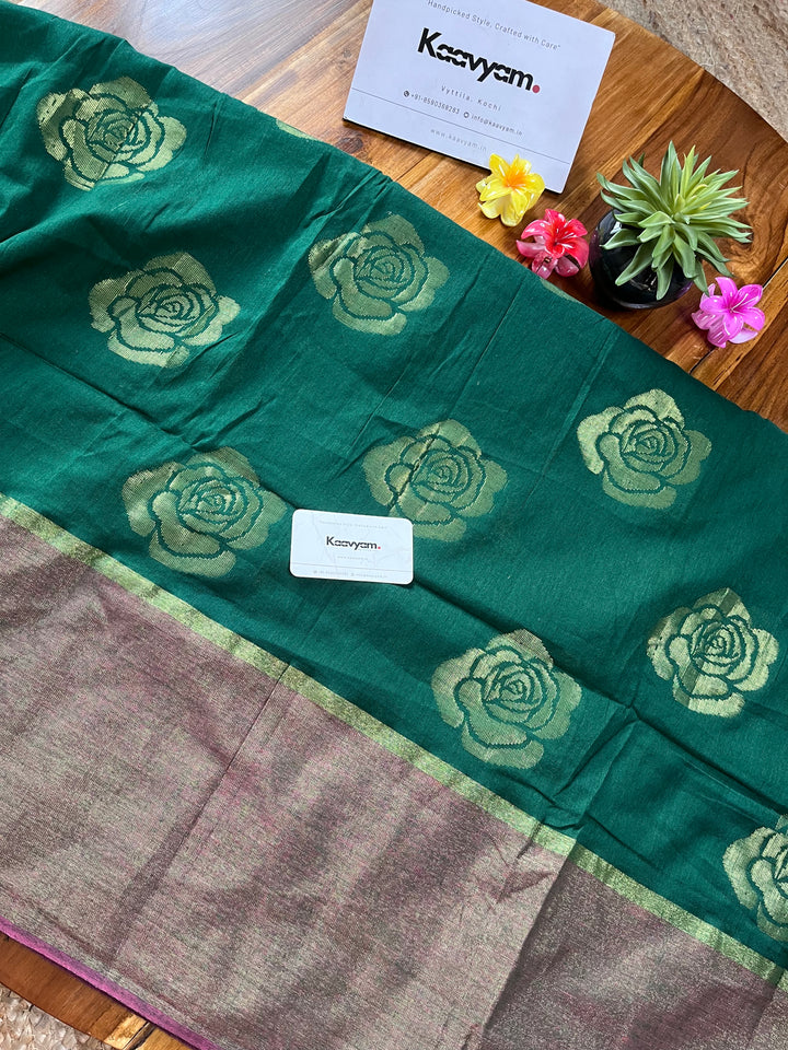 Premium cotton zari saree with hibiscus floral motif jari woven design all over the saree ended with contrast pallu finished with tassels.
