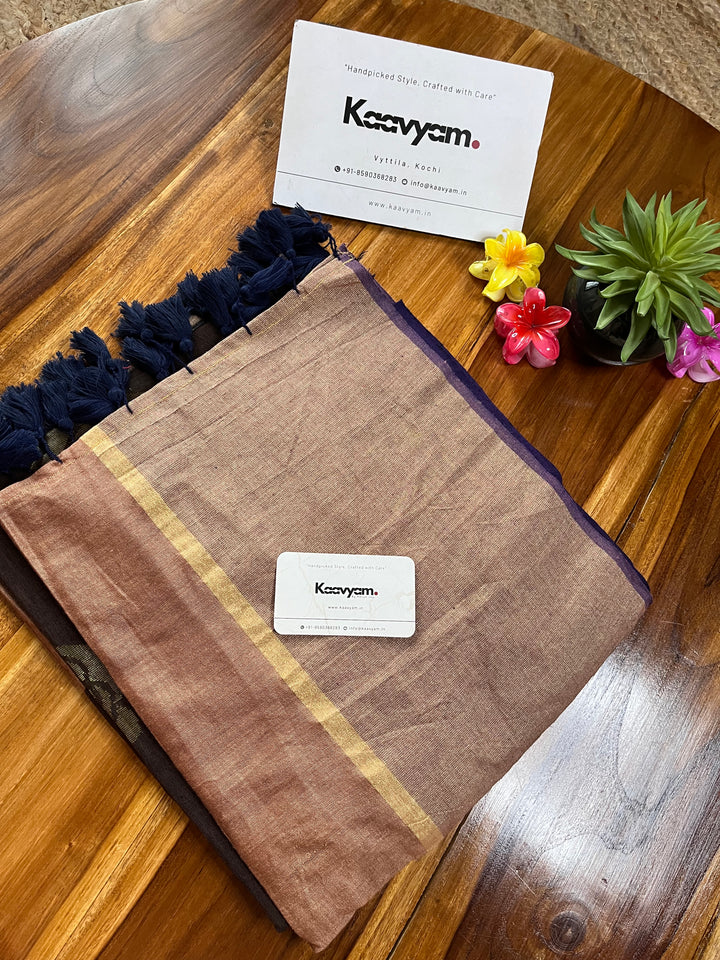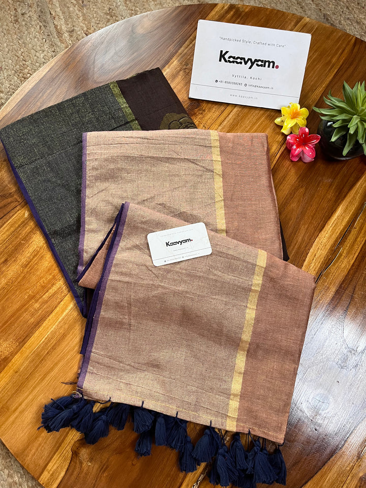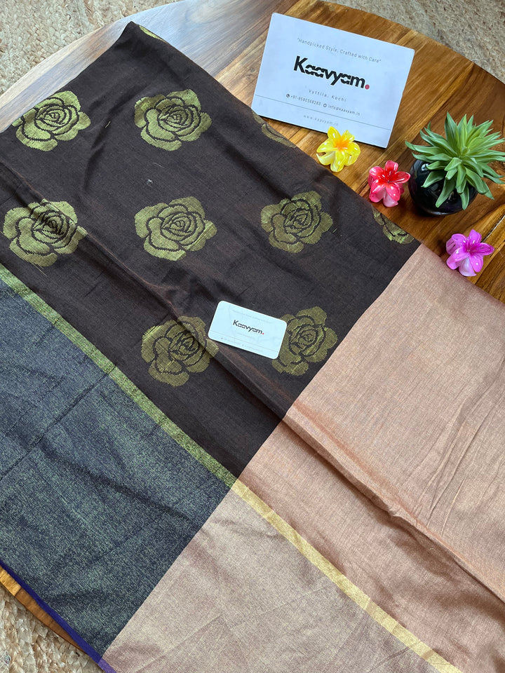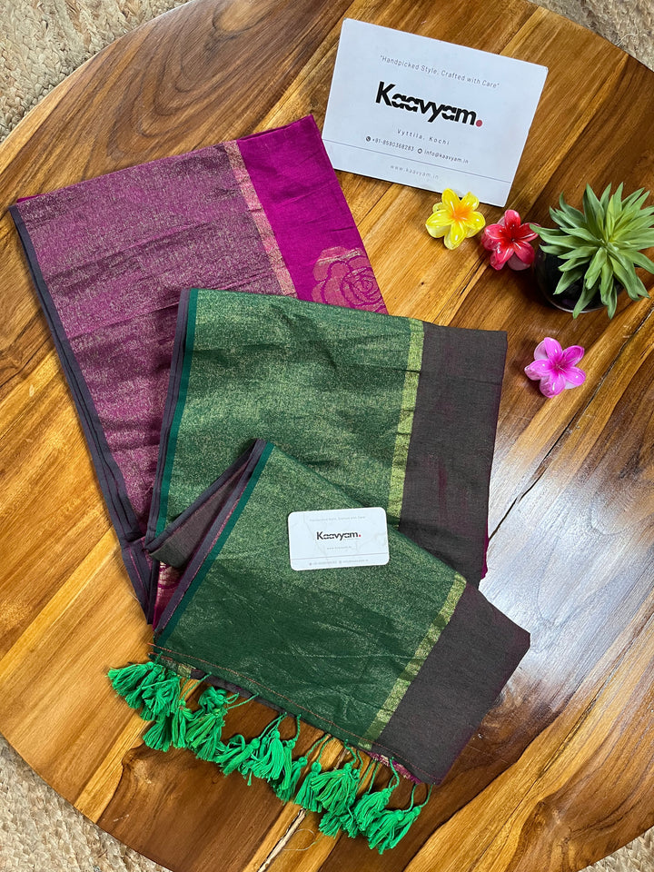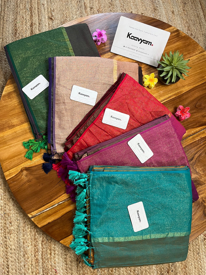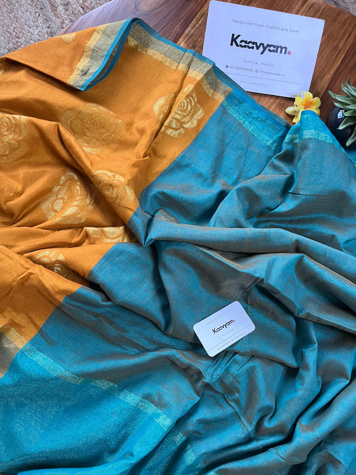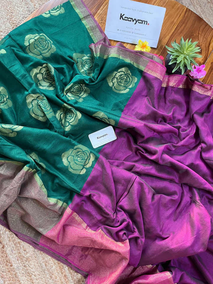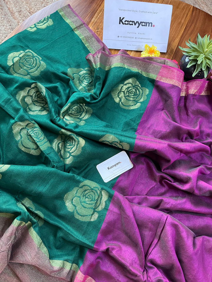 Premium cotton zari saree with hibiscus floral motif jari woven design all over the saree ended with contrast pallu finished with tassels.
