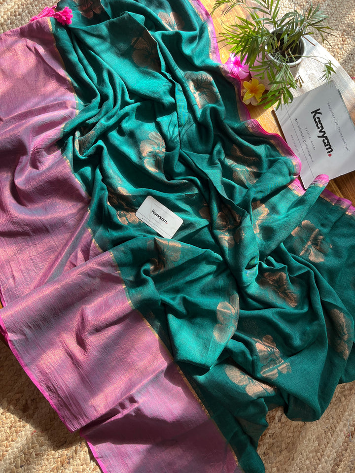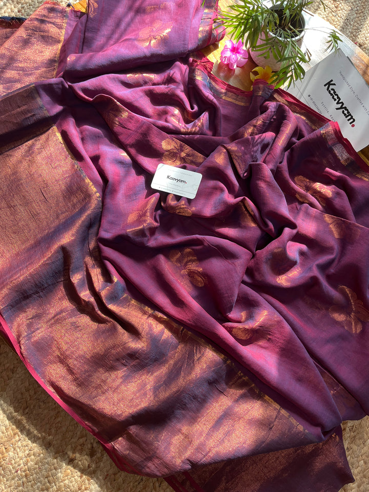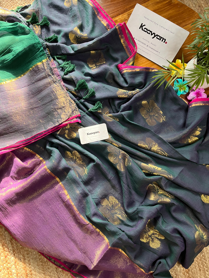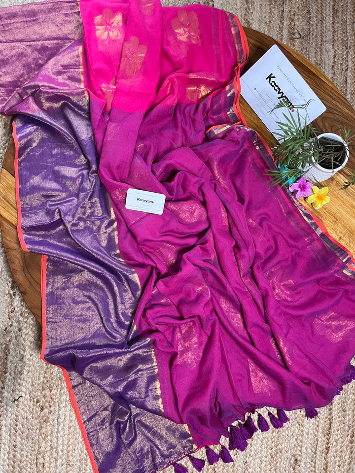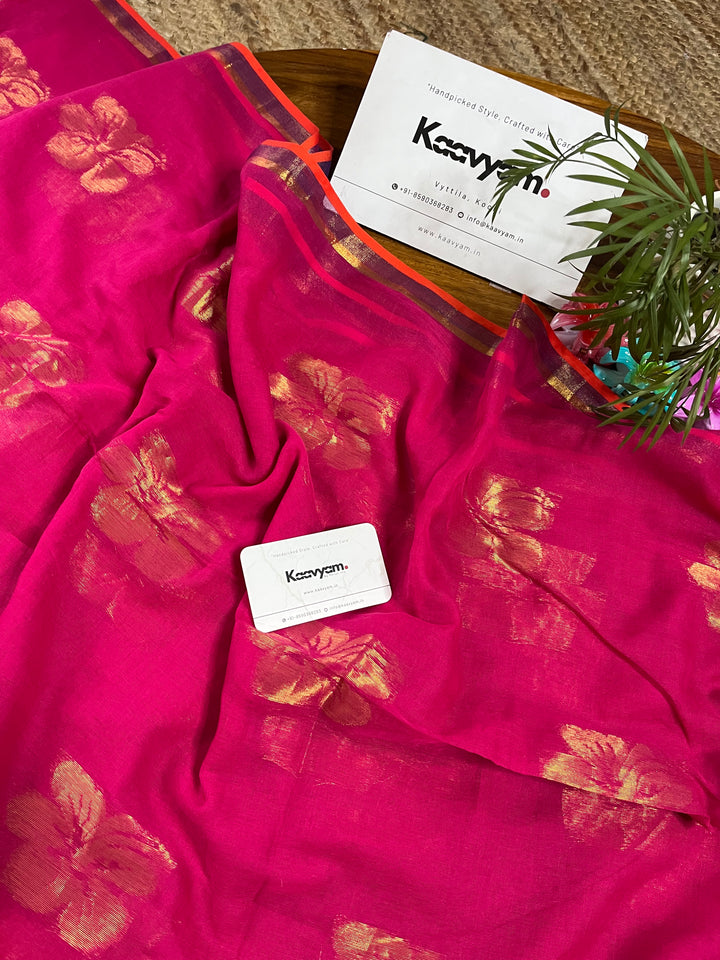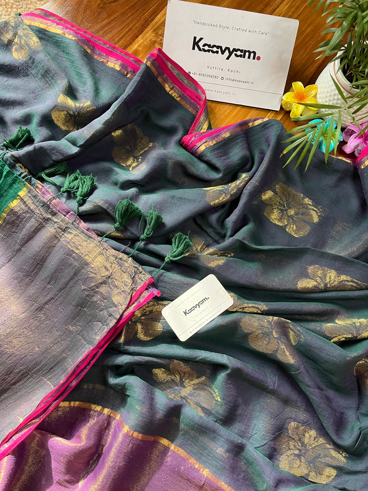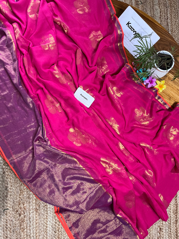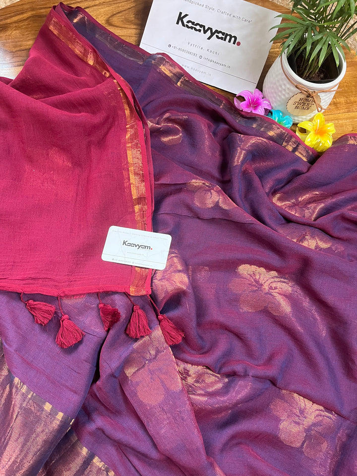 Light weight breathable mul cotton saree with floral motif jari woven design all over the saree ended with contrast pallu finished with tassels