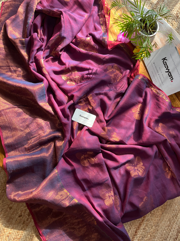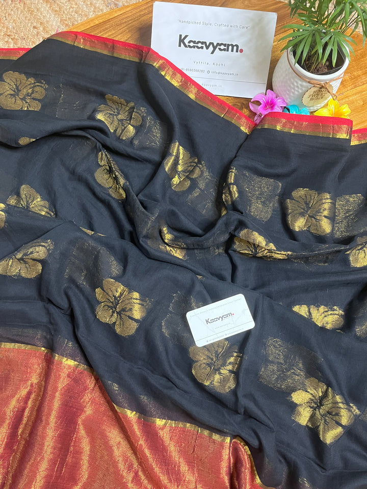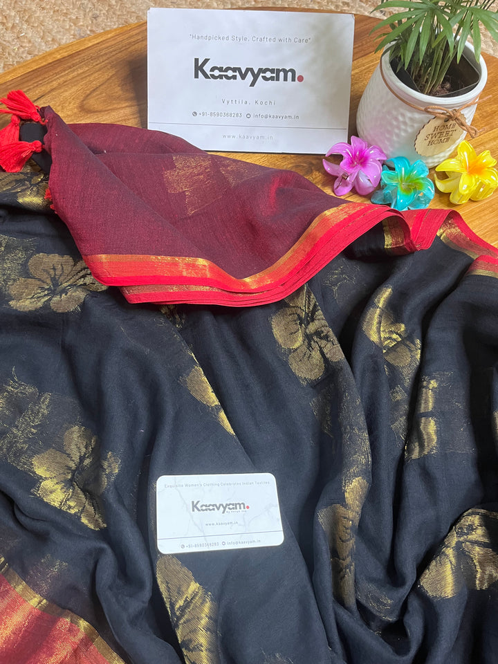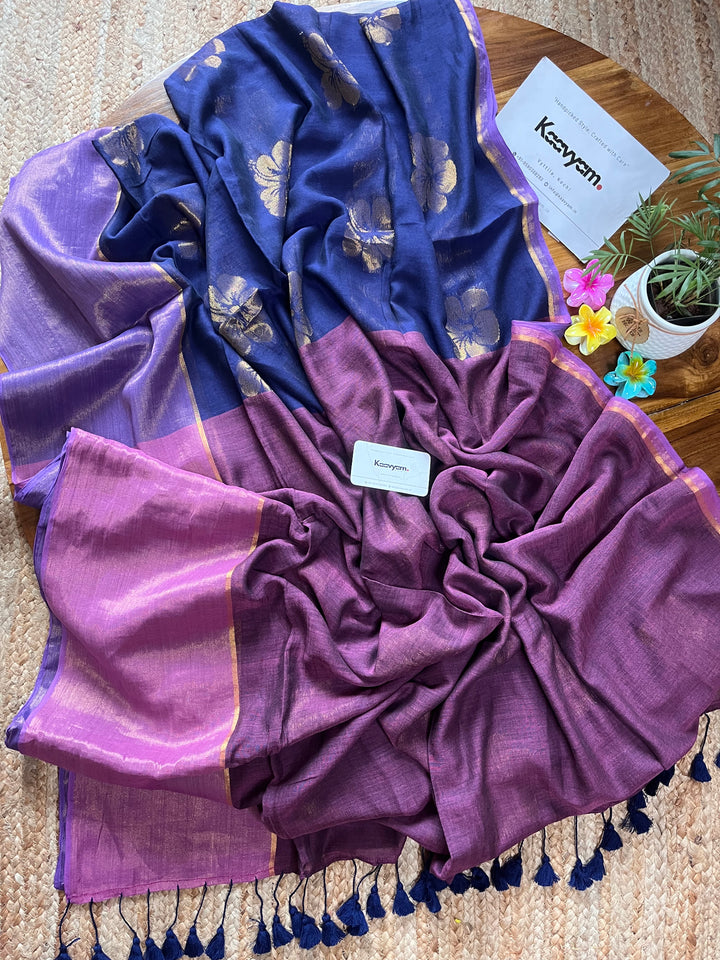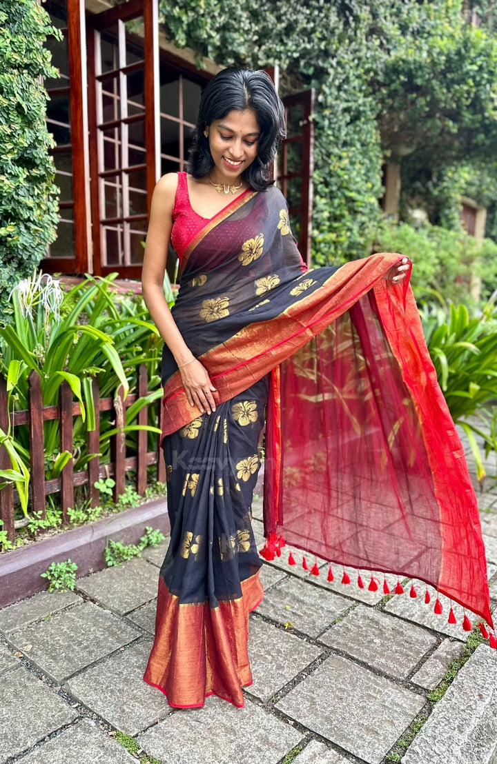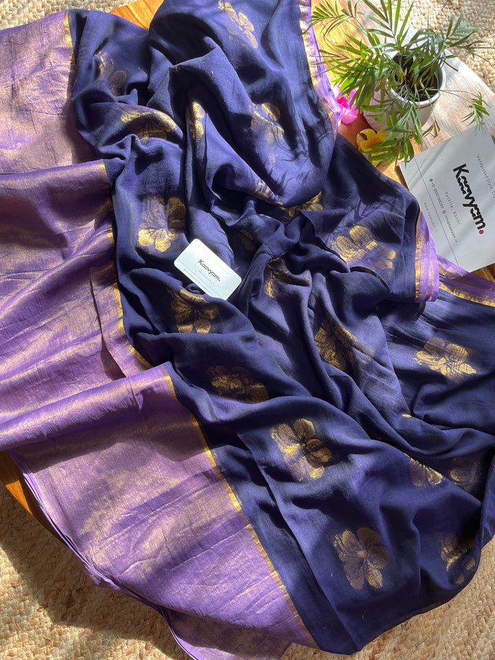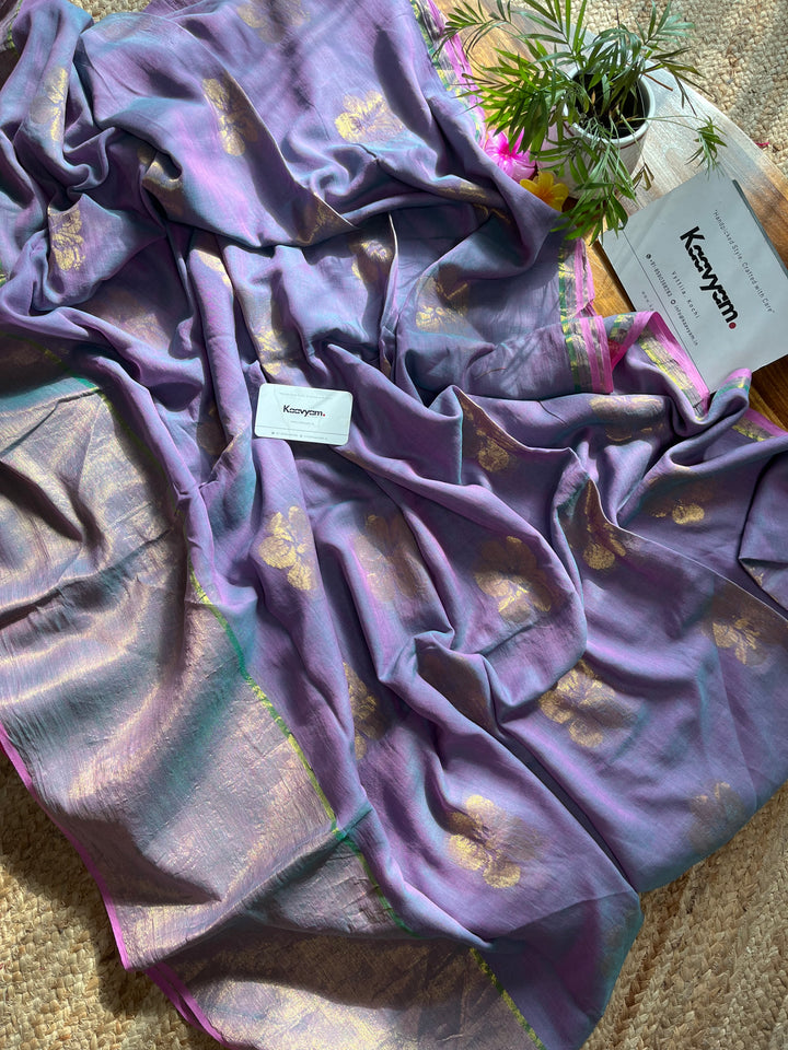 Light weight breathable mul cotton saree with floral motif jari woven design all over the saree ended with contrast pallu finished with tassels