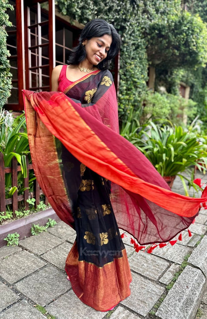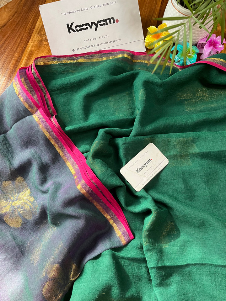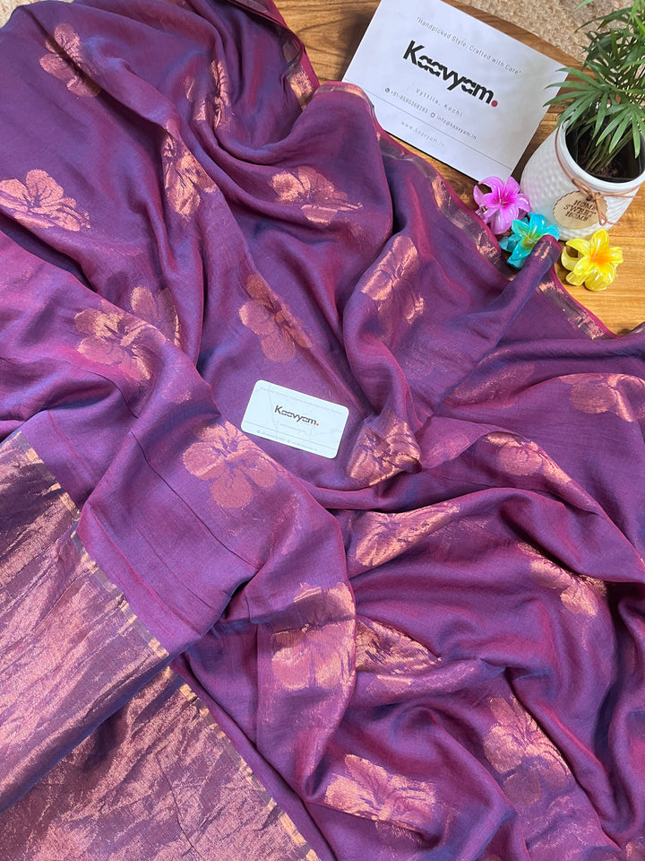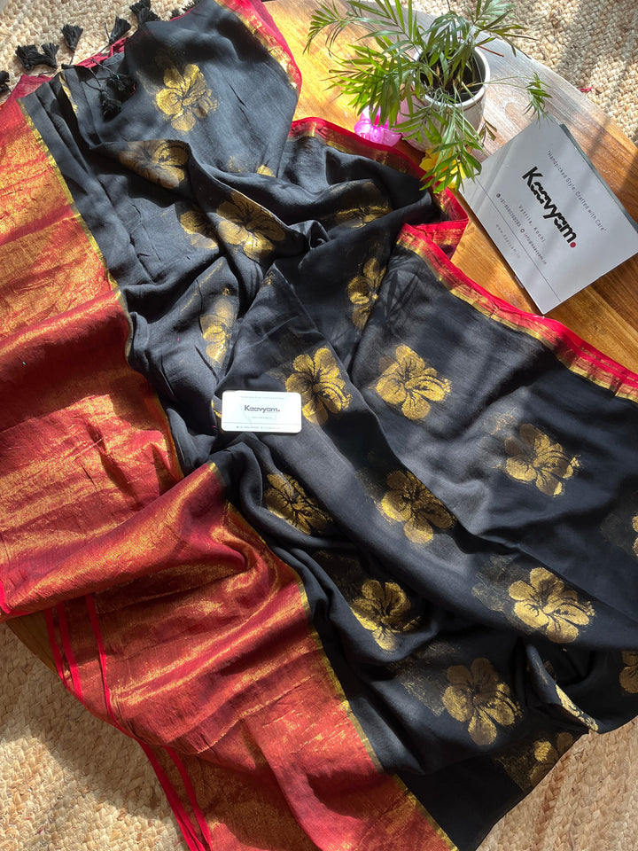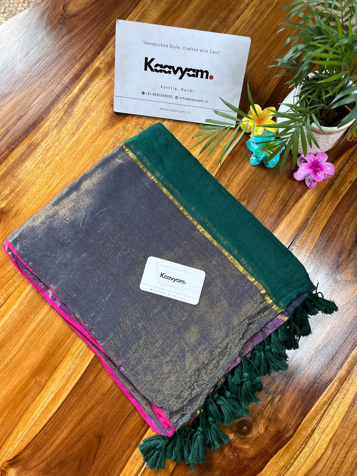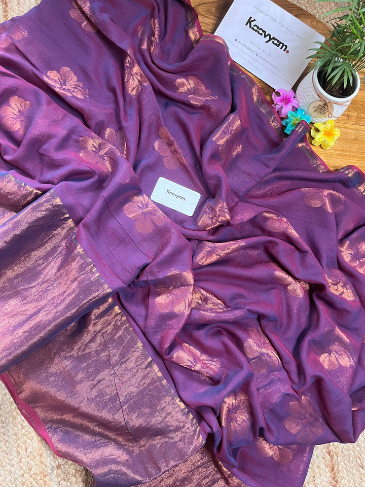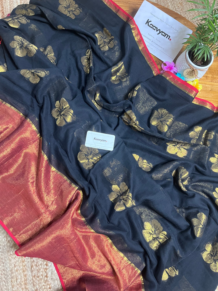Light weight breathable mul cotton saree with floral motif jari woven design all over the saree ended with contrast pallu finished with tassels