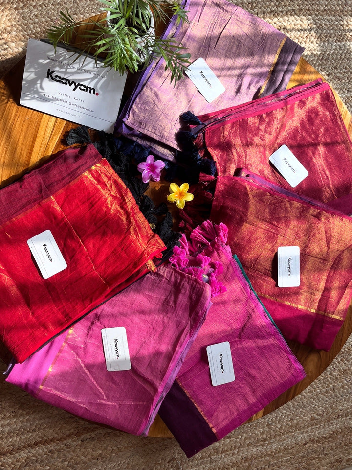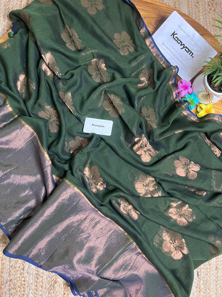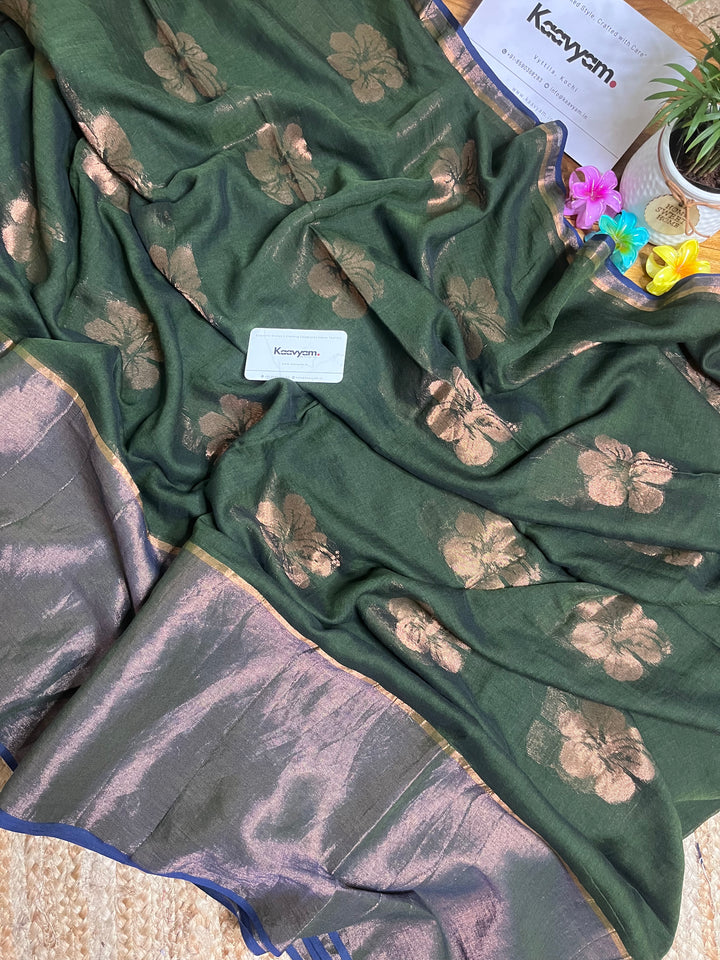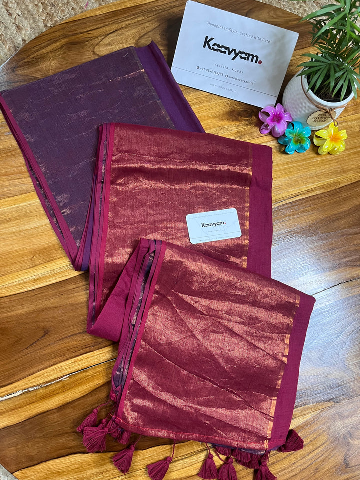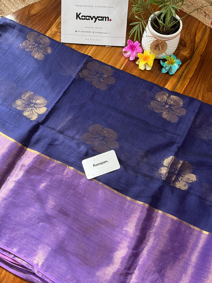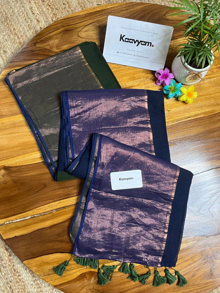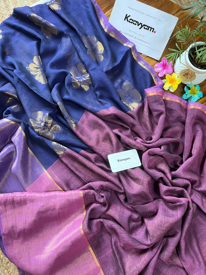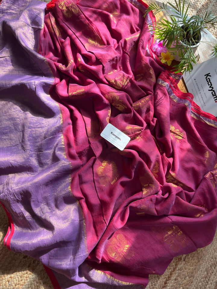Light weight breathable mul cotton saree with floral motif jari woven design all over the saree ended with contrast pallu finished with tassels