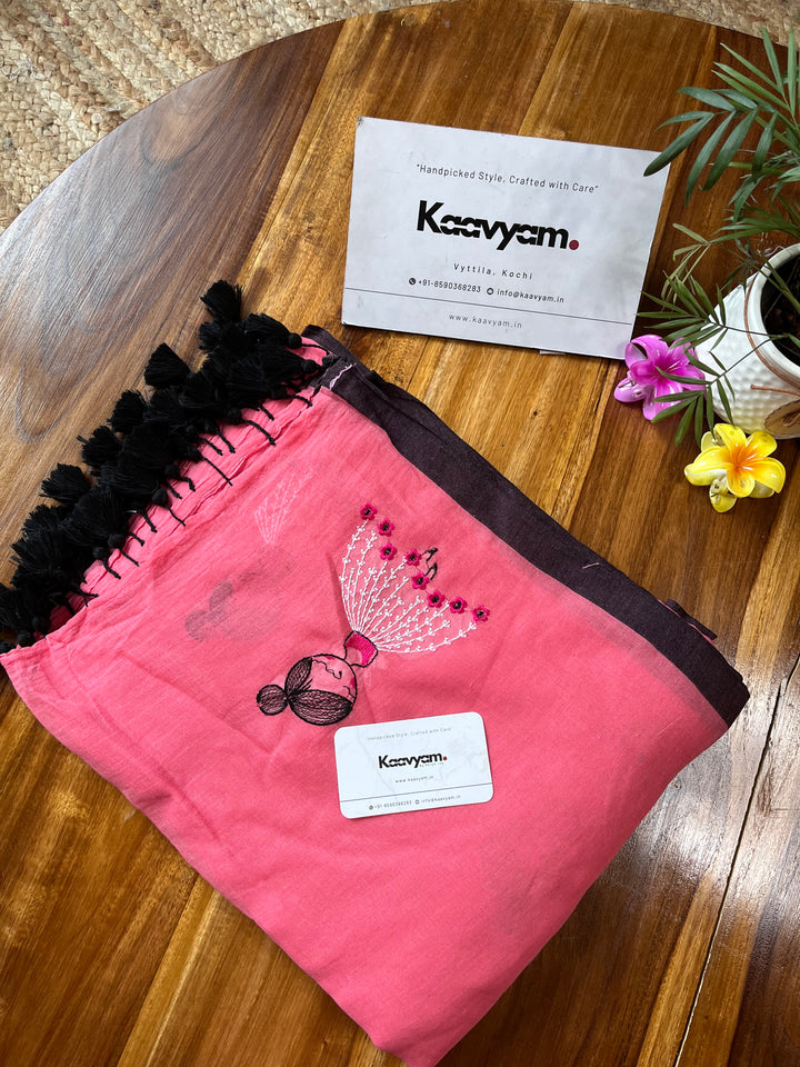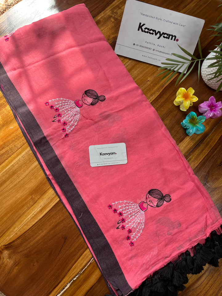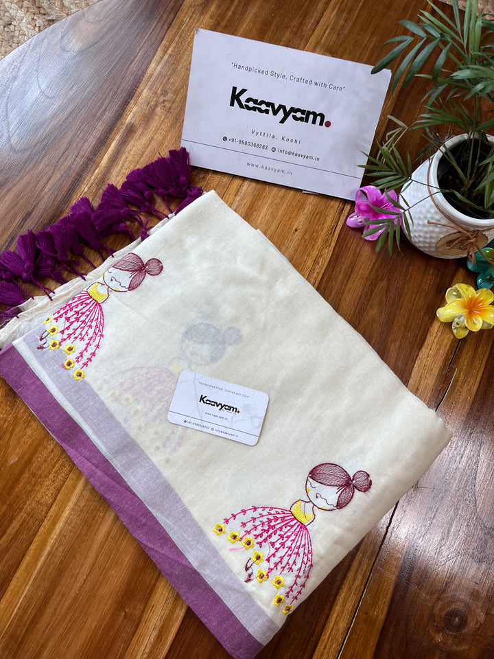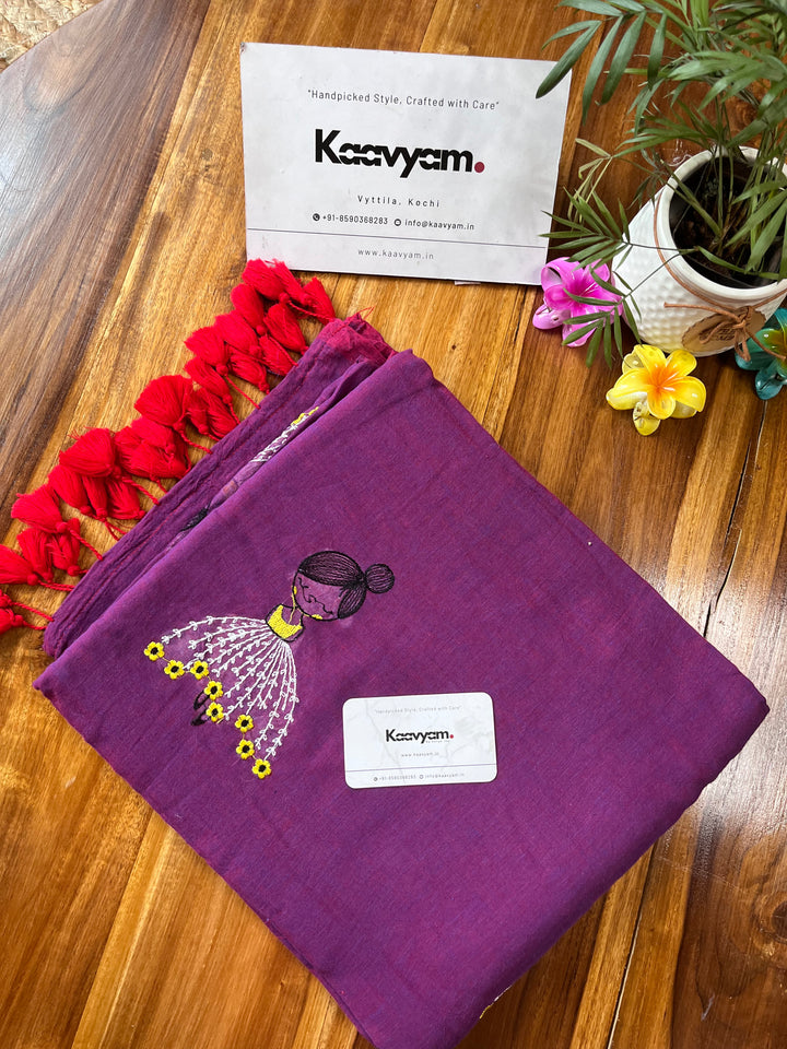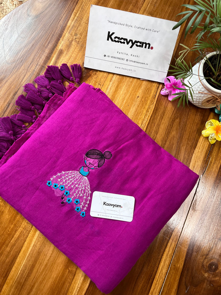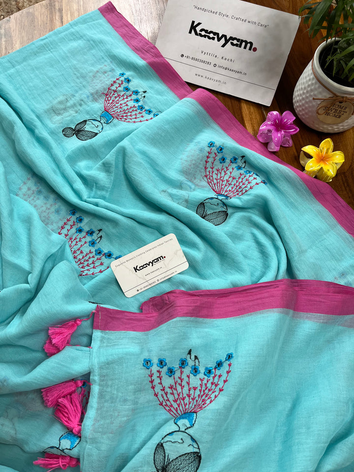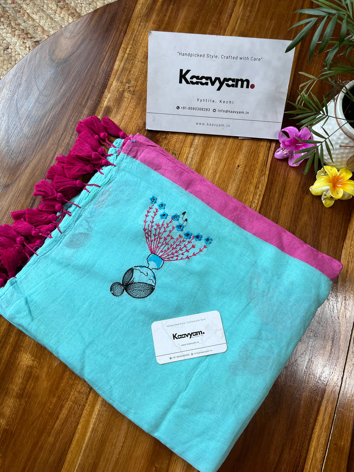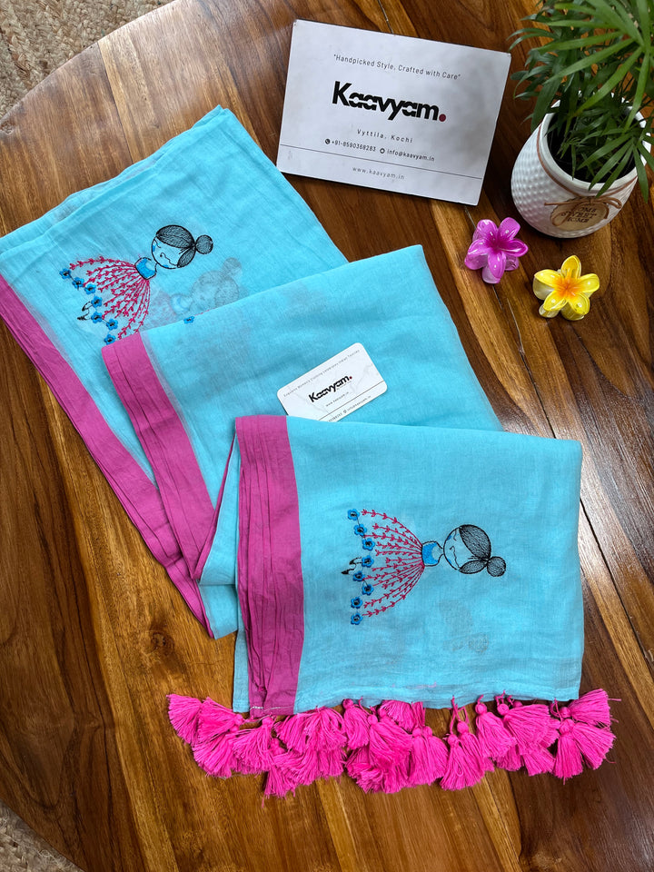 Pure cotton 120 count mul mul plain saree with doll and floral embroidery and half inch contrast border all over the saree ended with handmade tassels on pallu
