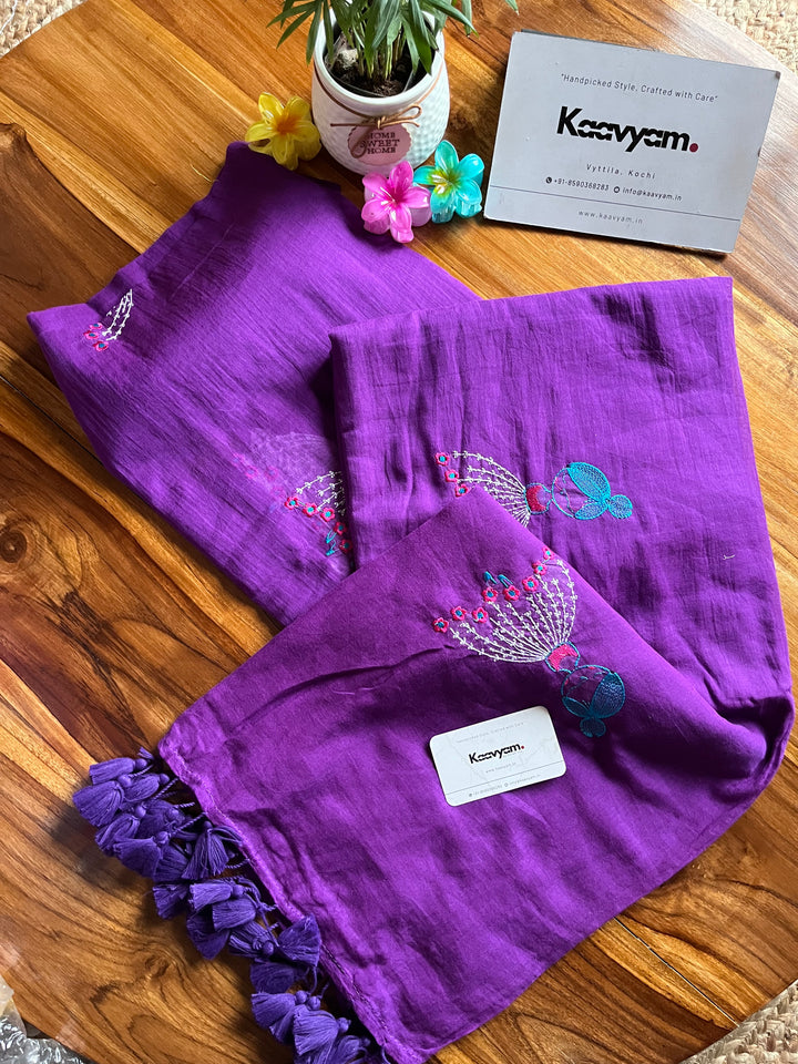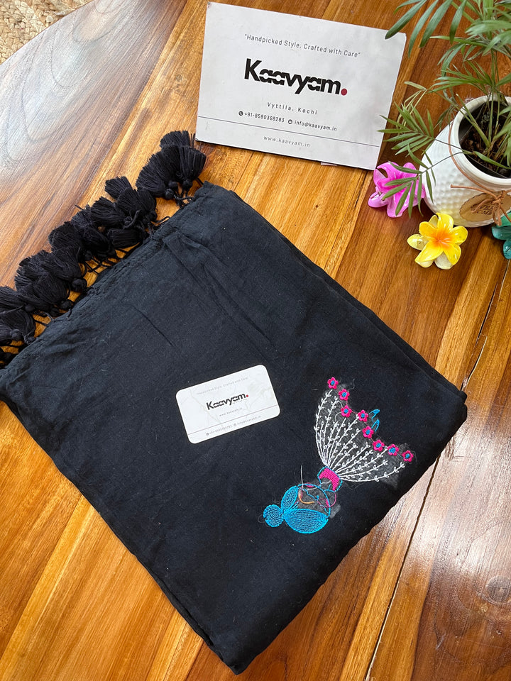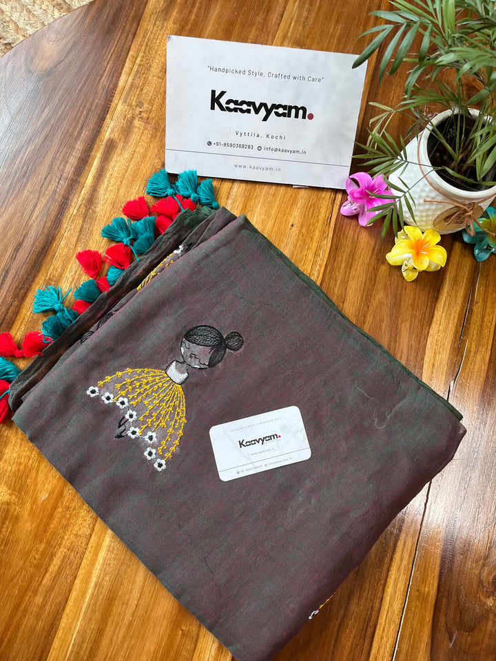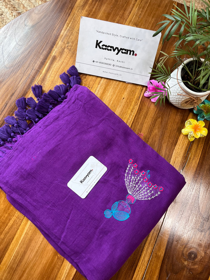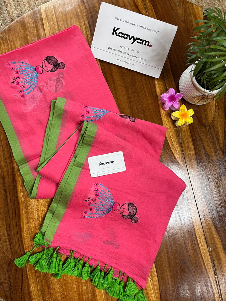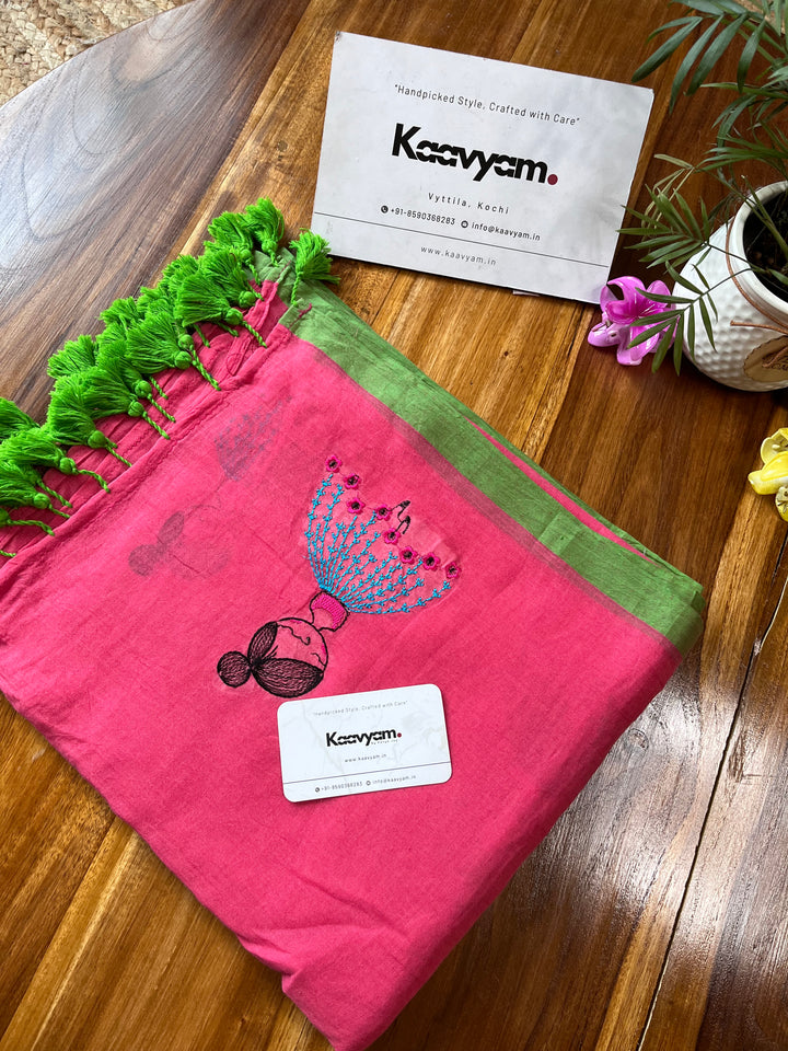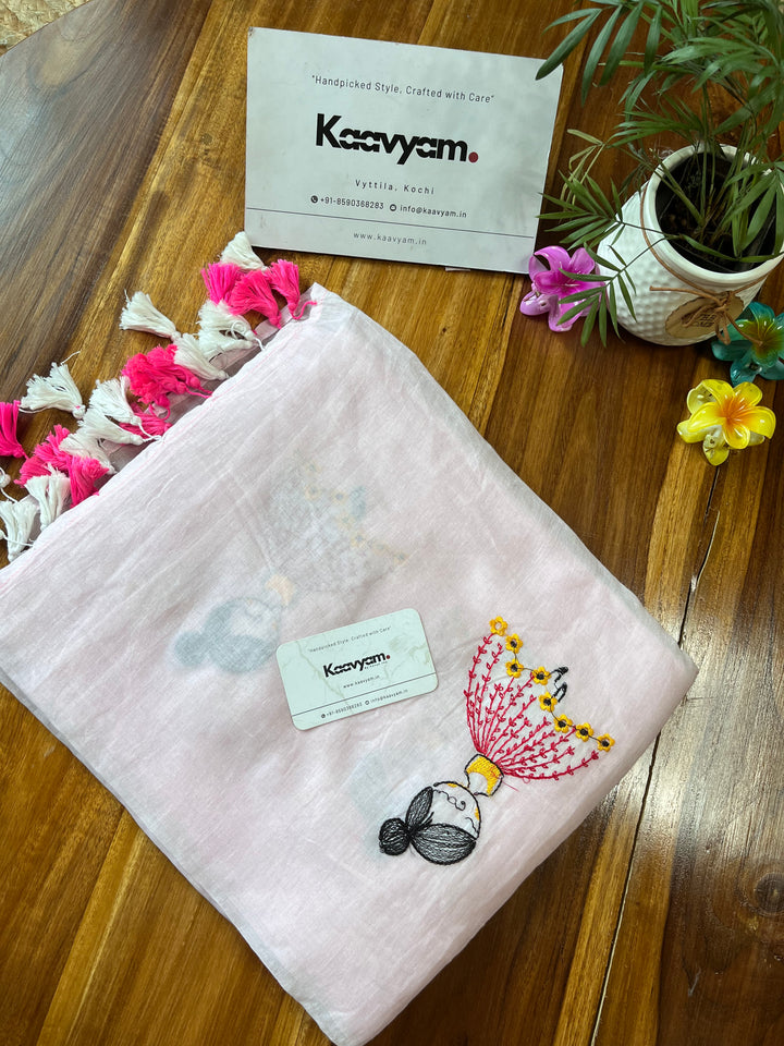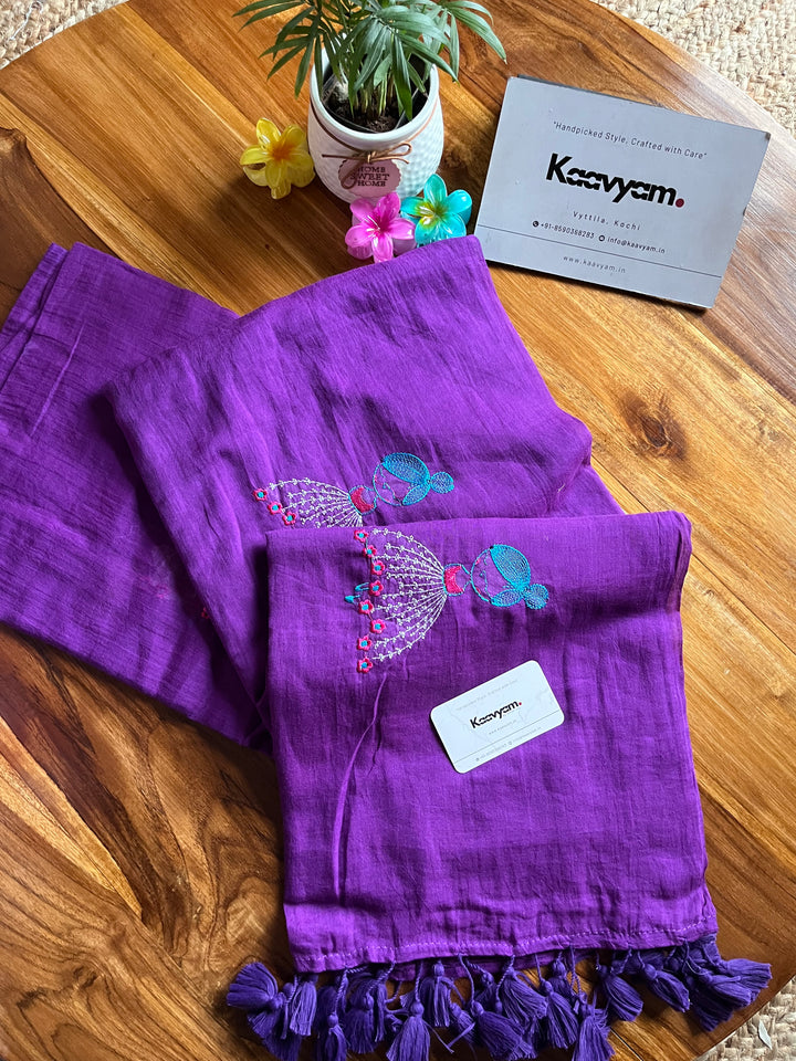 Pure cotton 120 count mul mul plain saree with doll and floral embroidery and half inch contrast border all over the saree ended with handmade tassels on pallu