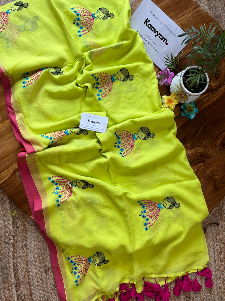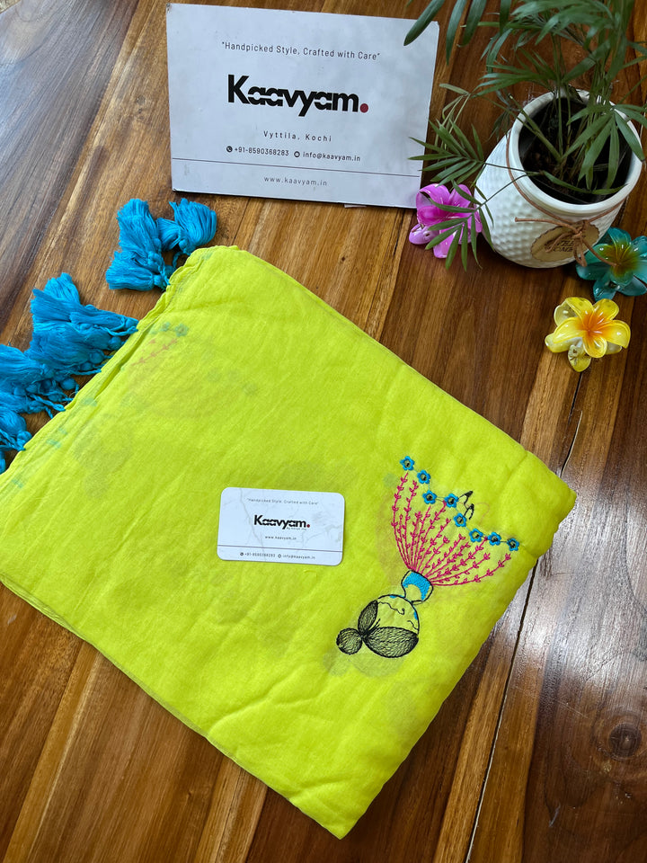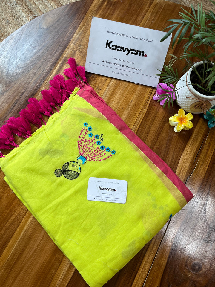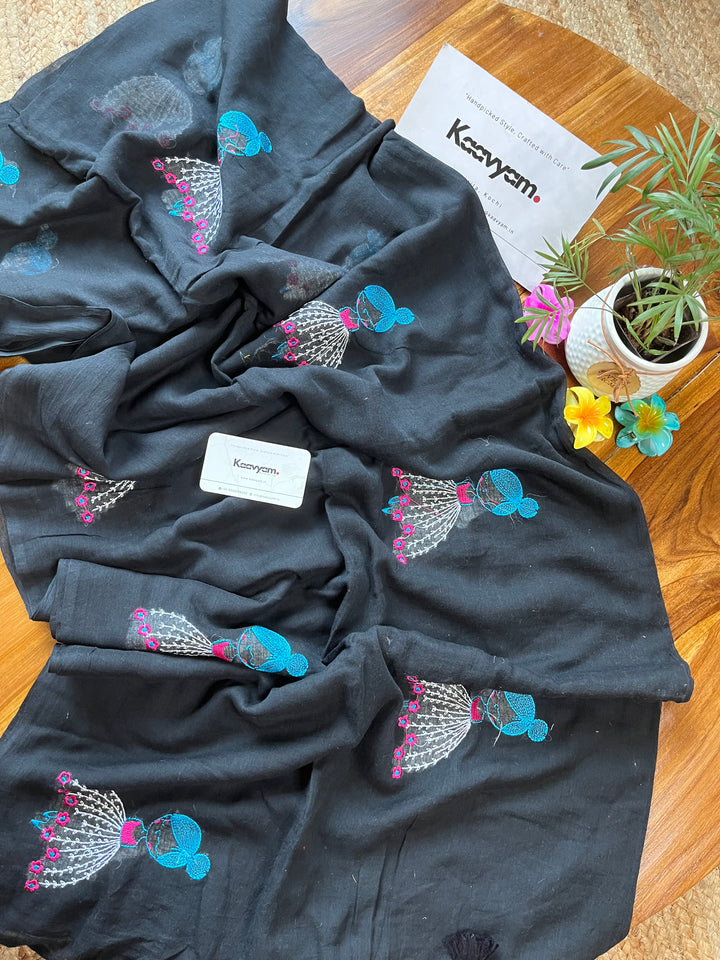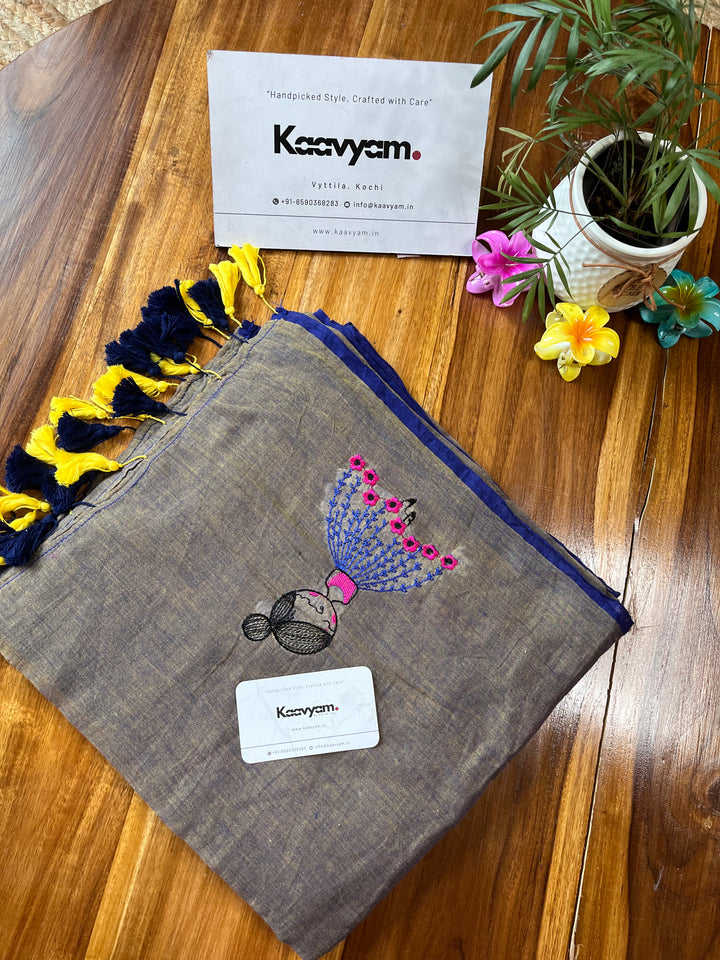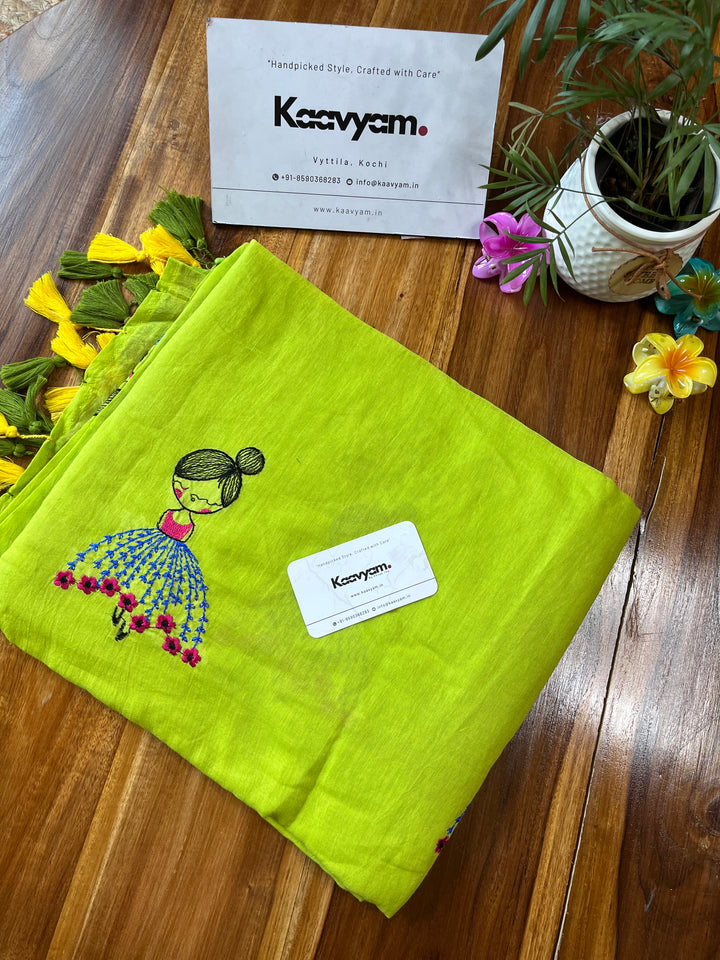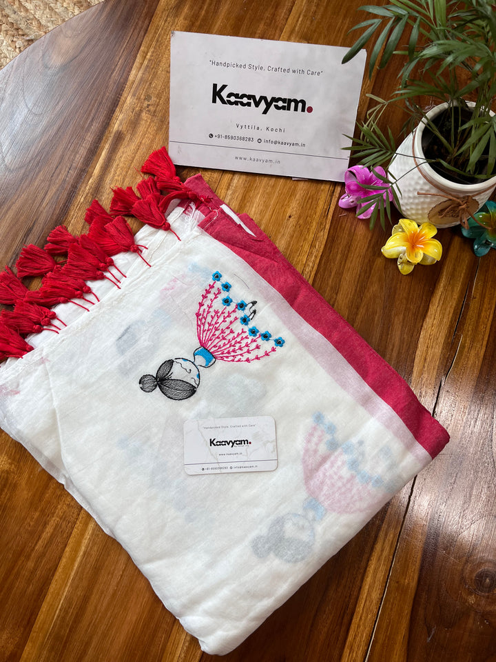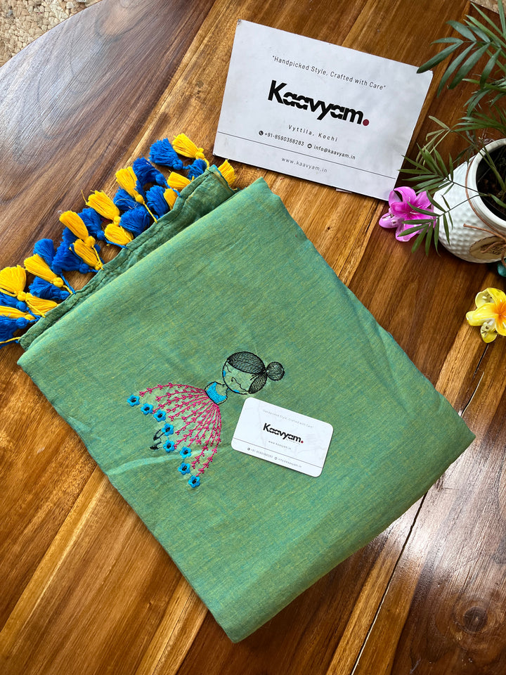 Pure cotton 120 count mul mul plain saree with doll and floral embroidery and half inch contrast border all over the saree ended with handmade tassels on pallu