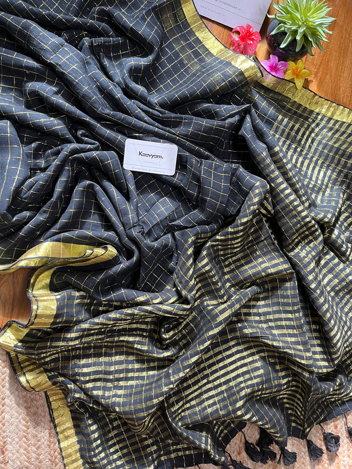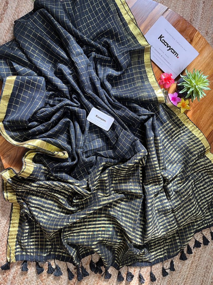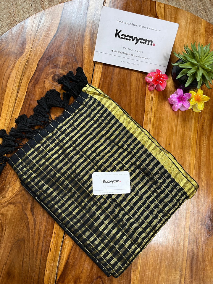 Off white color mul cotton saree golden zari woven checks and thin zari woven border all over the saree ended with handmade tassels on pallu.