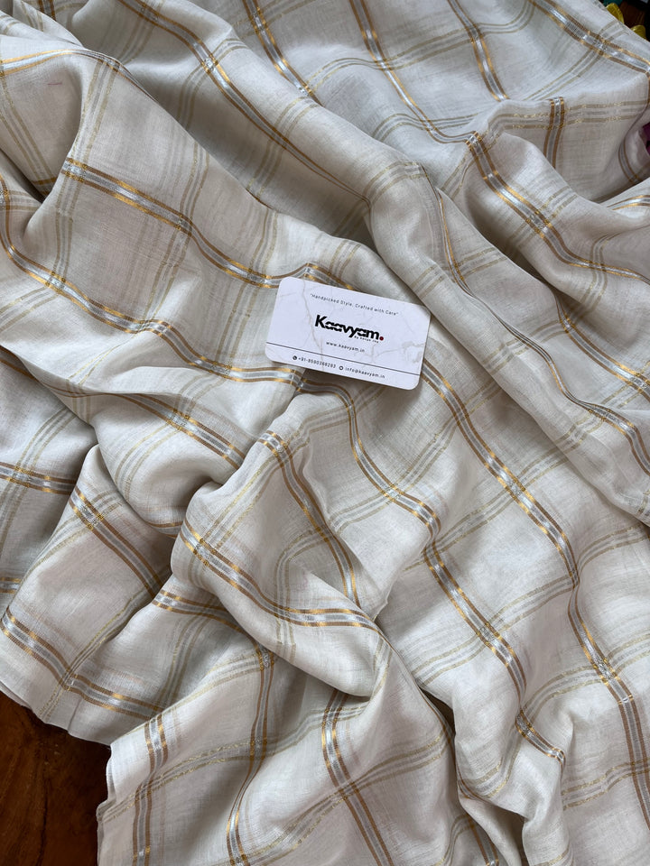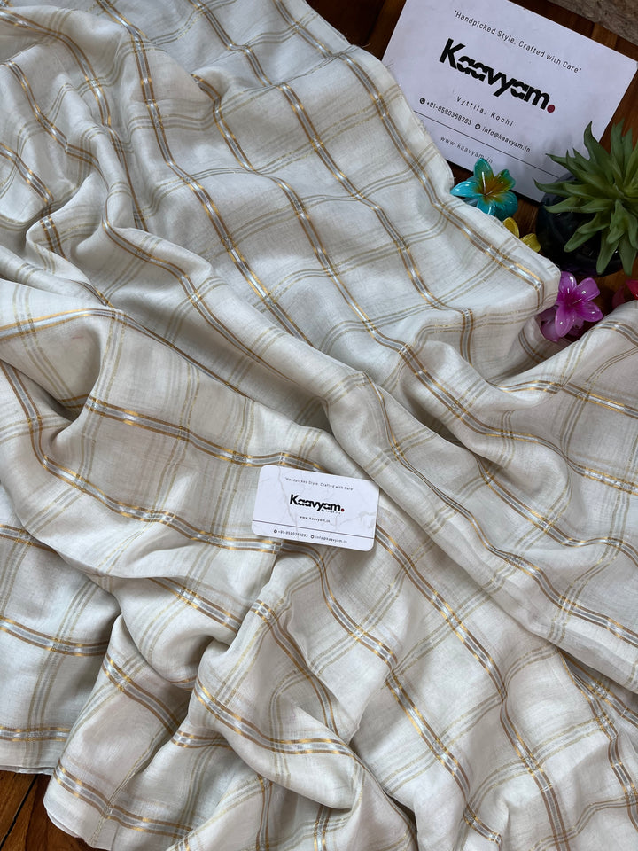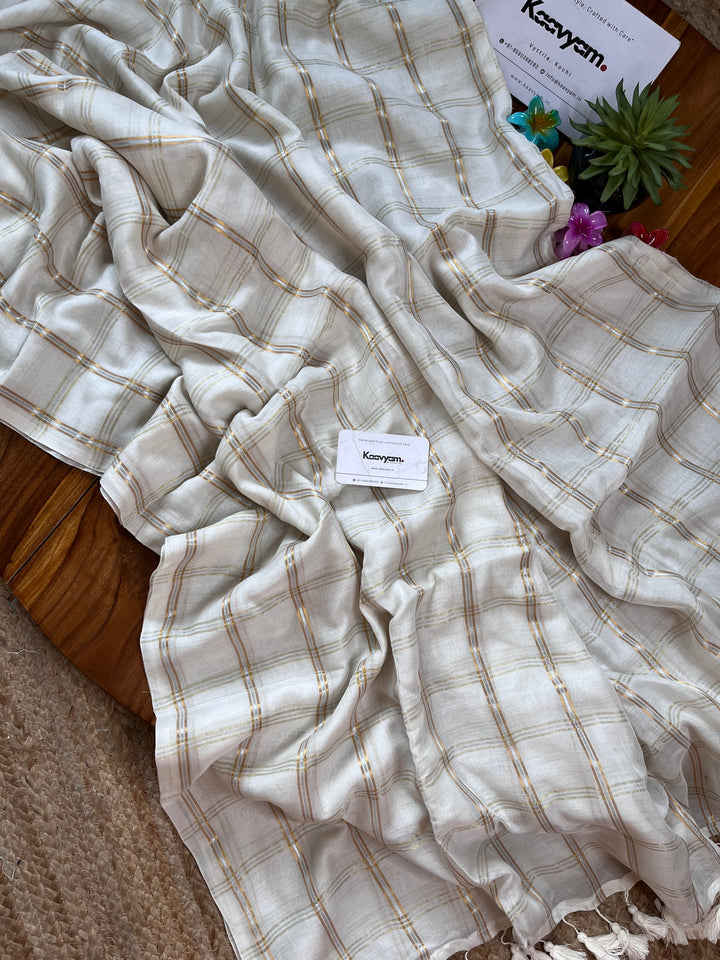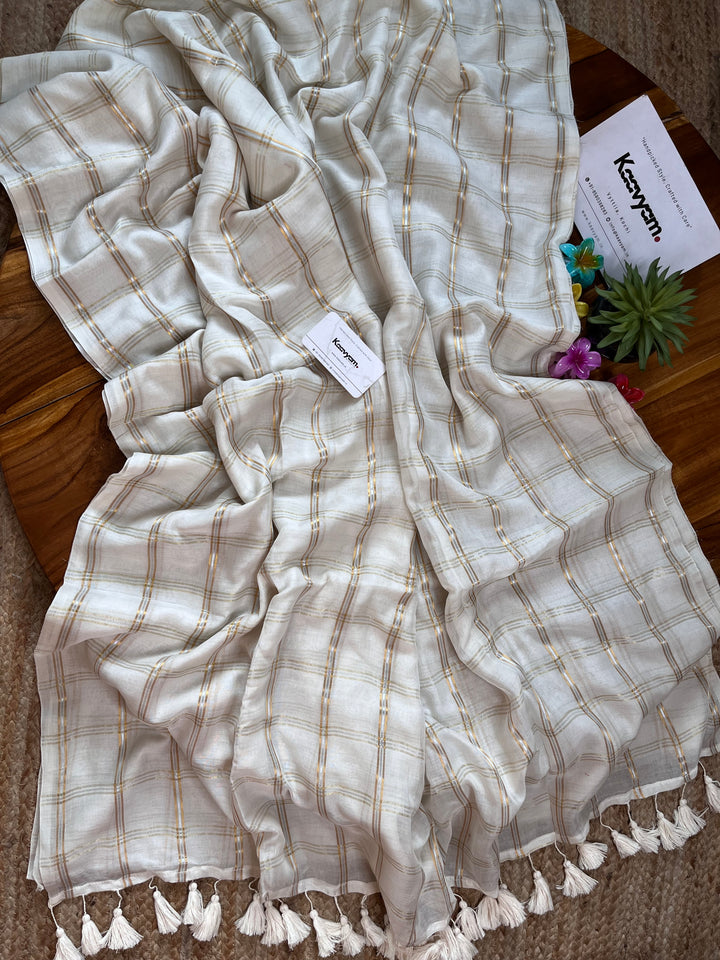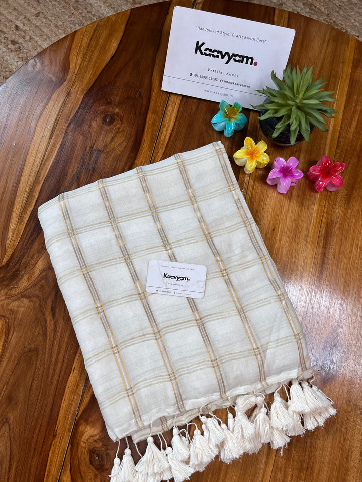 Pure cotton mul mul cotton off white saree with golden jari woven checks all over the saree ended with handmade tassels on pallu