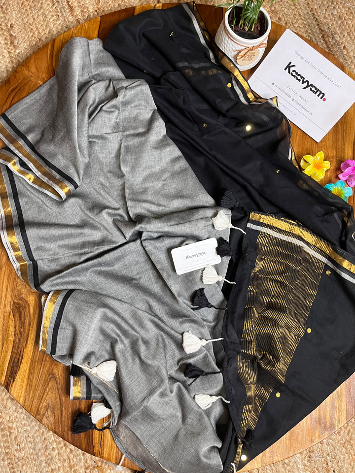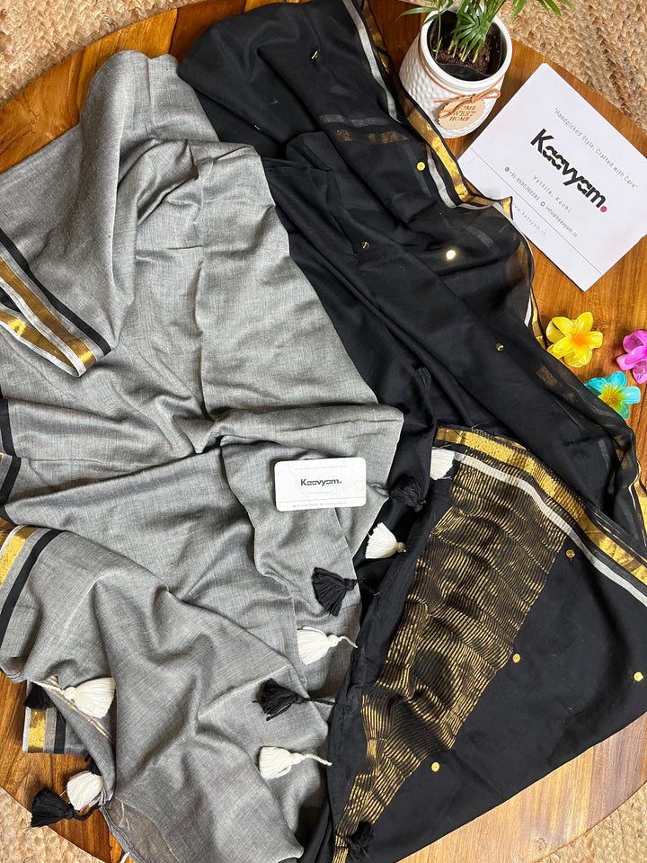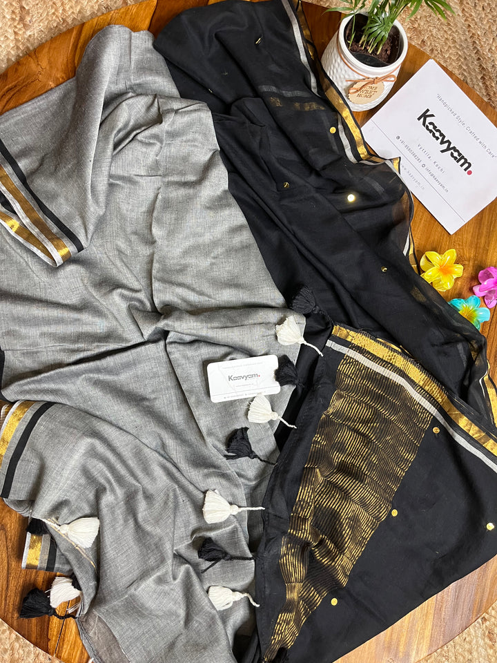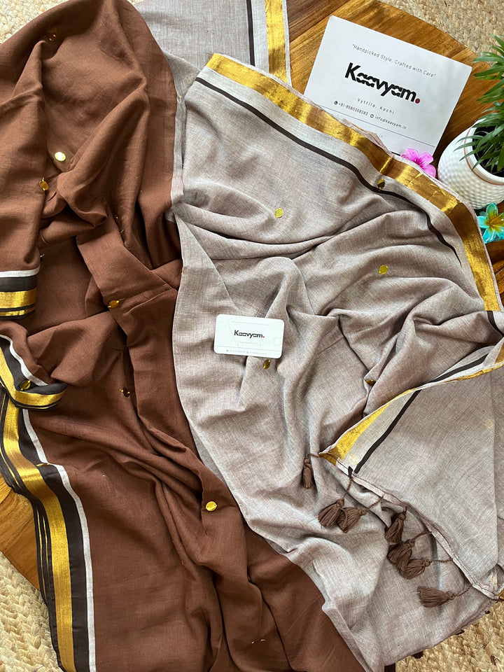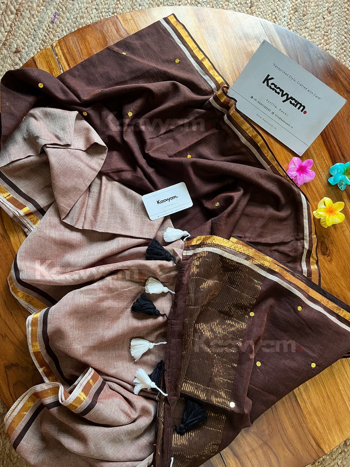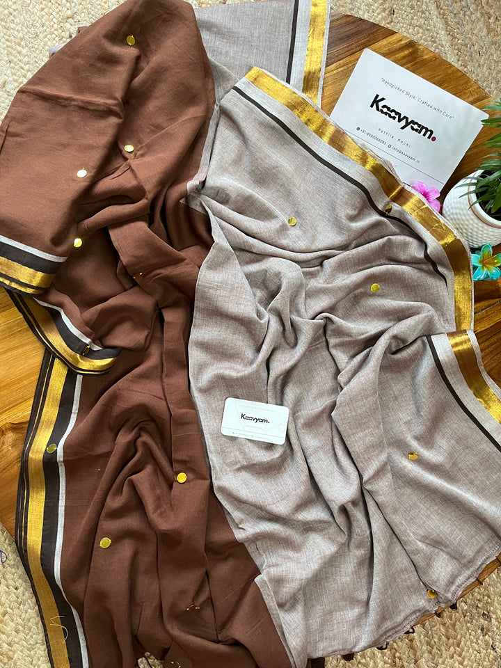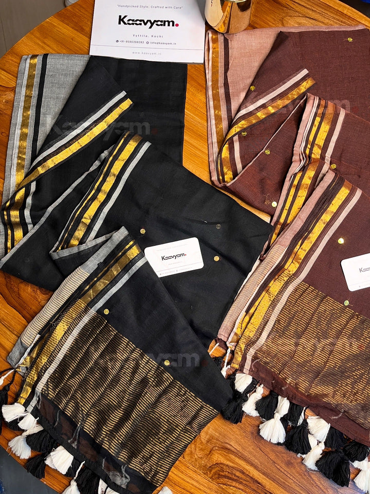 Pure mul cotton saree with half half color combination saree with golden jari woven half inch border and sequins all over the saree ended with handmade tassels
