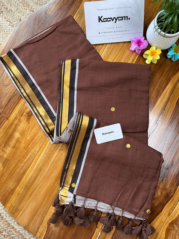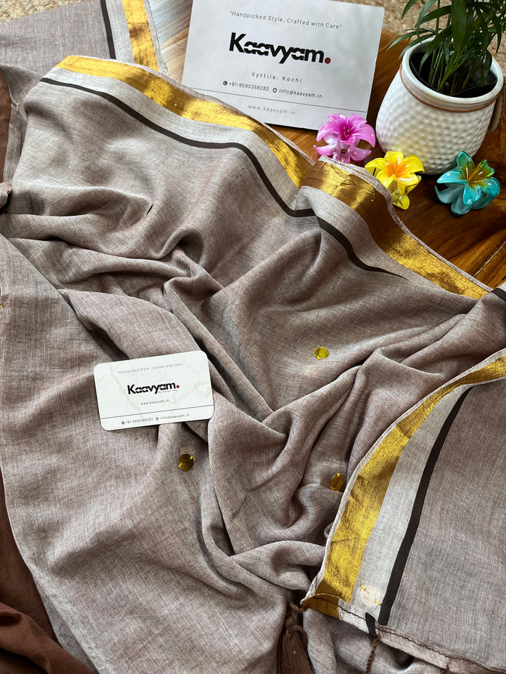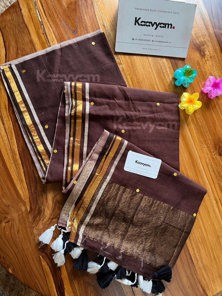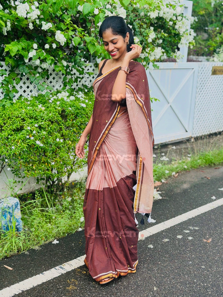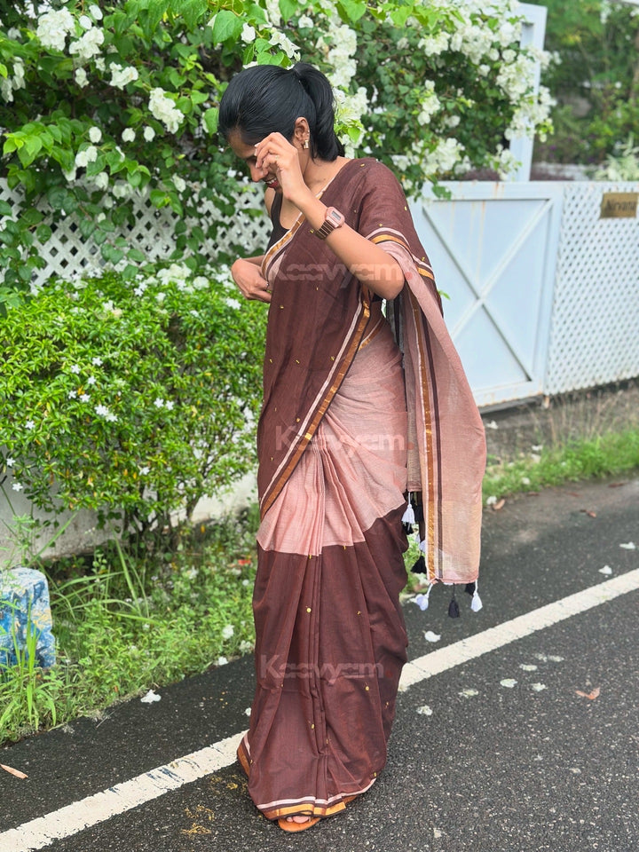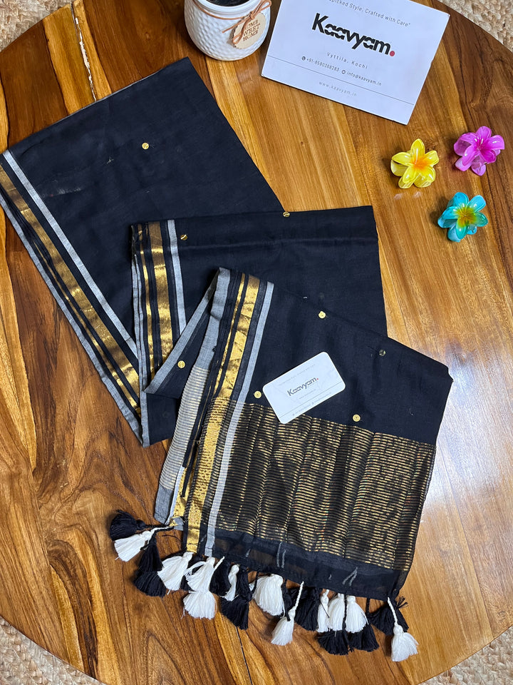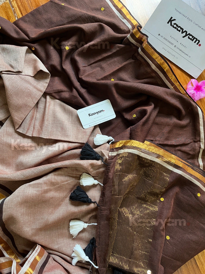 Pure mul cotton saree with half half color combination saree with golden jari woven half inch border and sequins all over the saree ended with handmade tassels