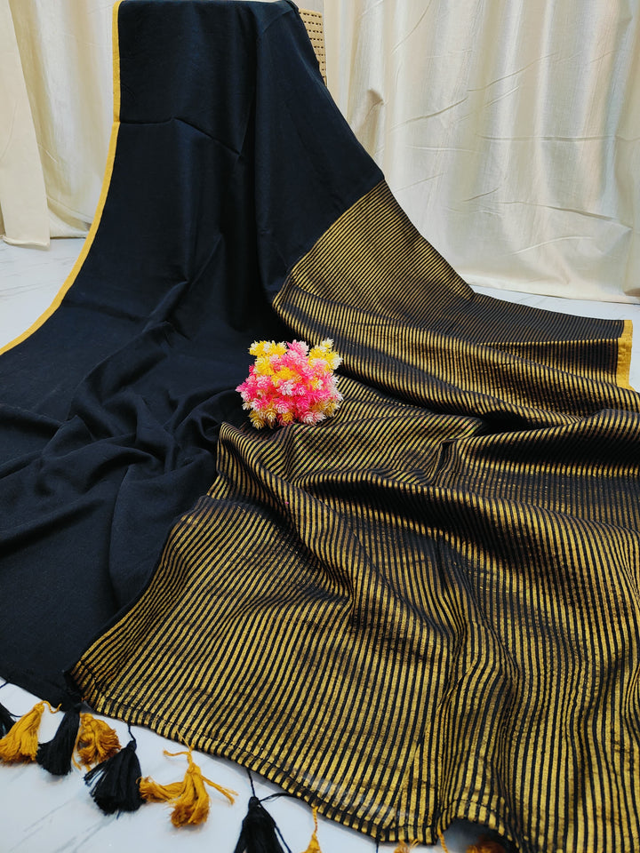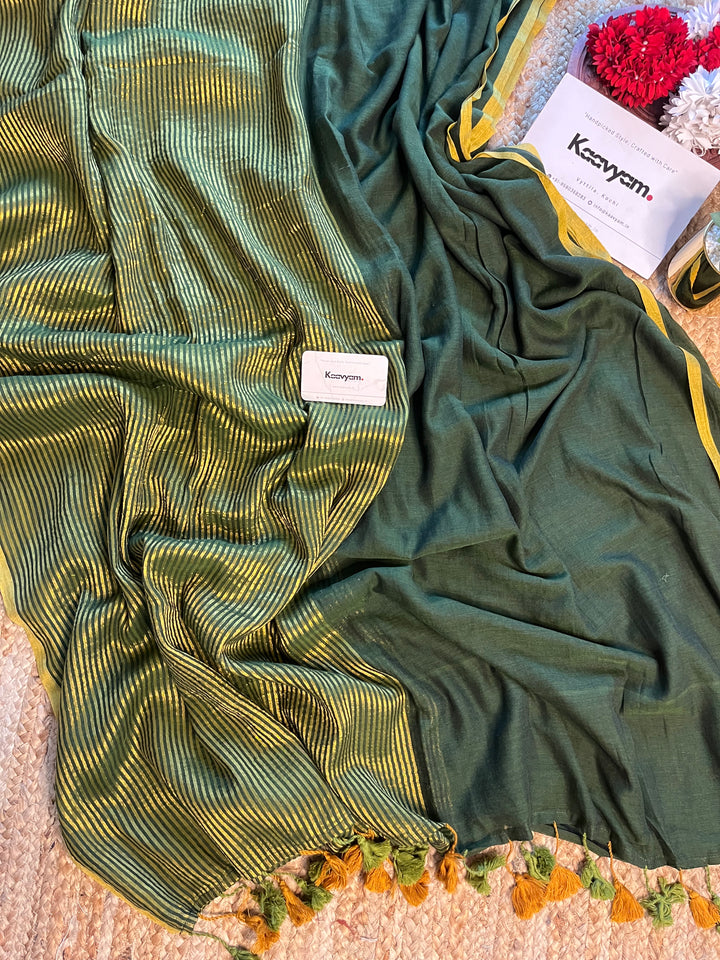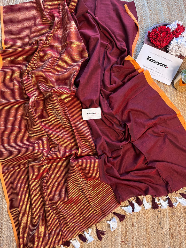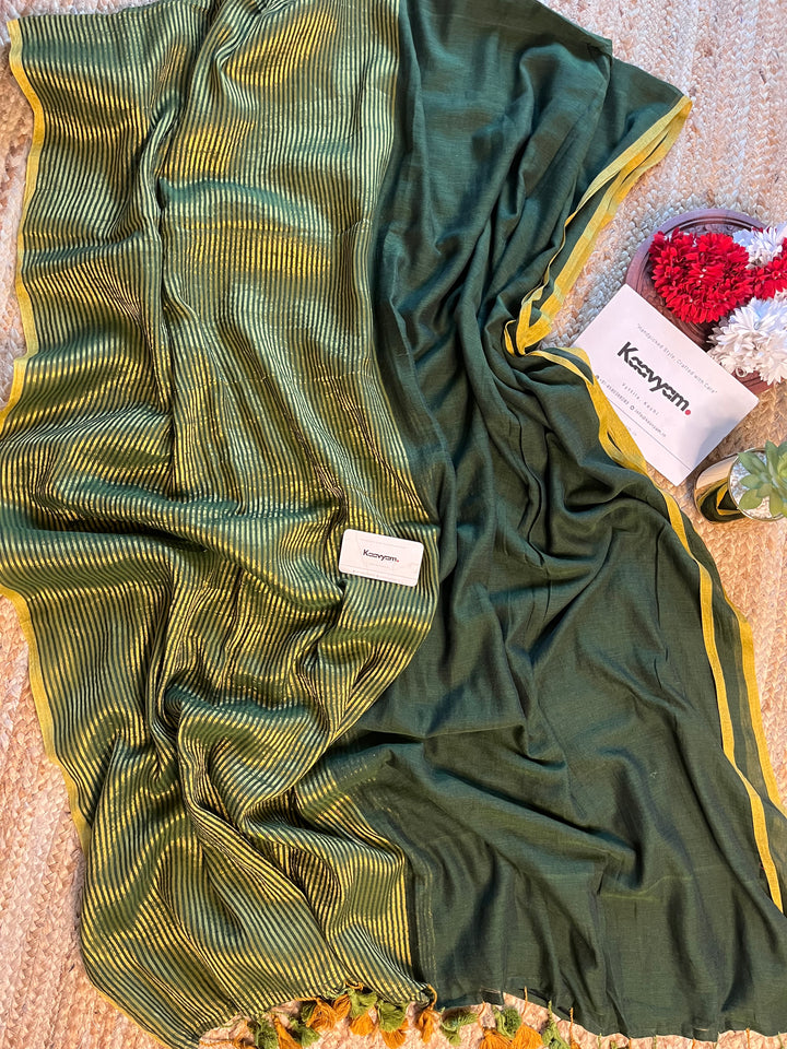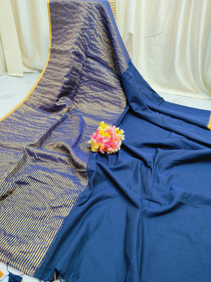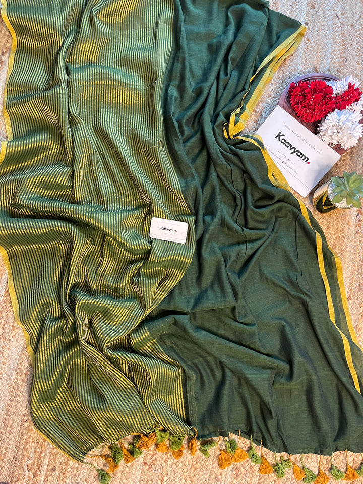 Pure mul cotton saree with half half color combination and golden jari woven woven half border all over the saree ended with handmade tassels on pallu.