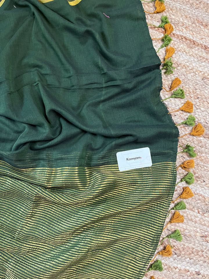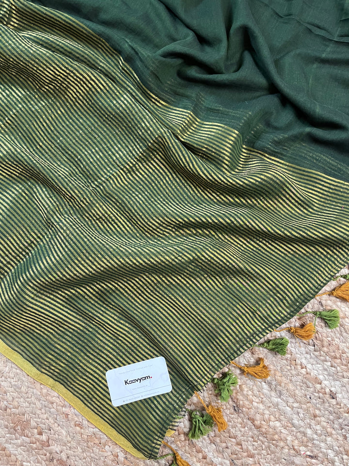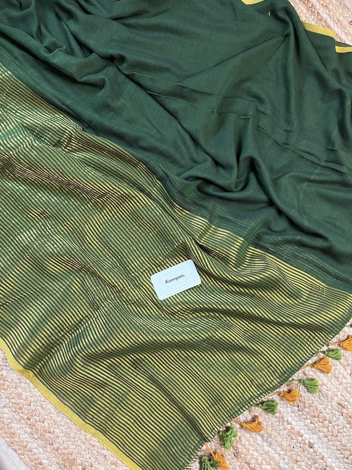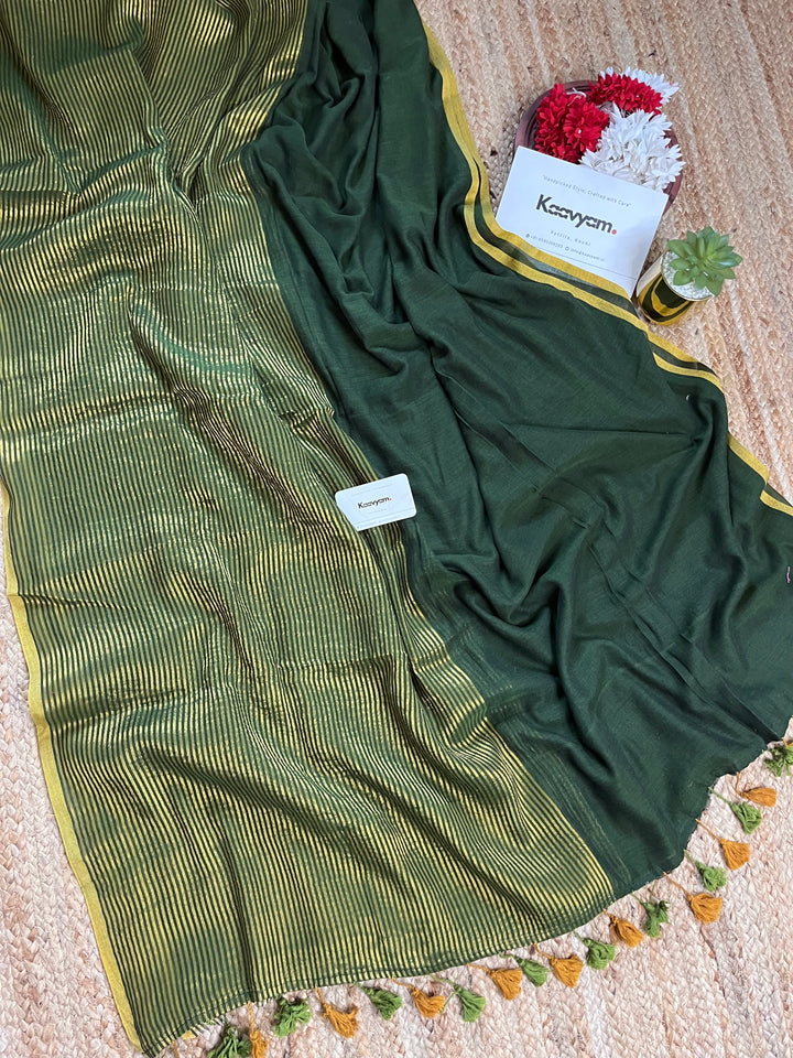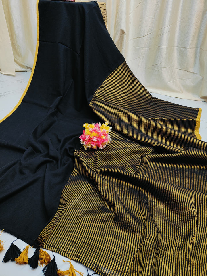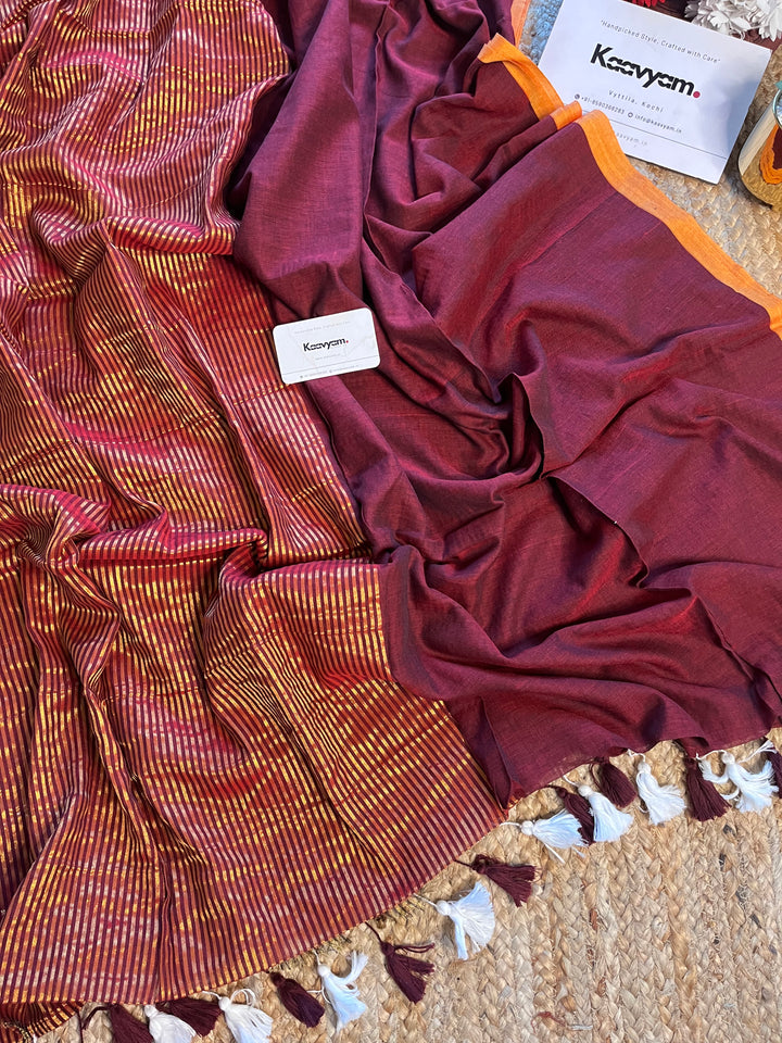 Pure mul cotton saree with half half color combination and golden jari woven woven half border all over the saree ended with handmade tassels on pallu.