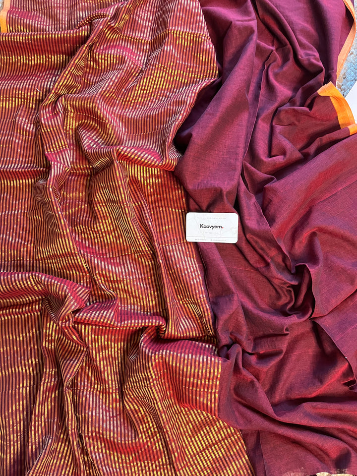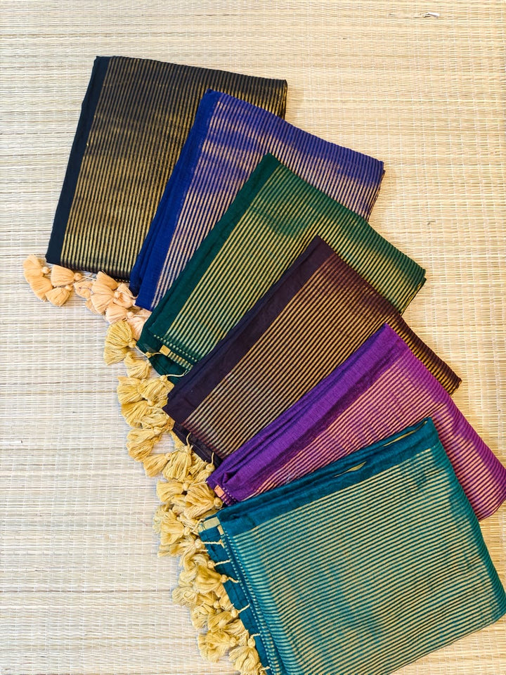 Embrace the beauty of golden zari stripes and vibrant combination of our hallf half Mul cotton sarees!