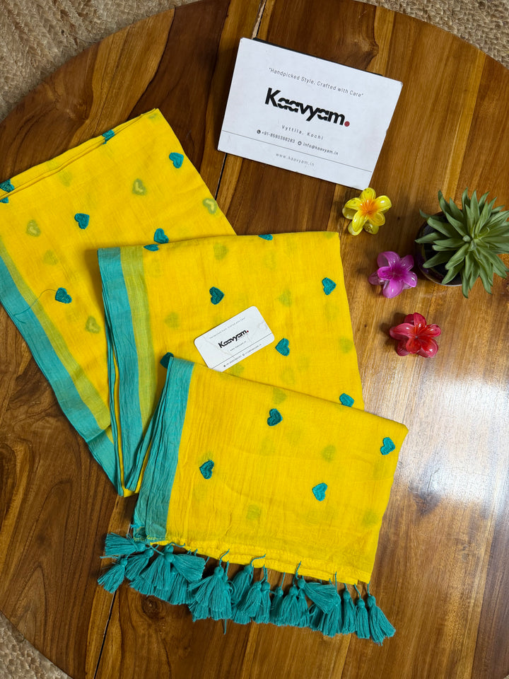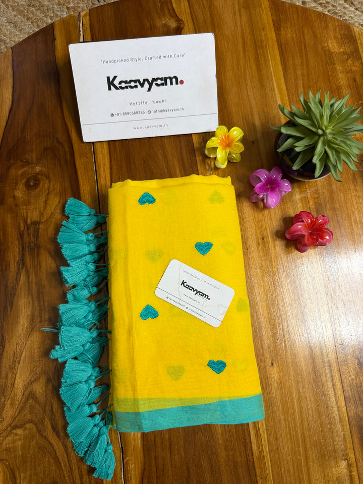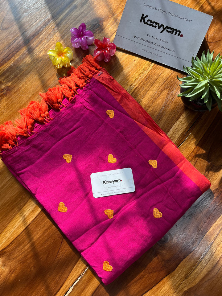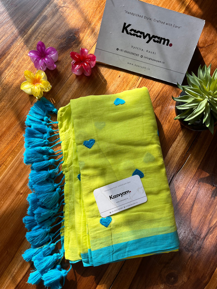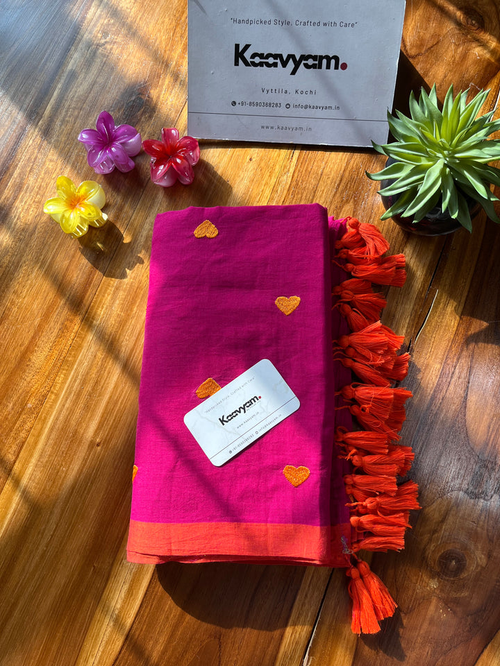 Plain color mul cotton saree with heart embroidery all over the saree ended with handmade tassels