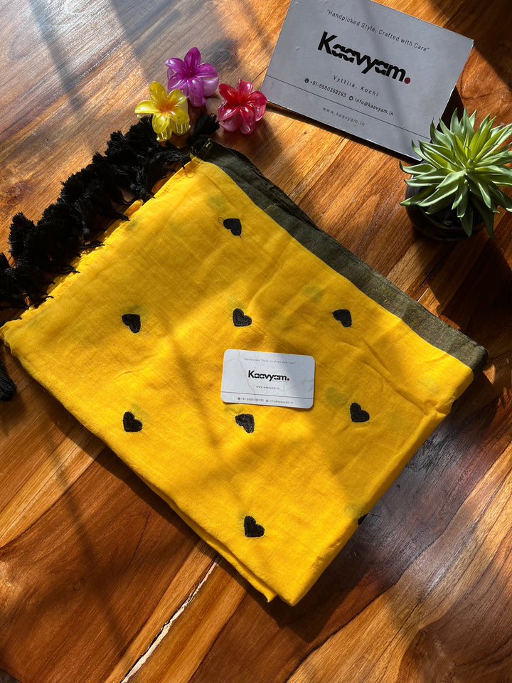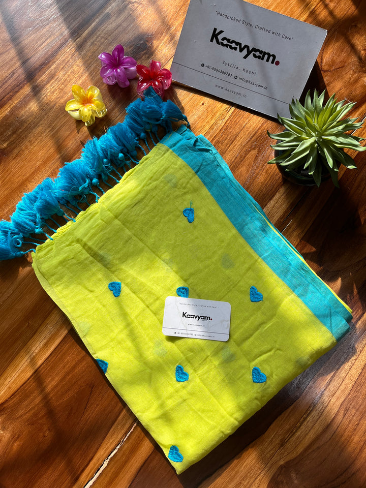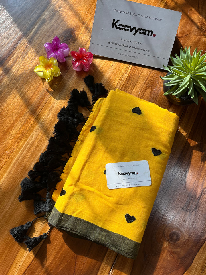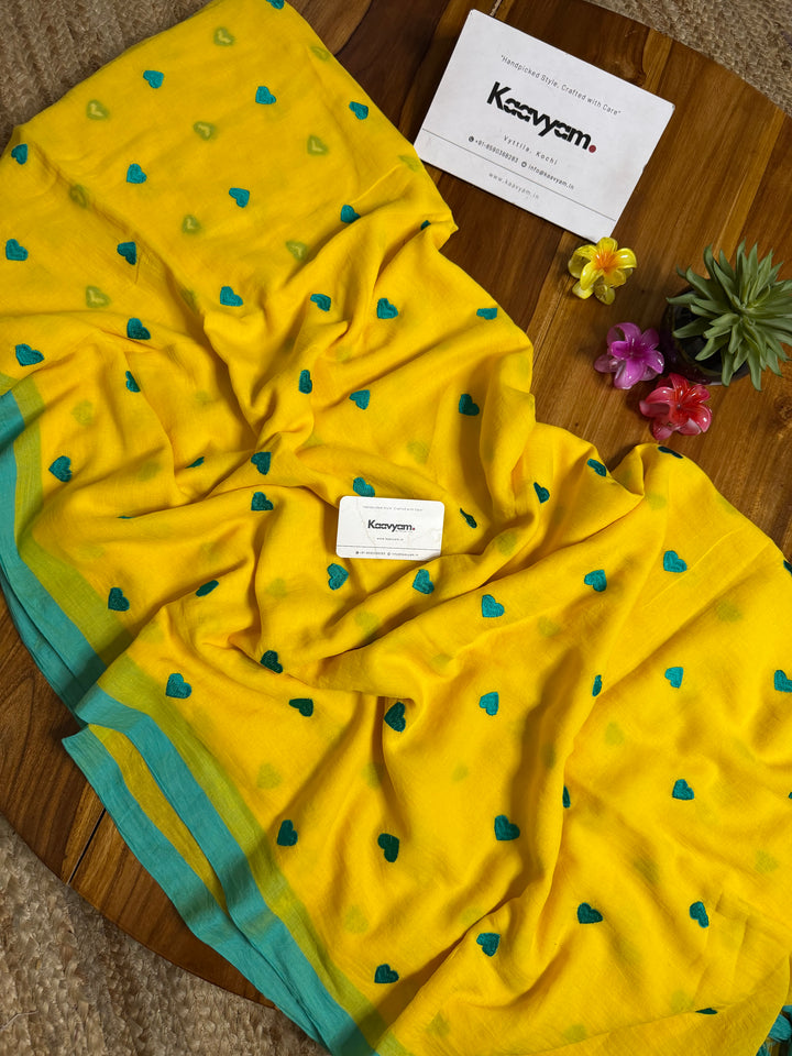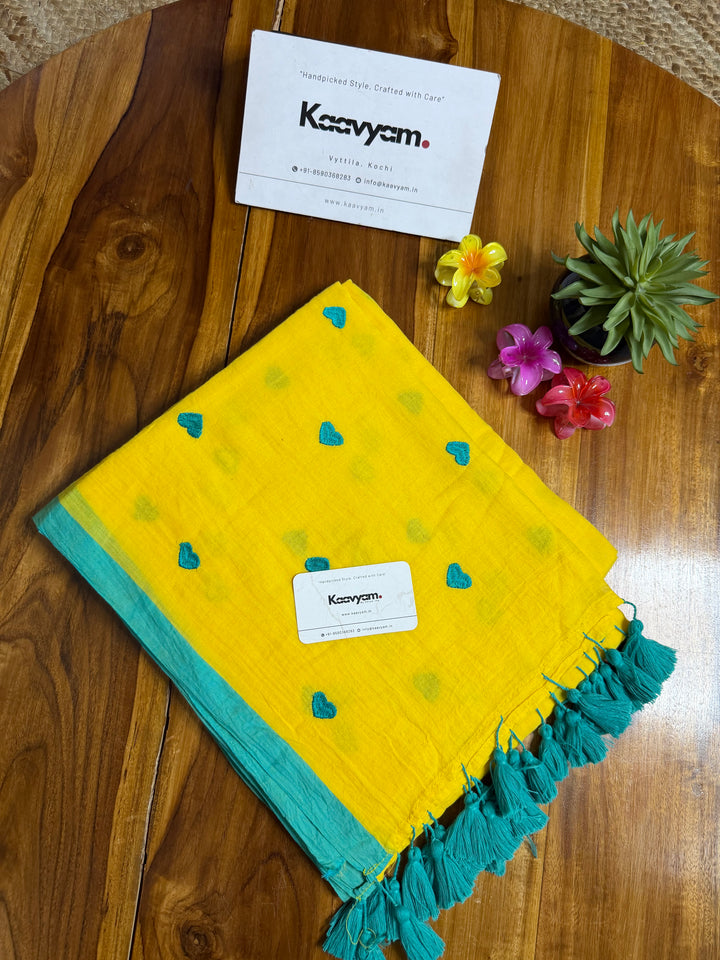Plain color mul cotton saree with heart embroidery all over the saree ended with handmade tassels