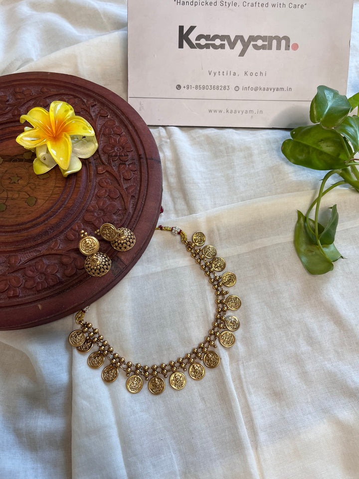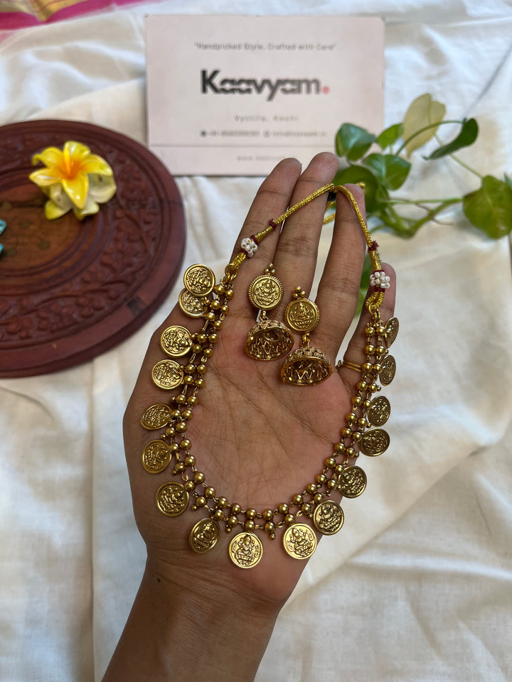 Authentic Kaasu Necklace & Jumukka set crafted with meticulous attention to traditional South Indian design principles. This temple jewelry features precisely arranged gold-plated coins symbolizing prosperity and heritage.