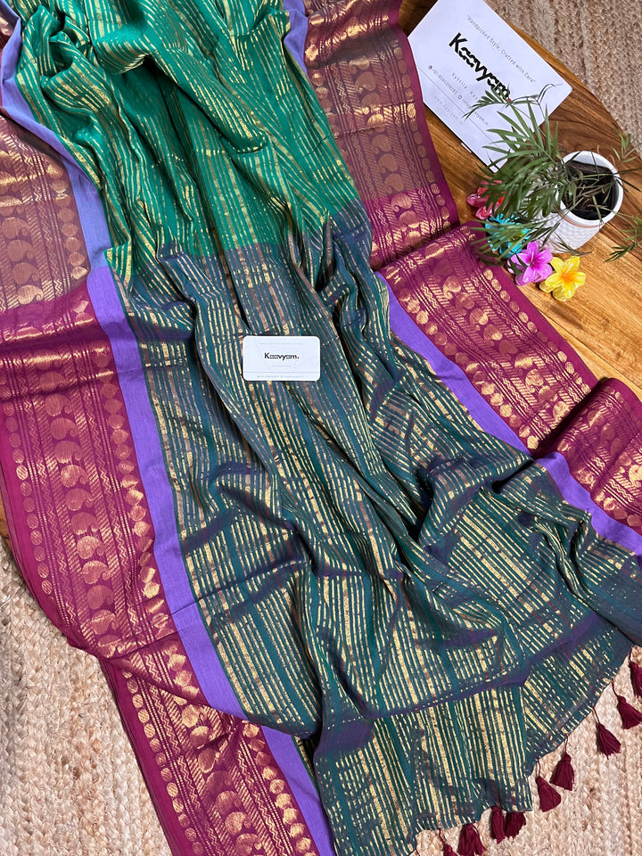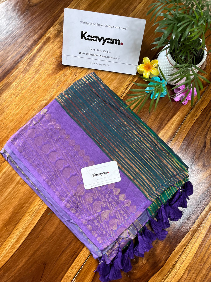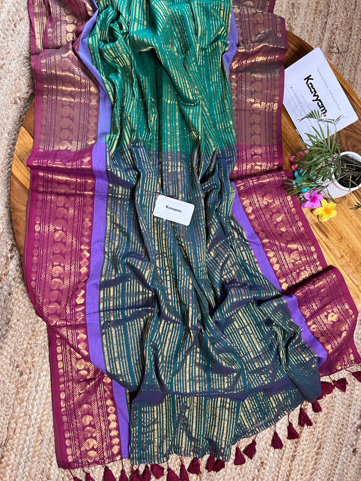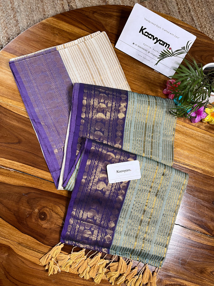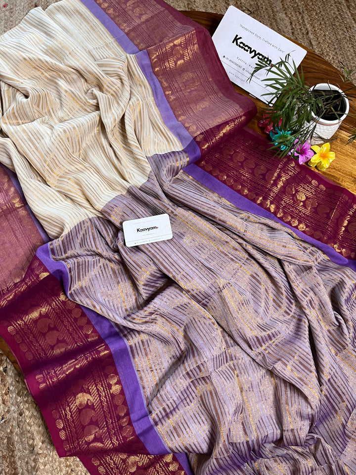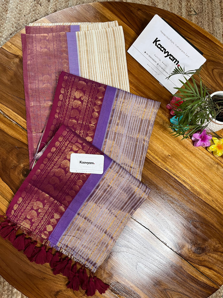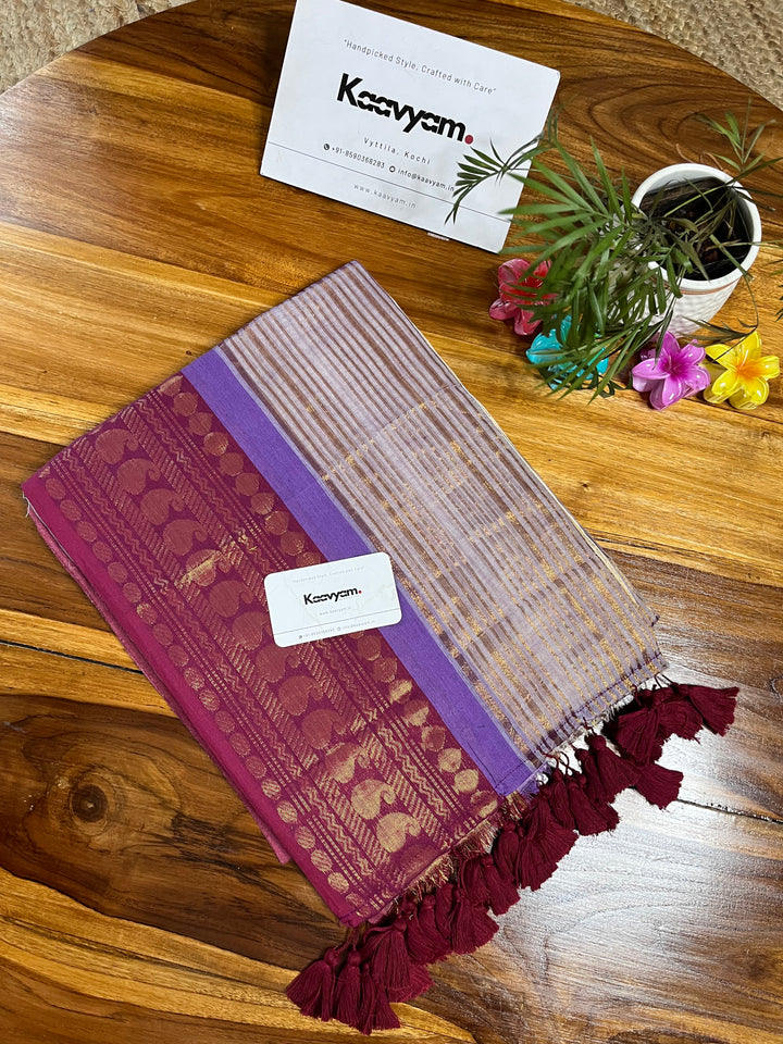 Light weight breathable mul cotton saree with stripes body and contrast mango motif handwoven border all over the saree with contrast pallu finished with tassels