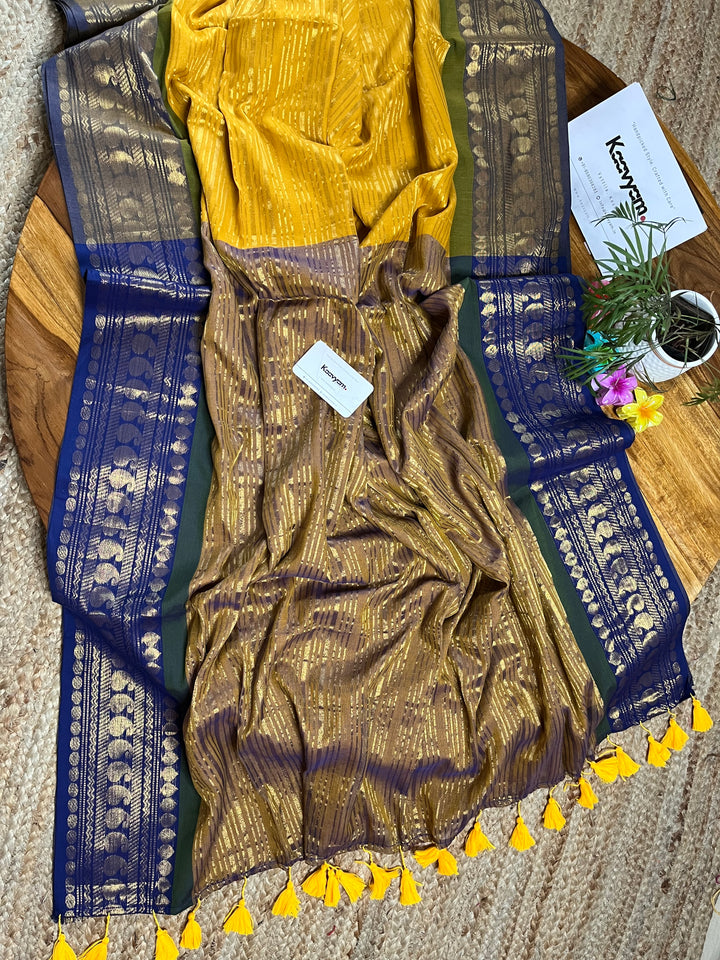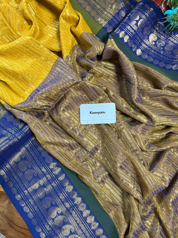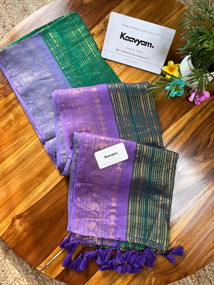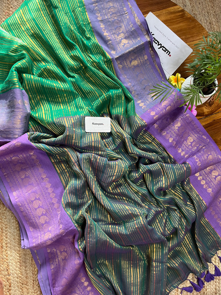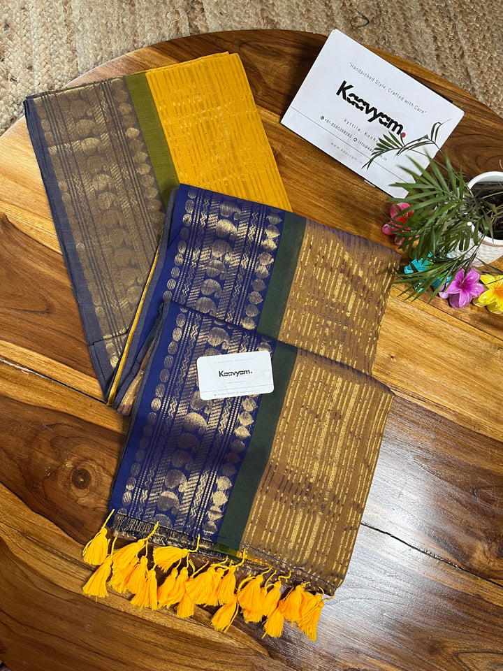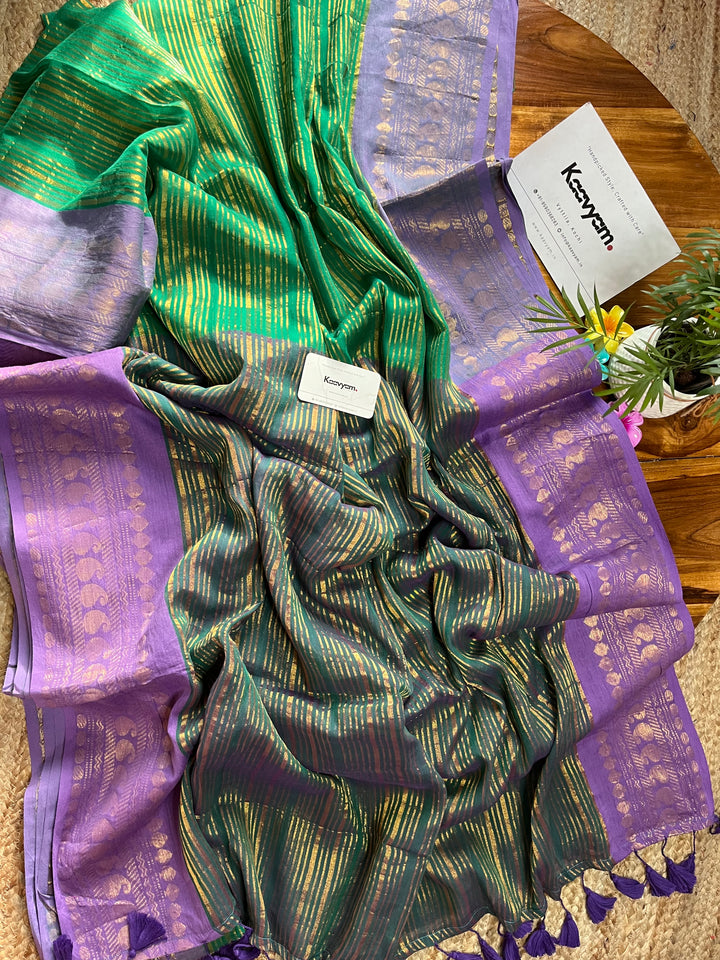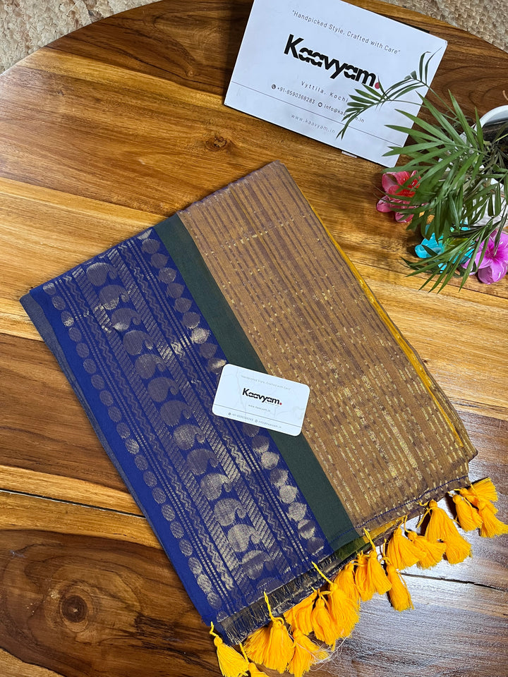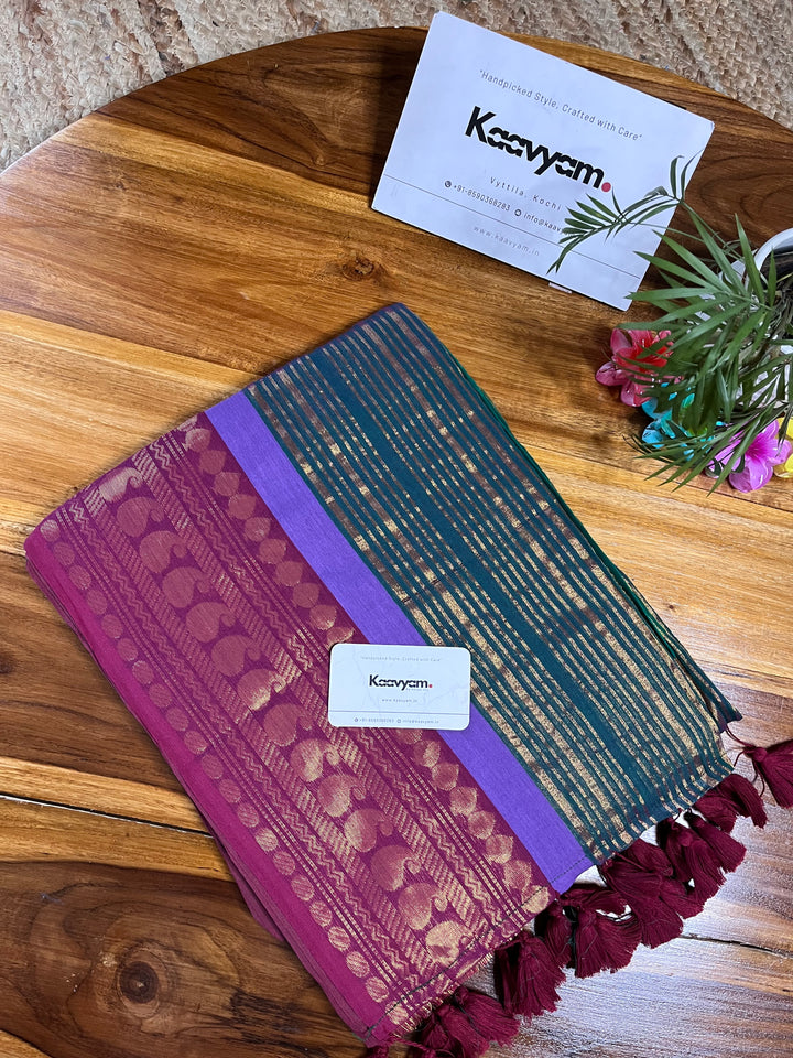 Light weight breathable mul cotton saree with stripes body and contrast mango motif handwoven border all over the saree with contrast pallu finished with tassels