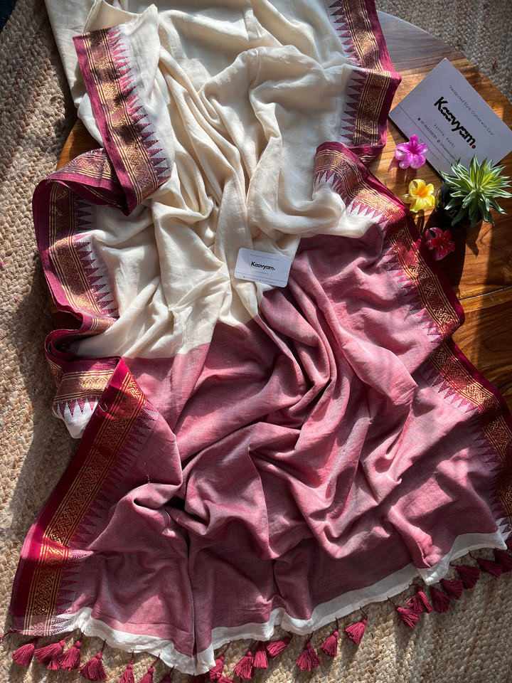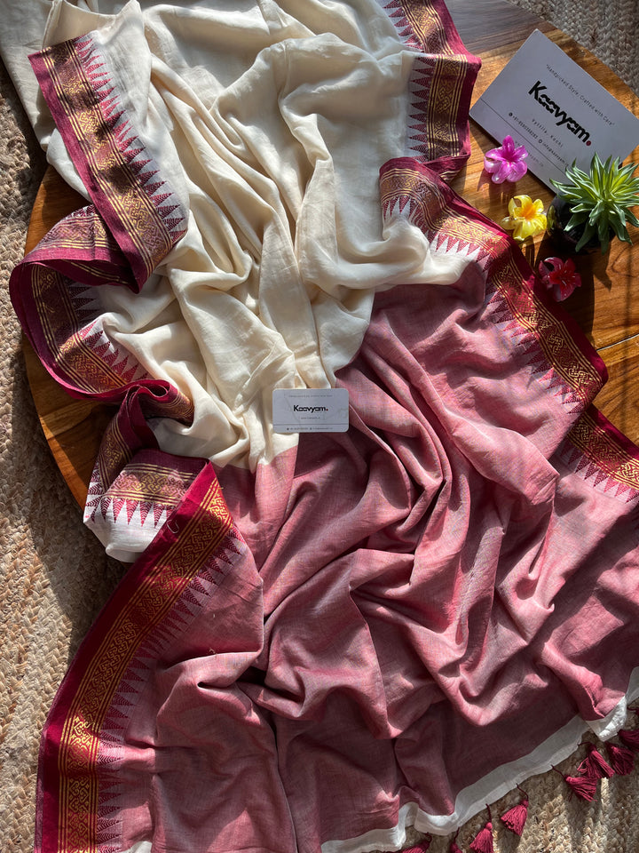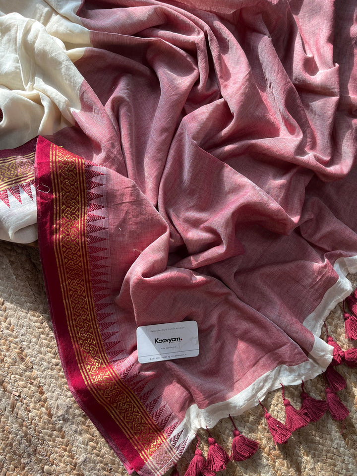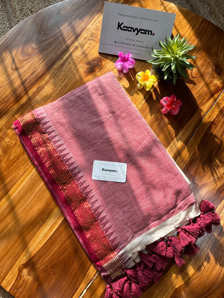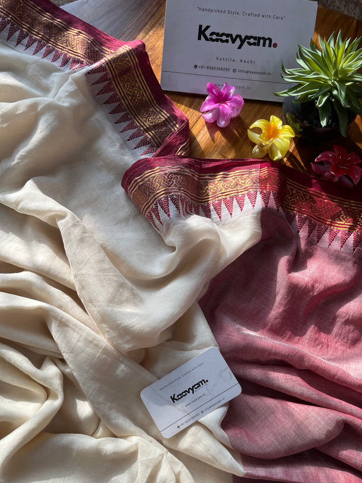 Plain mul modal saree with golden zari and maroon contrast woven jacquard thin border all over the saree finished with contrast pallu with handmade tassels.