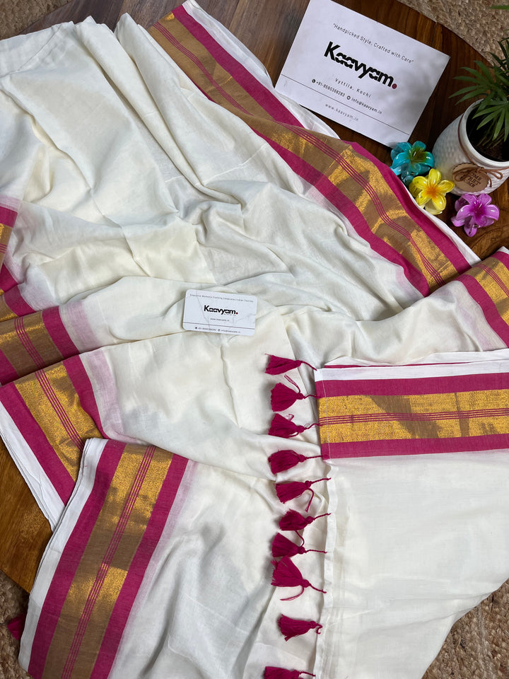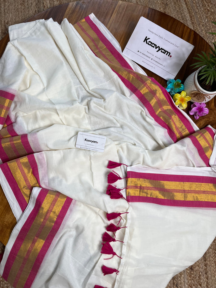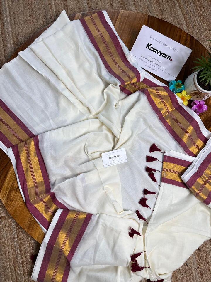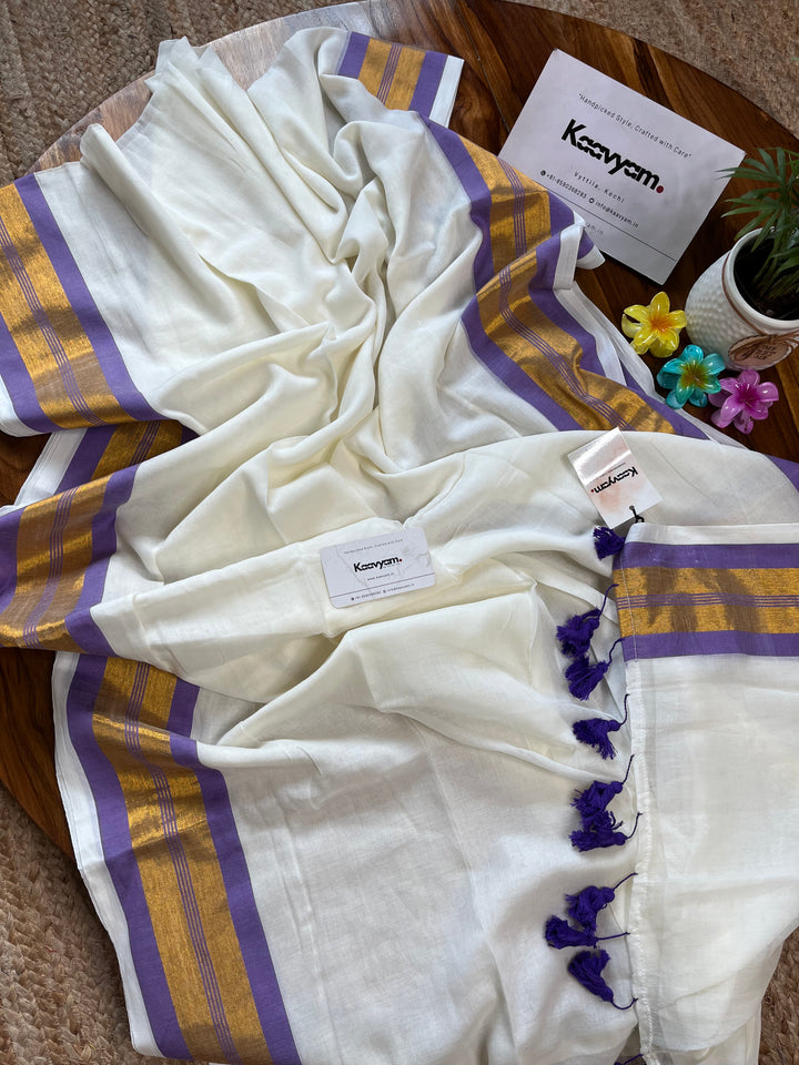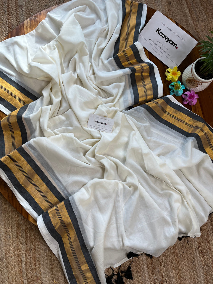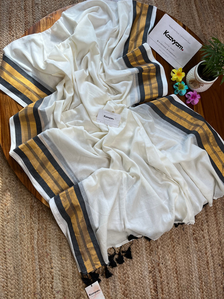Pure cotton mul mul plain saree with kasav & kara border all over the saree ended with handmade tassels on pallu